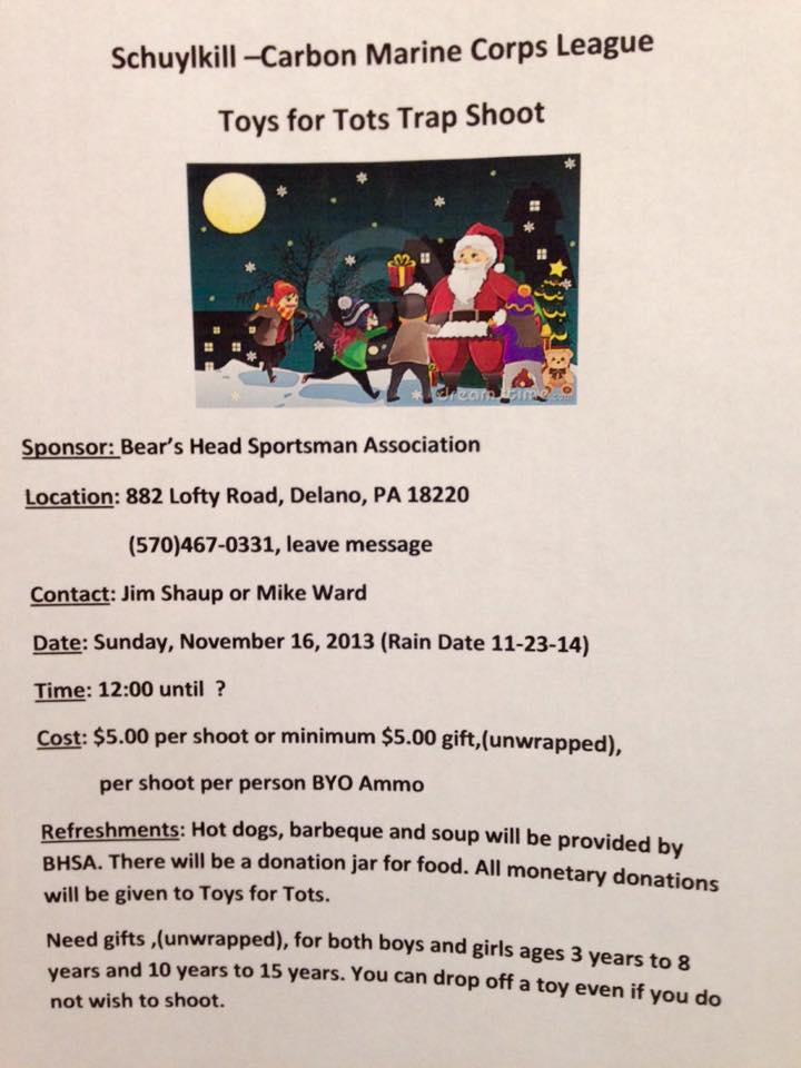 All toys and monetary donations will benefit the Schuylkill Carbon Marine Corps League’s Toys For Tots Campaign.