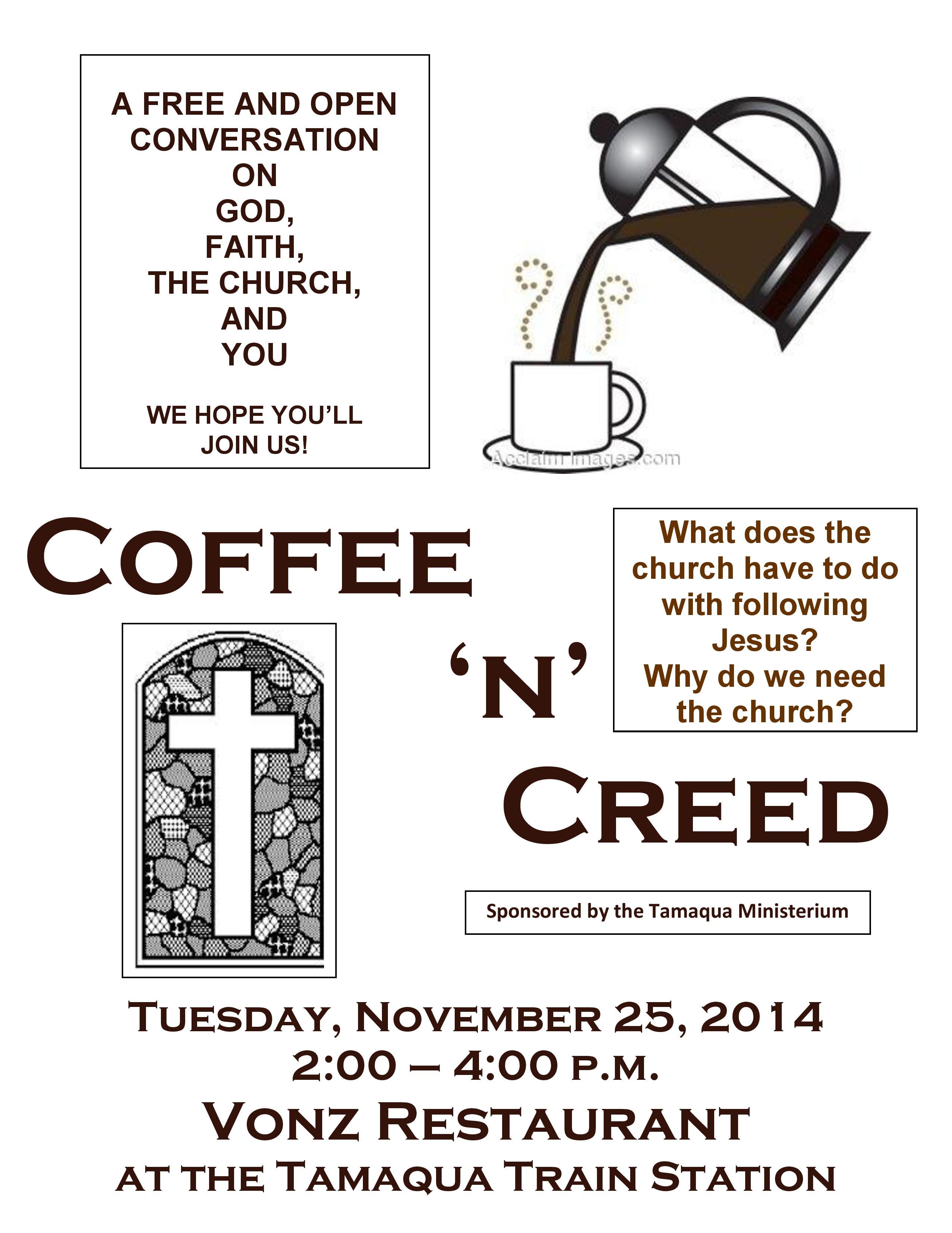 Members of the Tamaqua Ministerium are holding a Coffee ‘N Creed on Tuesday, November 25, 2014 at Vonz Restaurant in the Tamaqua Train Station from 2 PM to 4 PM.