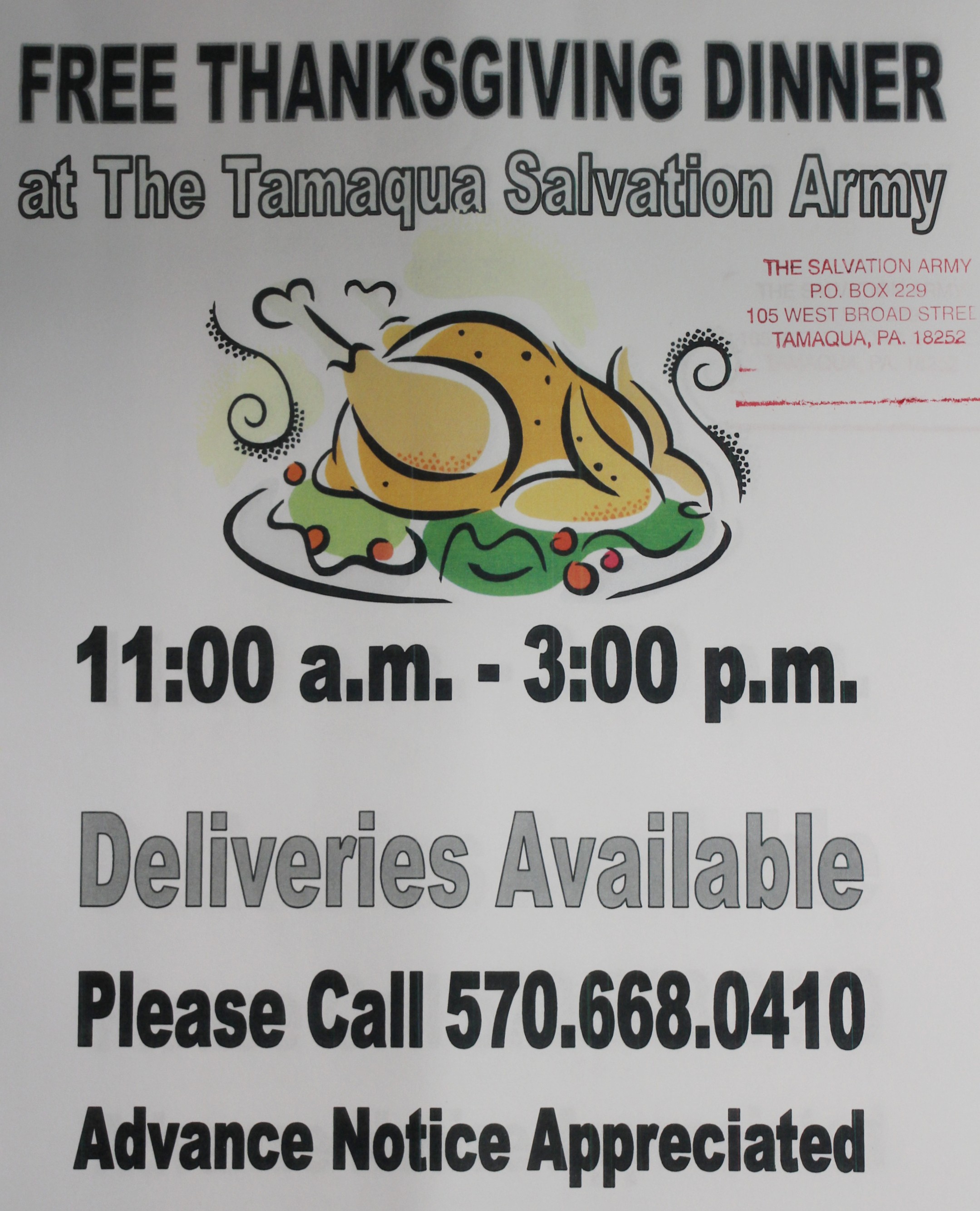 Members and volunteers of the Tamaqua Salvation Army are holding a free Community Thanksgiving Dinner on Thursday, November 27, 2014 (Thanksgiving Day) from 11 AM to 3 PM.