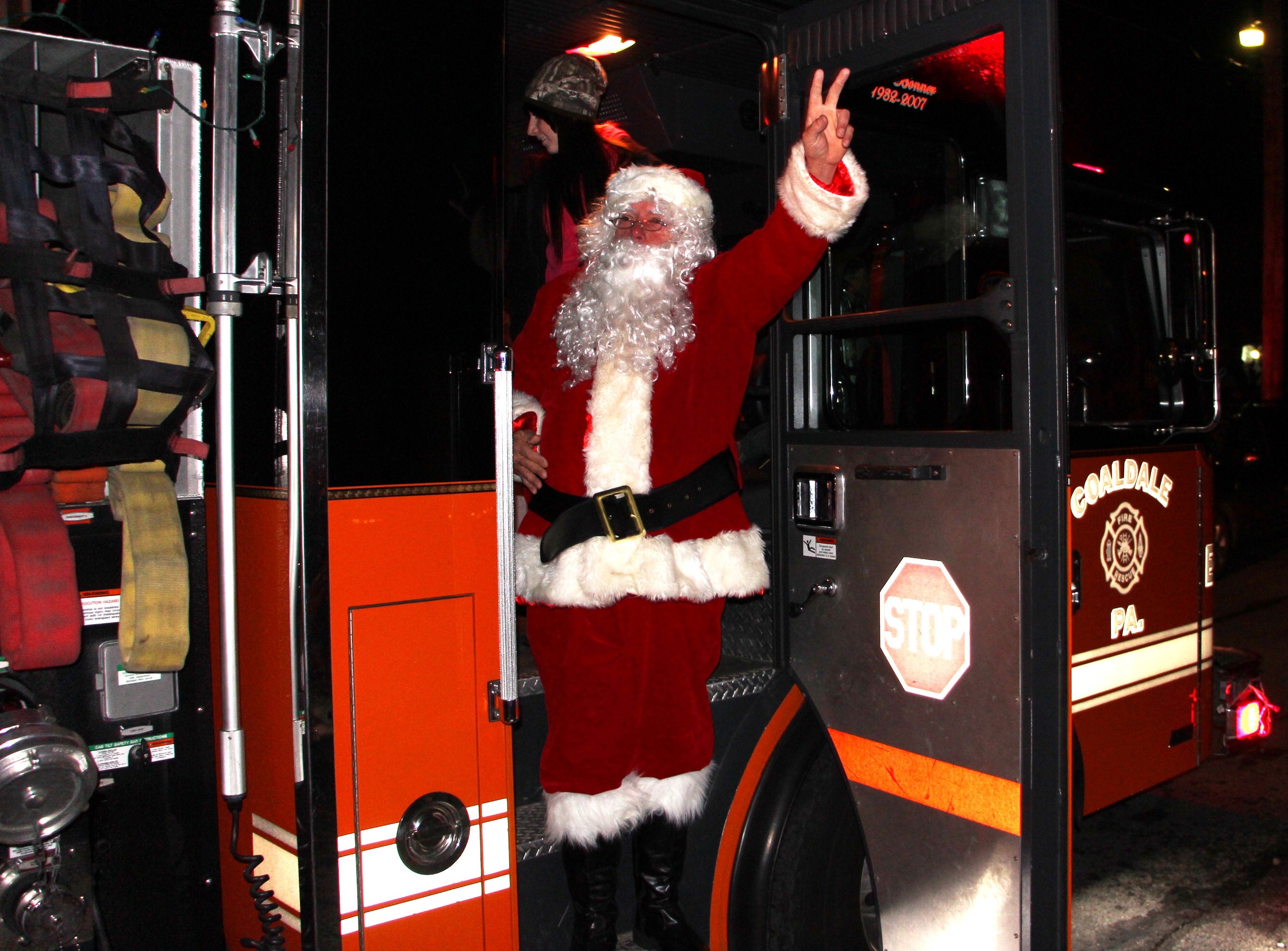 Santa Claus arrived yesterday evening (Sunday, November 30, 2014) by decorated fire truck during Coaldale’s Annual Tree Lighting program held in front of the Coaldale Borough Hall.