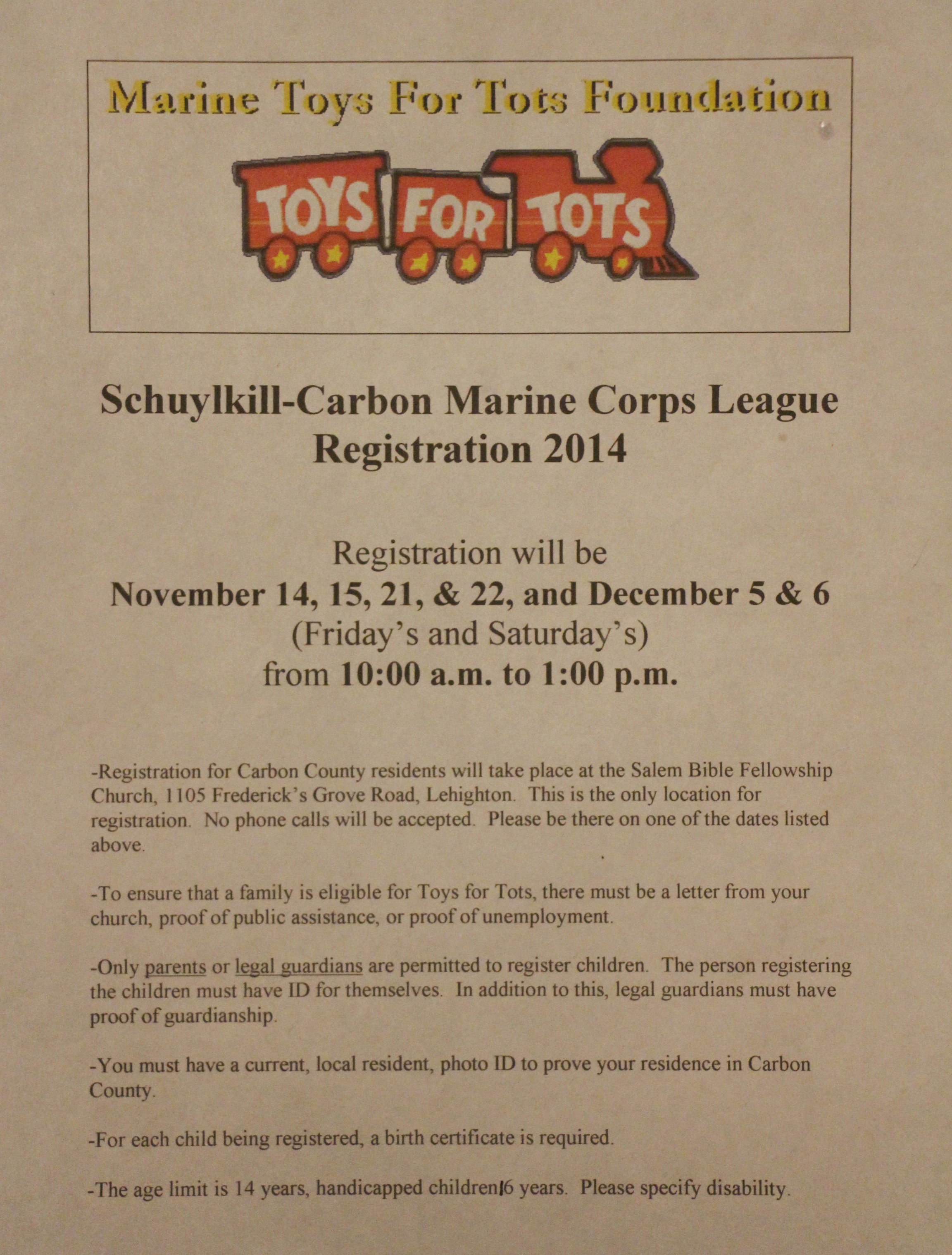Reminder that this Friday (Dec. 5, 2014) and Saturday (Dec. 6, 2014) are the last days to register for the Schuylkill Carbon Marine Corps League’s Toys For Tots program.