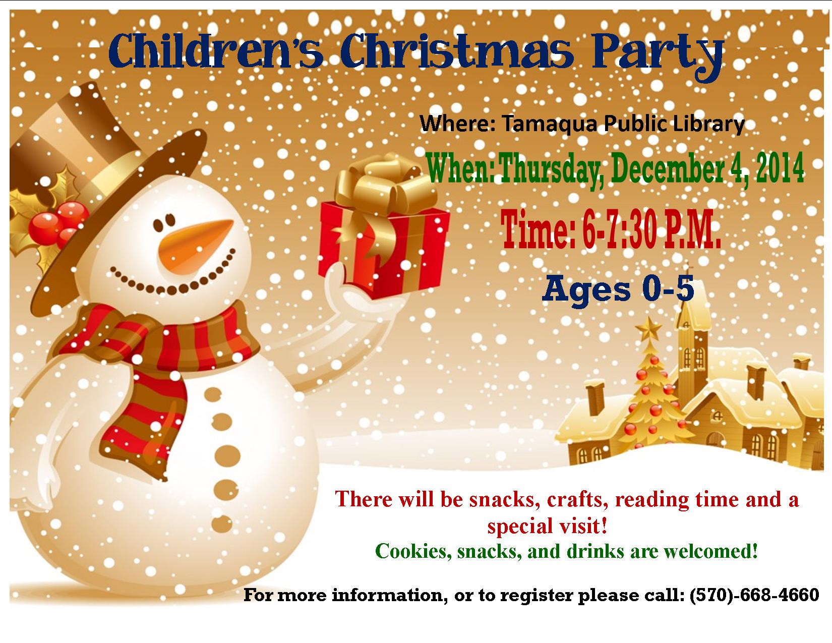 The Tamaqua Public Library is holding a Children’s Christmas Party for children ages 0 to 5 in Thursday, December 4, 2014 from 6 PM to 7:30 PM.