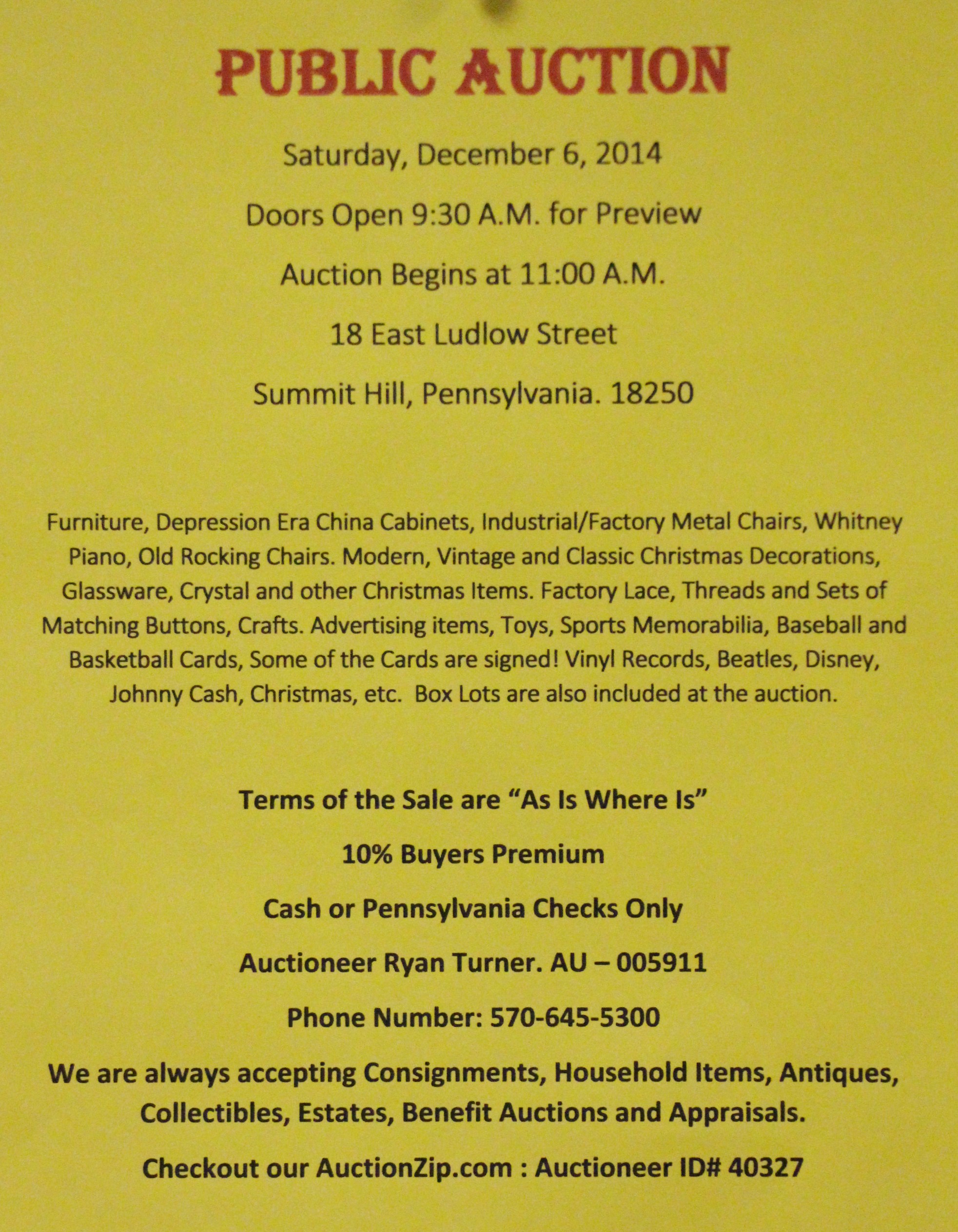 Auctioneer Ryan Turner is holding a public auction at 18 East Ludlow Street in Summit Hill on Saturday, December 6, 2014 beginning at 11 AM. Doors open at 9:30 AM for preview.