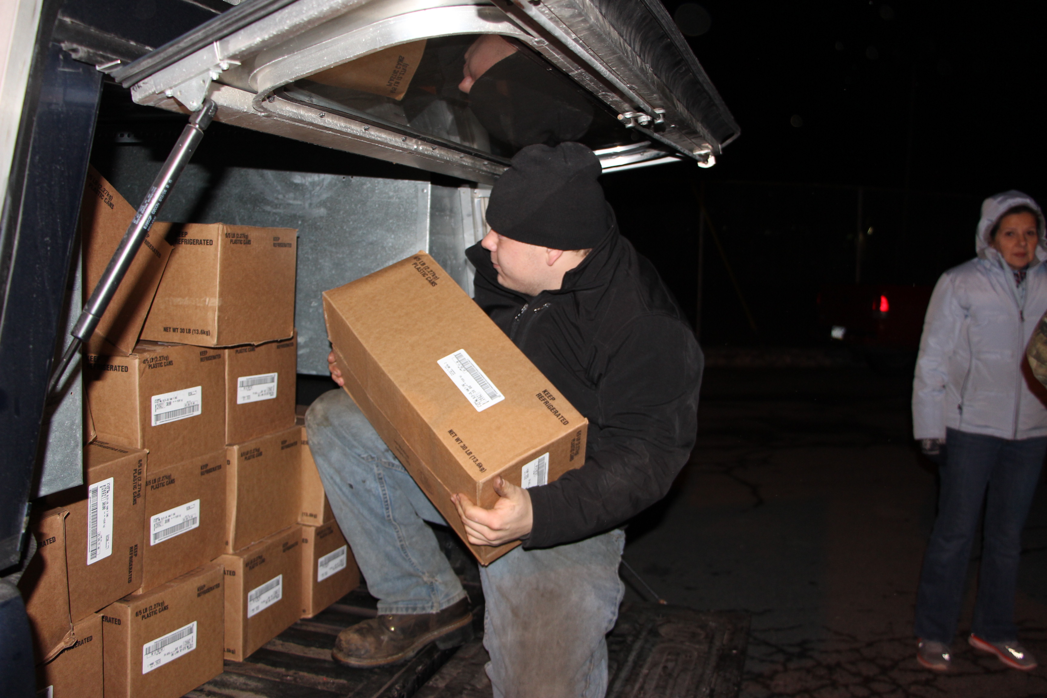 Community volunteers helping load hams at 6 AM Saturday morning (December 13, 2014) in Tamaqua were Joe Franko of Tamaqua, Cy Leonard of Lansford, and Donald Knoblauch of Tamaqua.