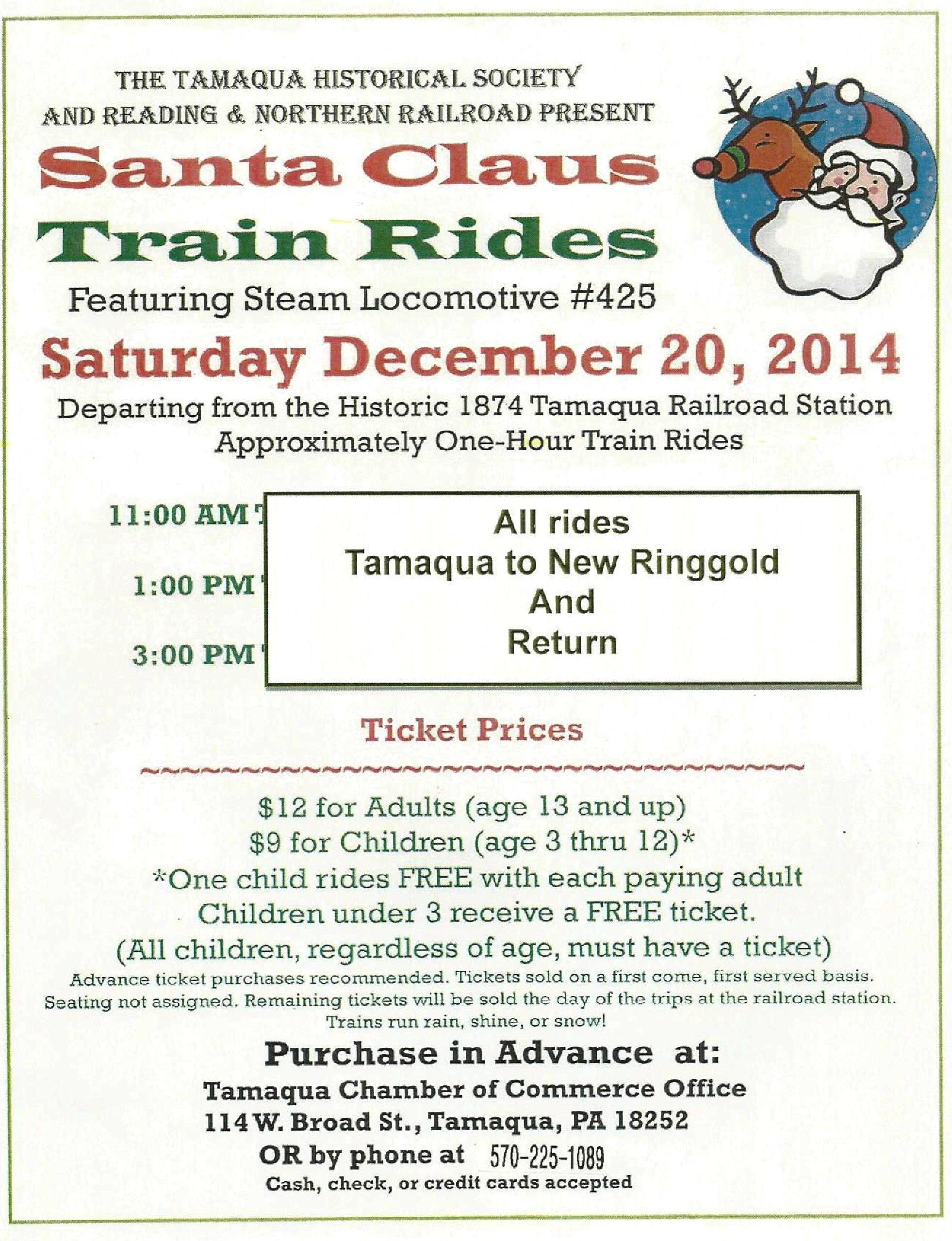 There are only a few 3 PM seats left for Saturday’s Santa Train Rides in Tamaqua. Must stop by and pay for ticket(s) the day of the ride (Saturday, December 20, 2014) at the train station. First come, first serve.