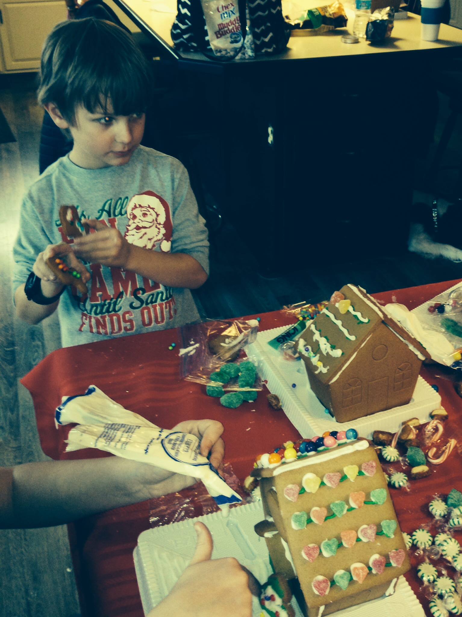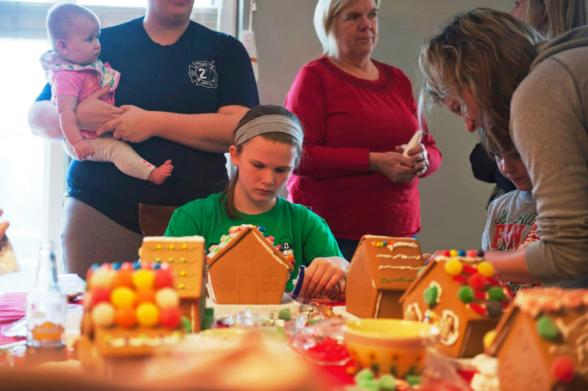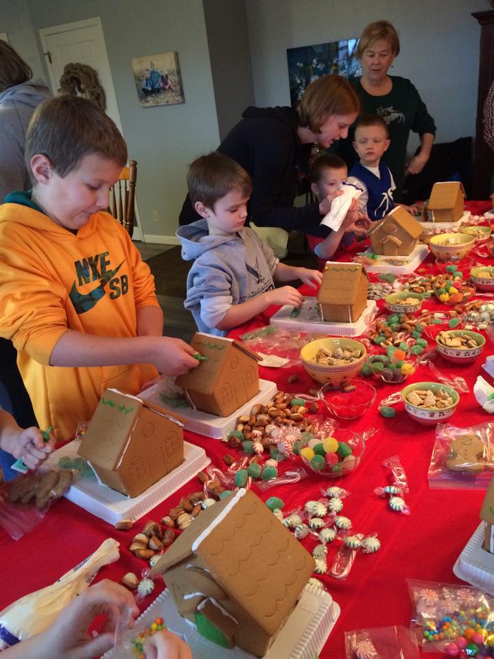 Continuing their 7-year holiday tradition, members of the Krell, Coleman, Forys, Renn and Jahelka families held their yearly gingerbread house-making party recently.