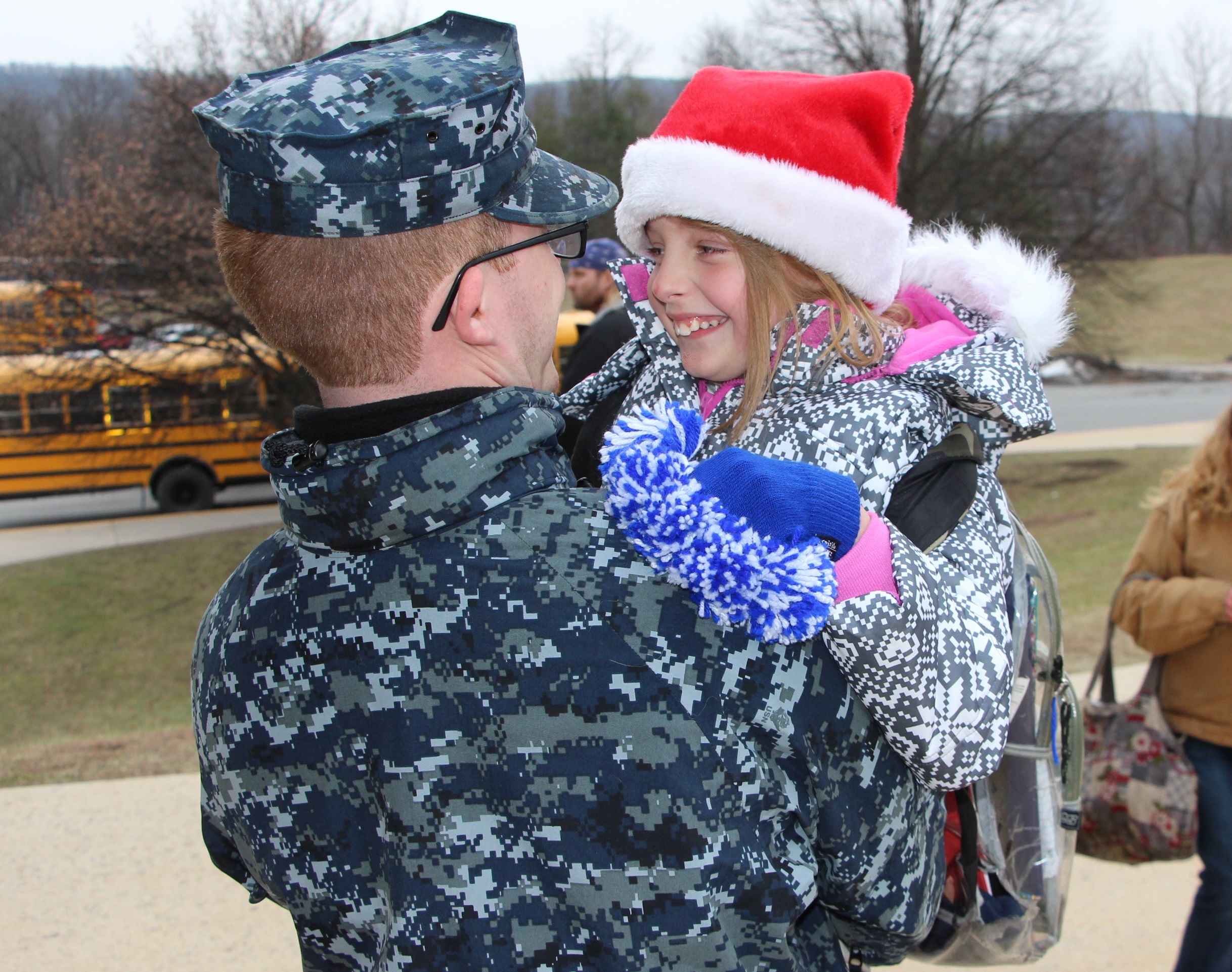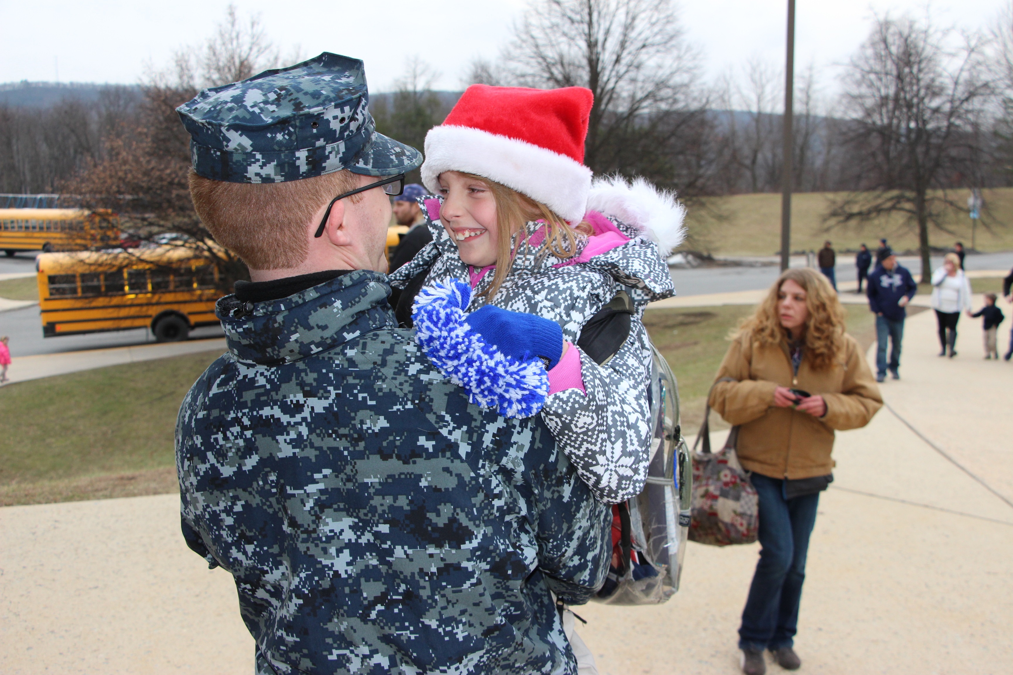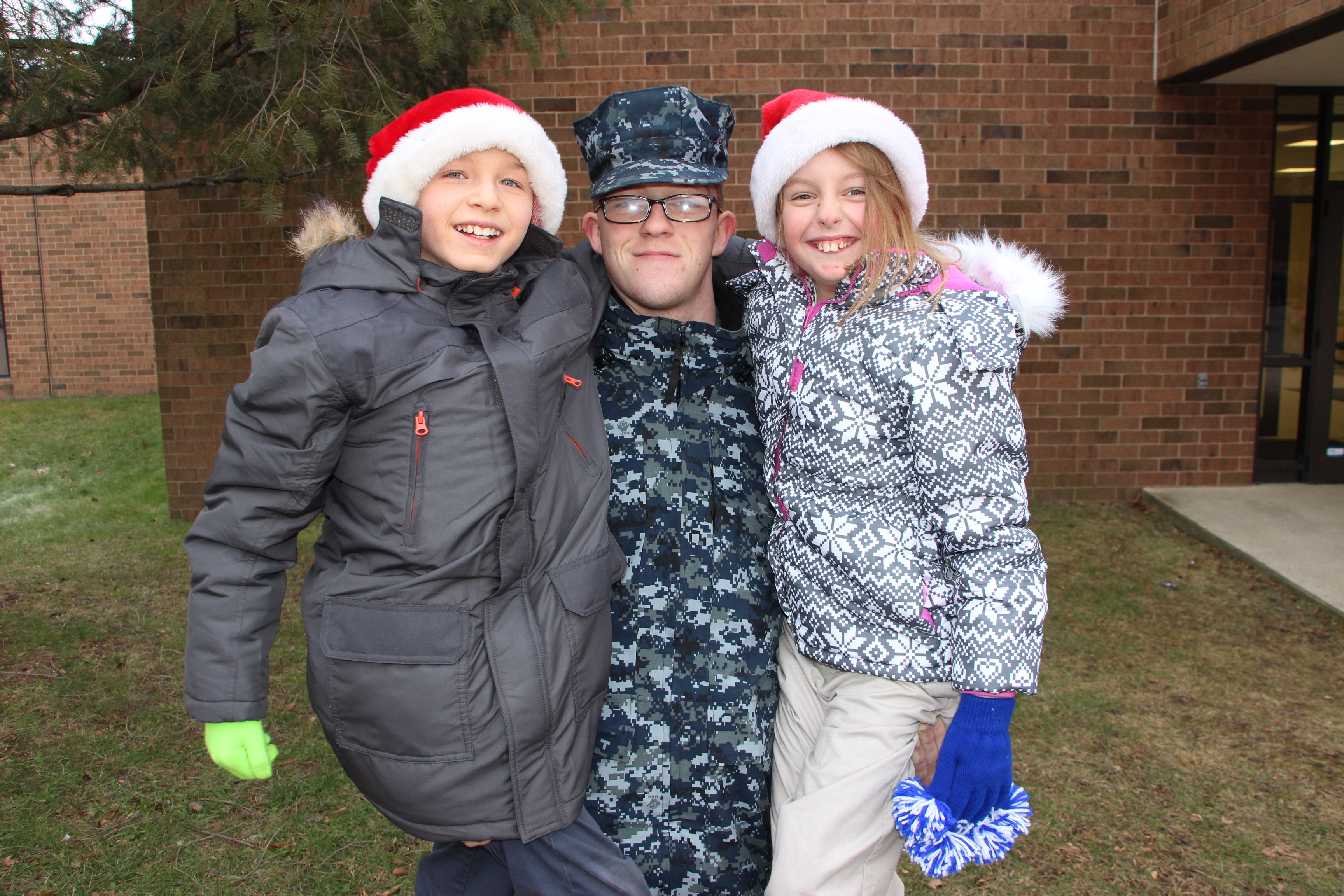 Seaman Recruit Gabe Bumberger, USN, of Tamaqua, was quick to receive hugs after surprising his younger brother and sister this afternoon (Monday, December 22, 2014) as they were dismissed from Tamaqua Elementary School. Alley Fucci, and Adam Bachert, both age 9, haven’t seen their brother since June 30, 2014.