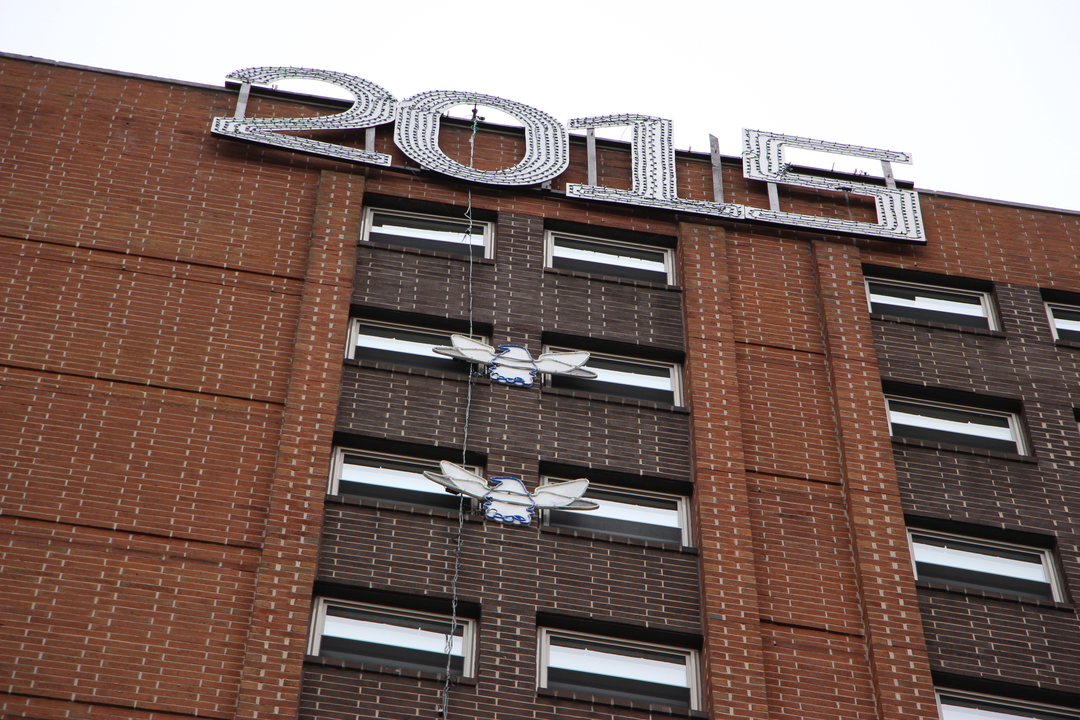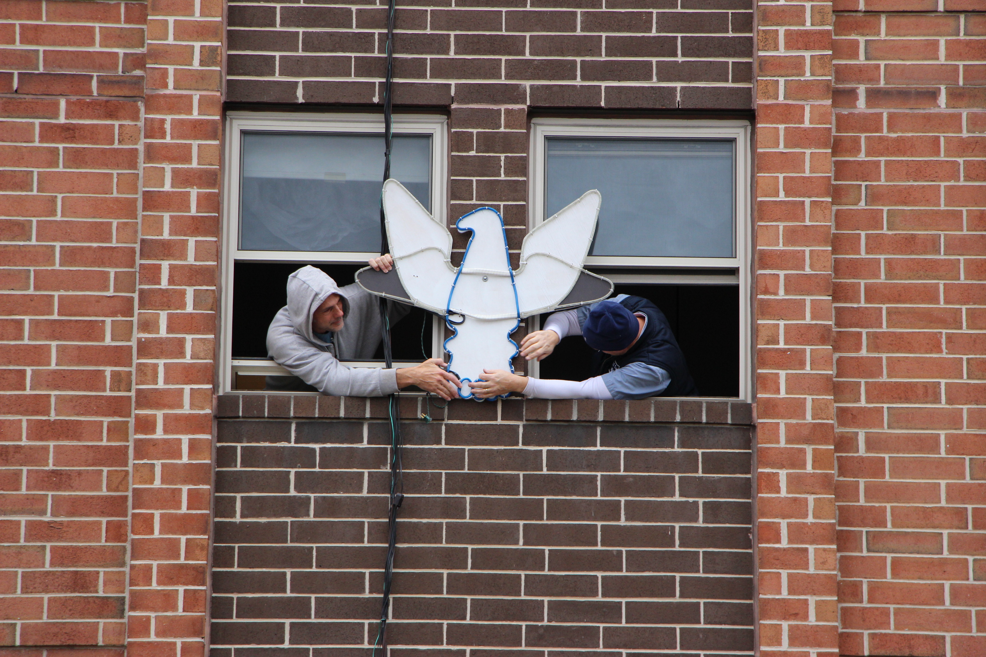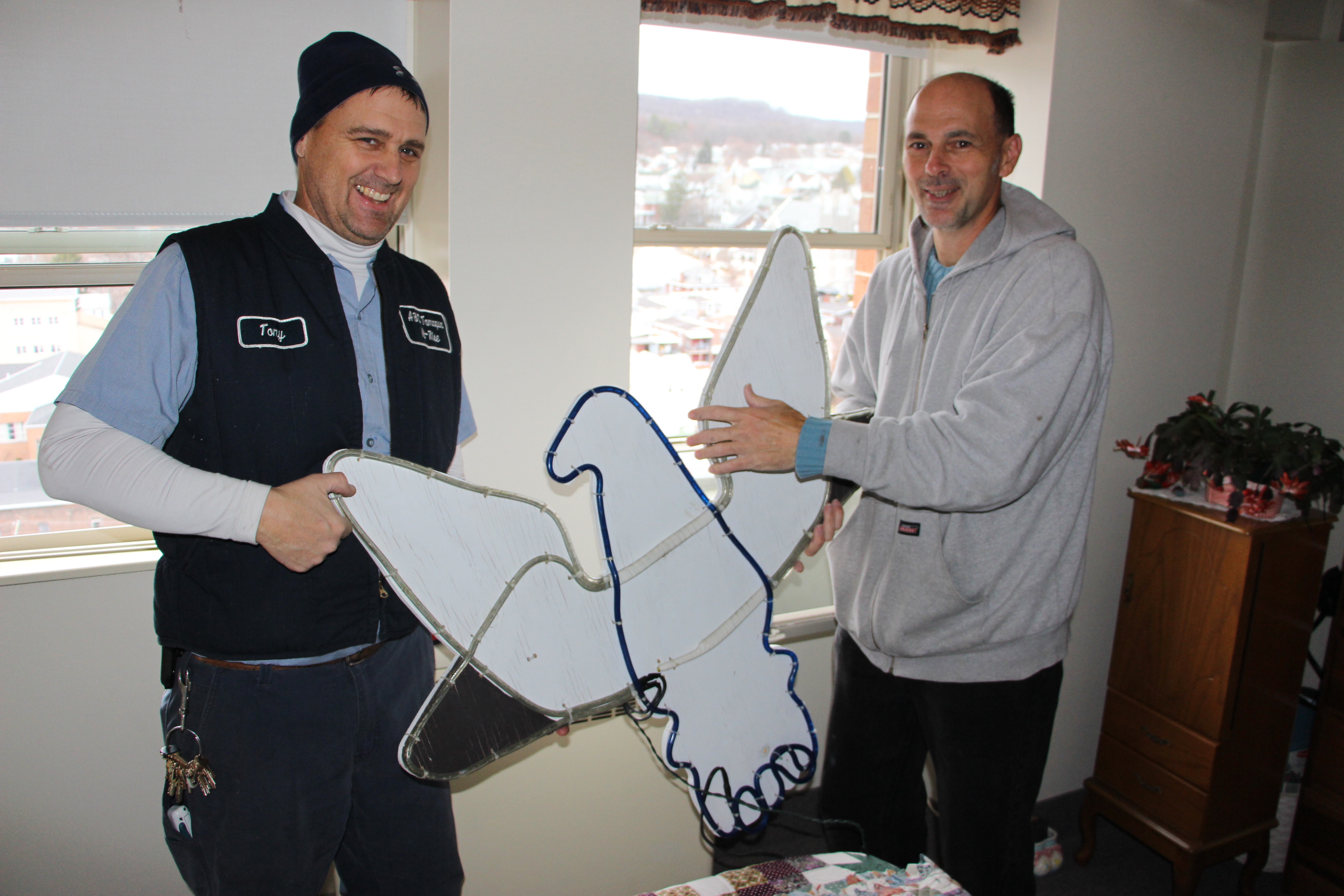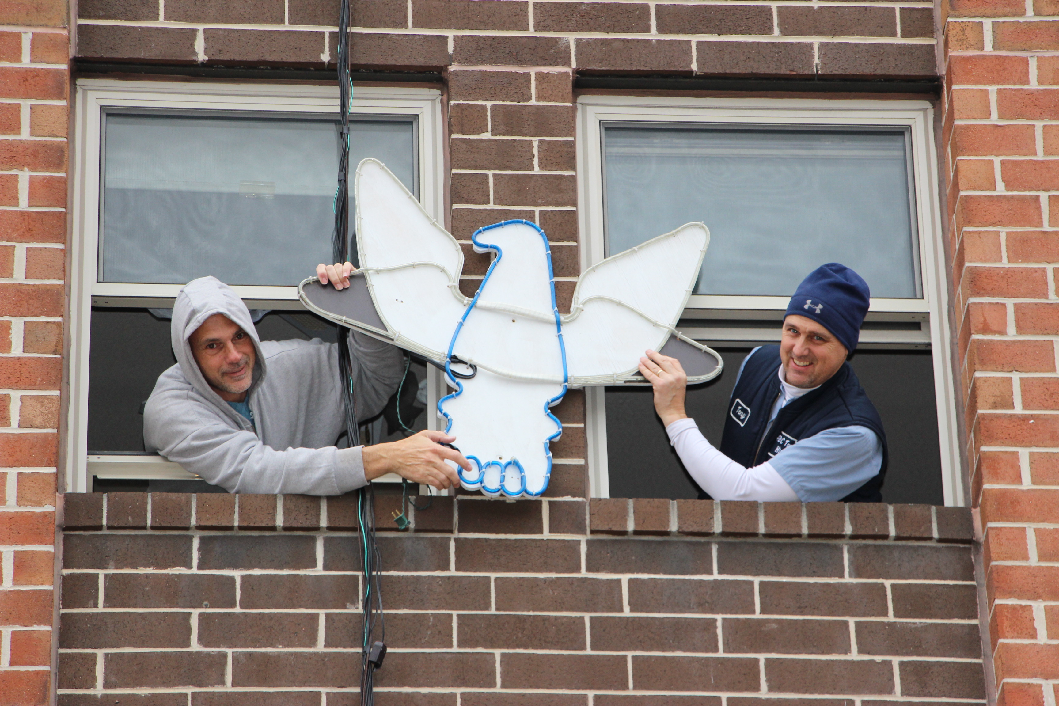 Frank Fabrizio, left, and Tony Fannock hang 13 animated eagles on the ABC High Rise in Tamaqua in preparation for today’s New Year’s Eve Celebration.