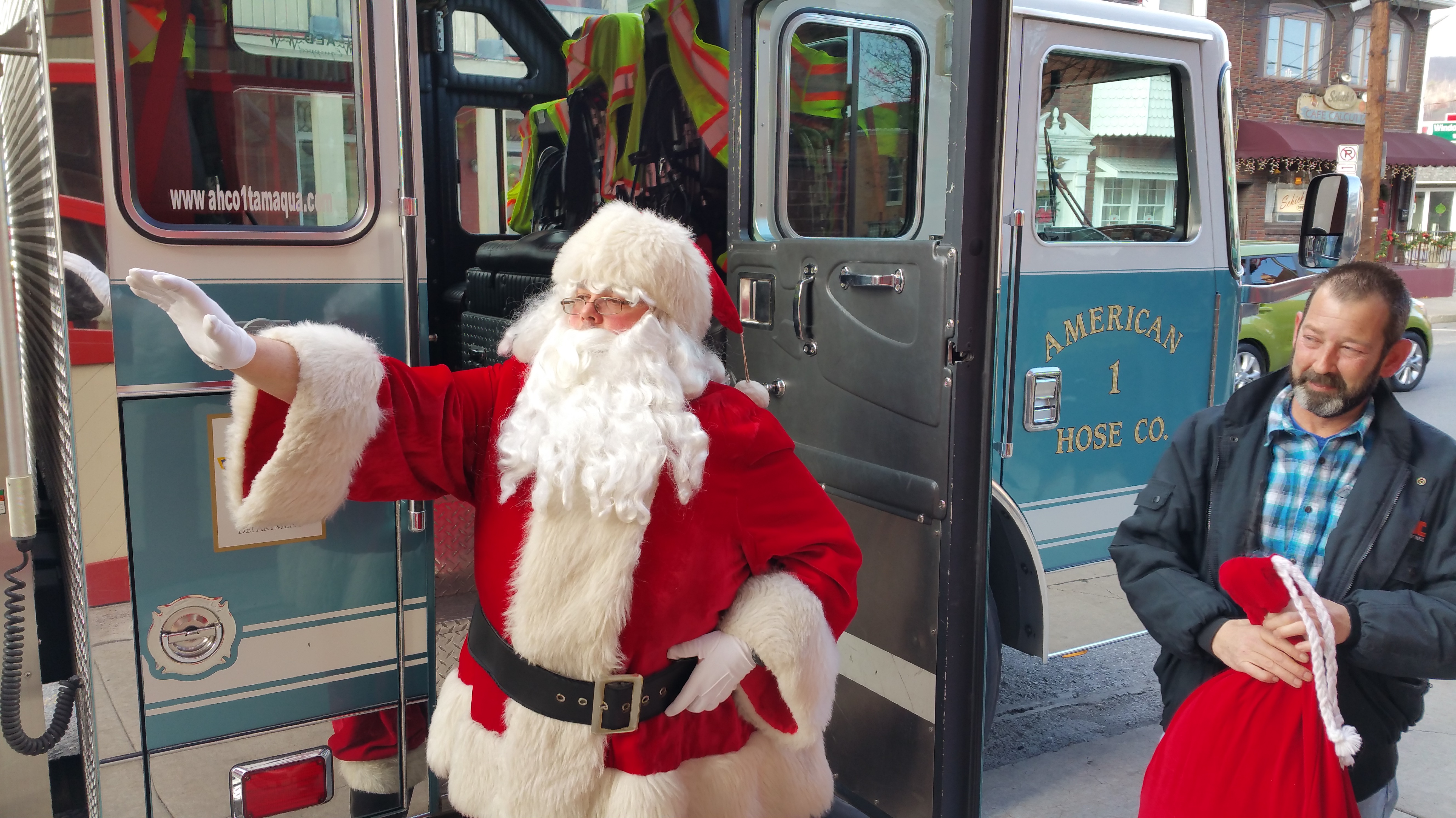 Arriving via fire truck, Santa Claus made a glowing appearance during his annual stop at the American Hose Company in Tamaqua on Sunday, December 21, 2014. In addition to sitting on Santa’s lap, children received a bag of goodies for promising to be good for the holidays.