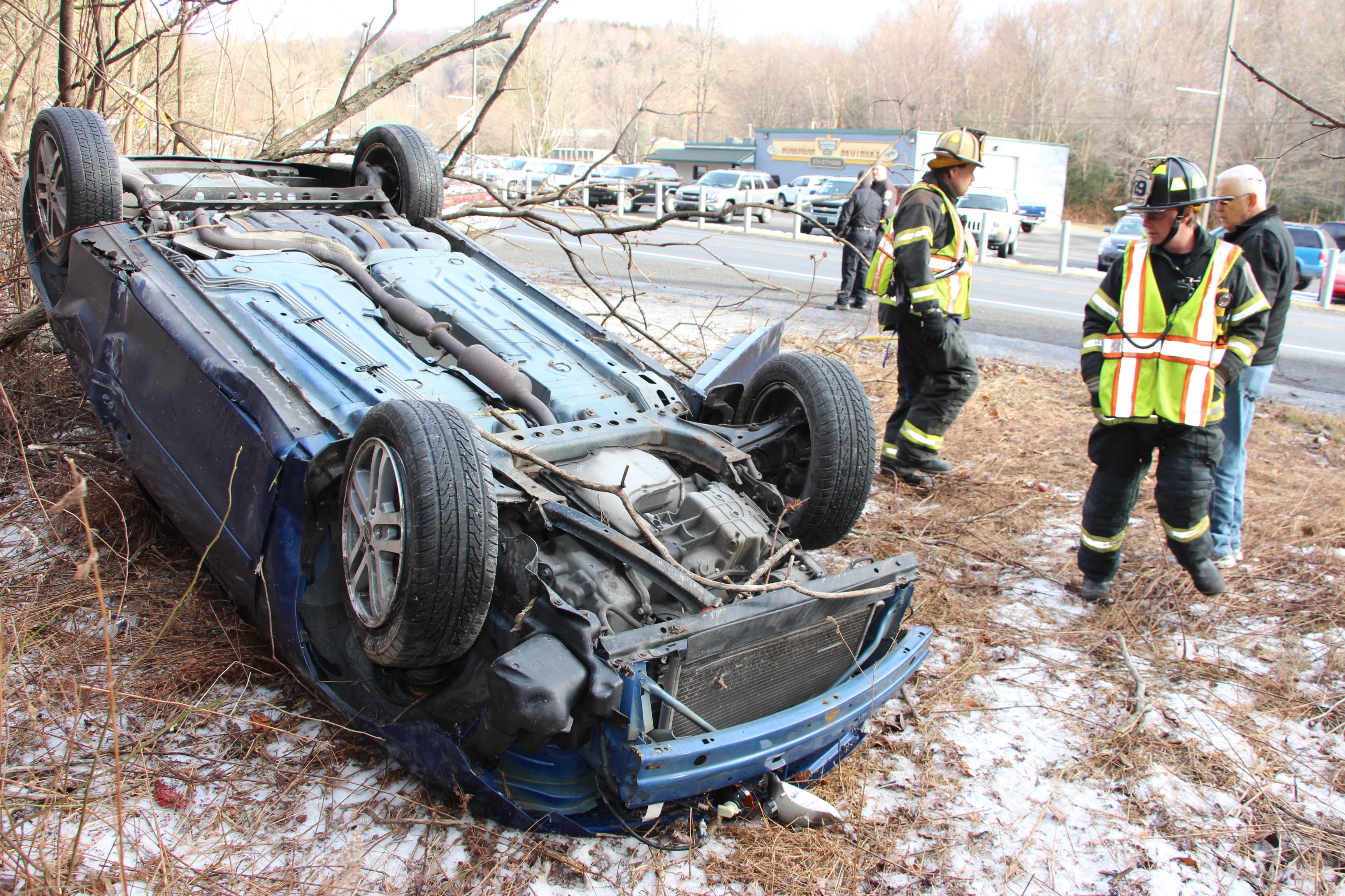 The incident occurred just before 9:45 AM and involved a blue 2003 Chevrolet Cavalier. Firefighters said the driver was traveling west on US209 when she overshot the turn, impacted brush, went airborne and overturned the vehicle. They added that she was able to get out of the vehicle on her own.
