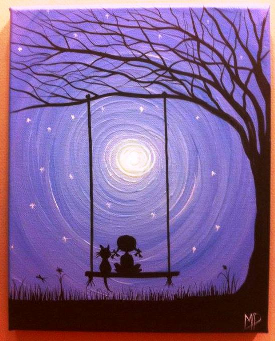 The theme will be a painting of a child and pet on a swing in the moonlight.