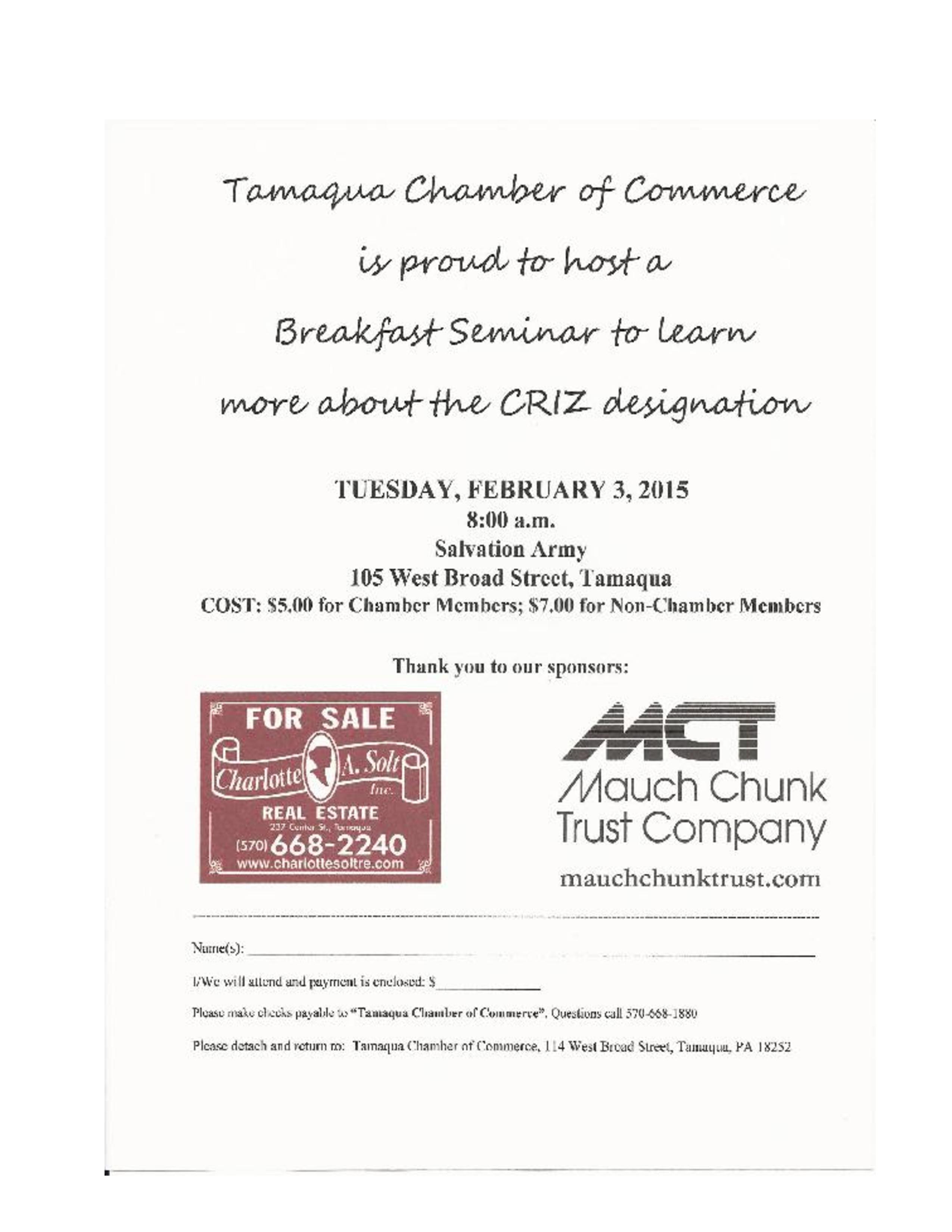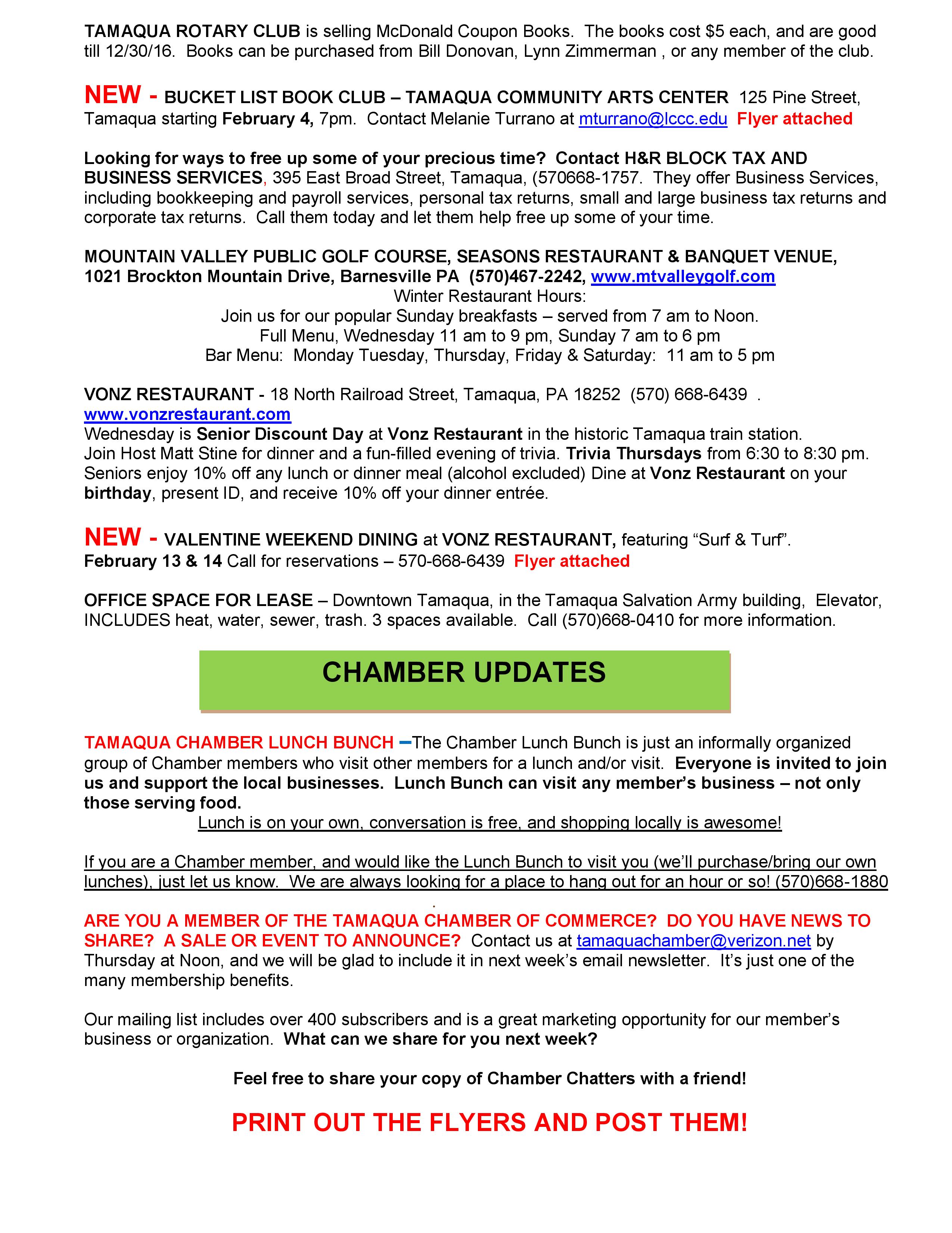 Here is the latest Tamaqua Area Chamber of Commerce’s Chamber Chatters newsletter dated Friday, January 23, 2015.