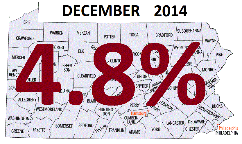 Pennsylvania’s unemployment rate declined by three-tenths of a percentage point in December to 4.8 percent, the commonwealth’s lowest rate since March 2008. This was the fourth consecutive monthly decline in the state unemployment rate and the ninth decline in 2014. Pennsylvania’s rate was eight-tenths of a percentage point below the U.S. rate of 5.6 percent. The commonwealth’s rate was down by 2.0 percentage points from last December while the national rate declined by 1.1 points over the year.Pennsylvania’s civilian labor force contracted slightly in December, down 1,000 to 6,367,000. Resident employment was up 13,000 while unemployment was down 14,000.