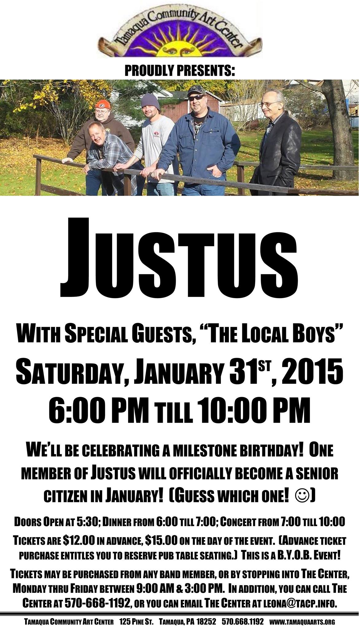 JUSTUS, and their special guests – The Local Boys, will perform on Saturday, January 31, 2015, in the recently renovated Performing Arts Hall at the Tamaqua Community Art Center.