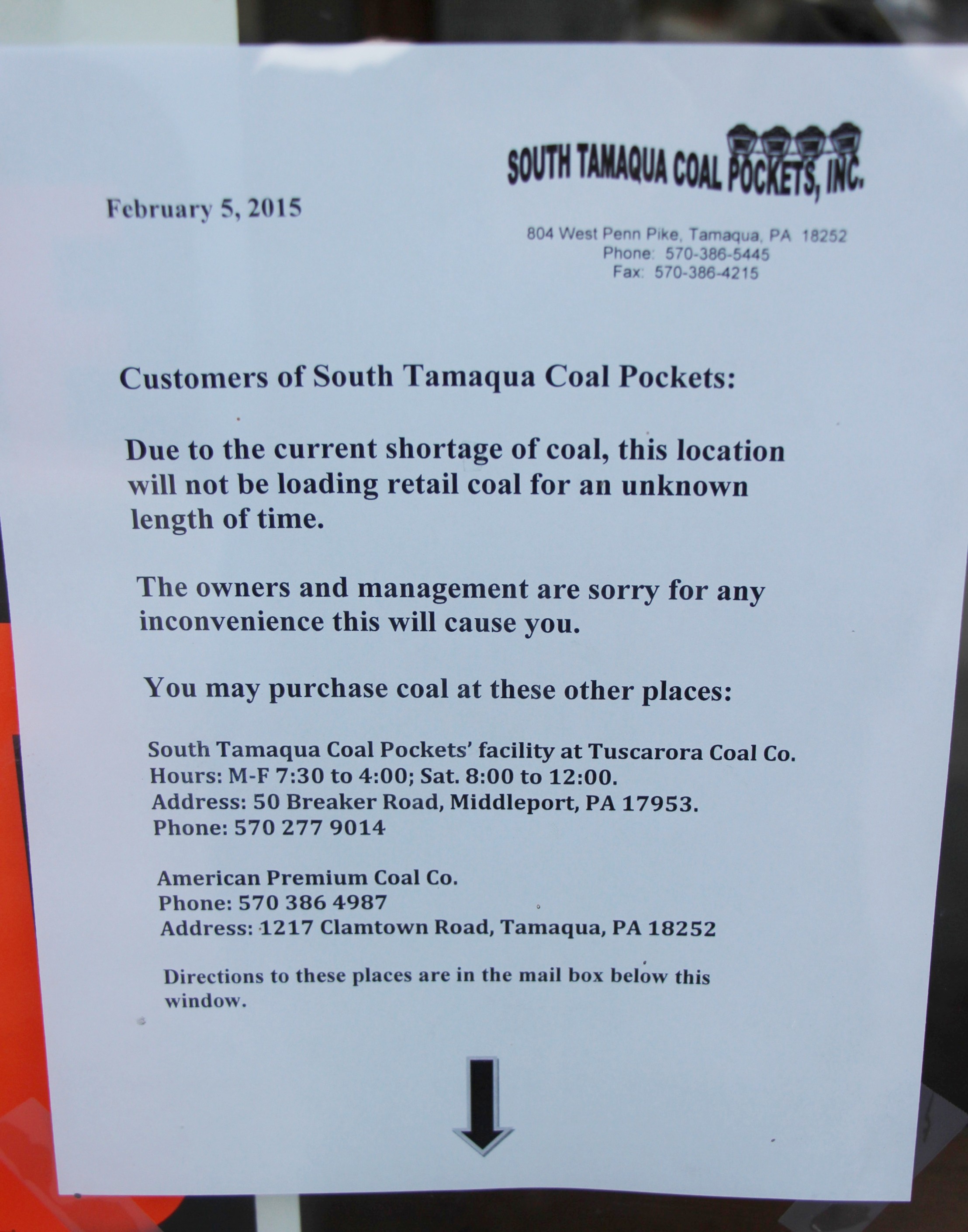 A sign on the front door of the South Tamaqua Coal Pockets Inc. facility in West Penn Township tells customers that the location will not be loading retail coal for an unknown length of time “due to the current shortage of coal”.