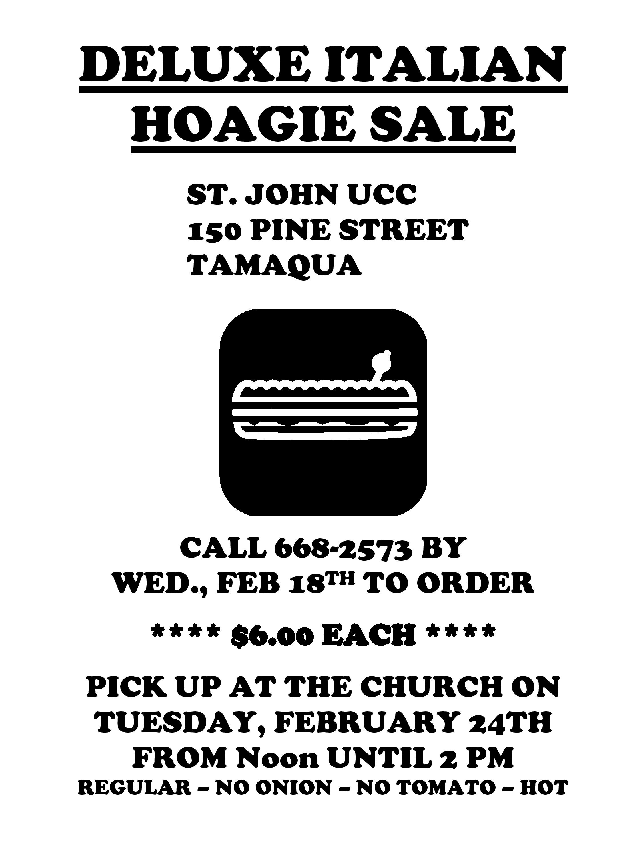 St. John’s United Church of Christ in Tamaqua is holding a Deluxe Italian Hoagie Sale. The last day to order is Wednesday, February 18, 2015.