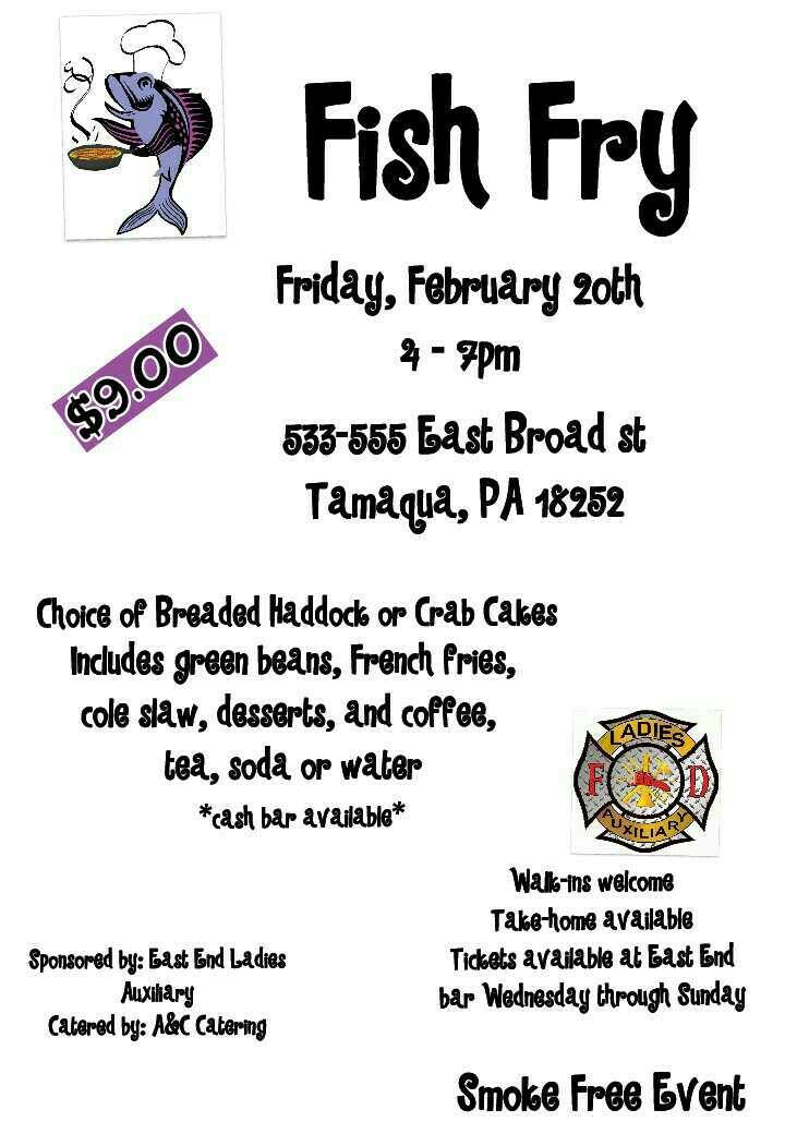Firefighters and volunteers with the East End Fire Company in Tamaqua are holding a Fish Fry Fundraiser on Friday, February 20, 2015 at their firehouse.
