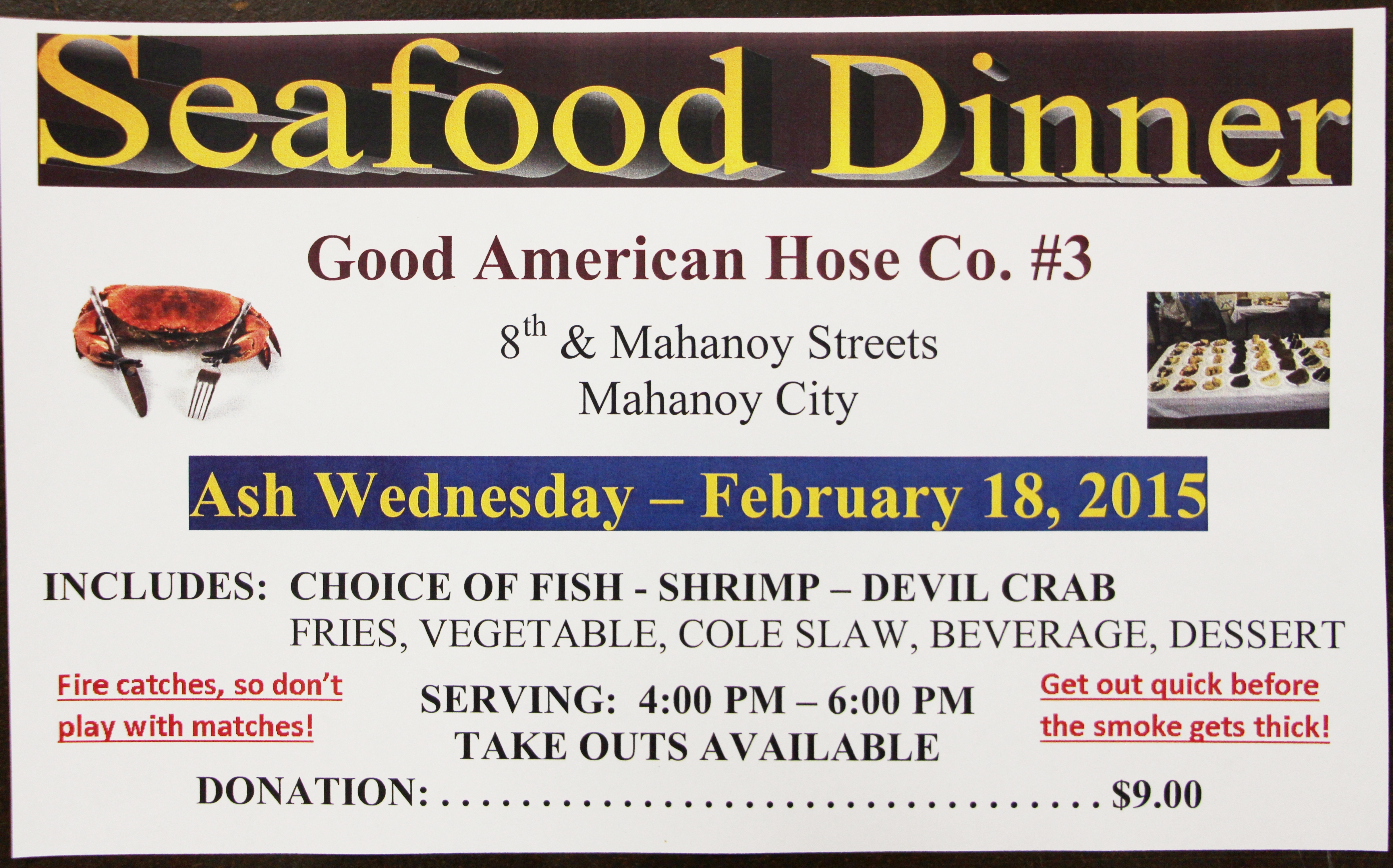 The Good American Hose Company No. 3, aka “Dutchies”, in Mahanoy City, are holding a Seafood Dinner Fundraiser on Ash Wednesday (February 18, 2015) at their fire house.