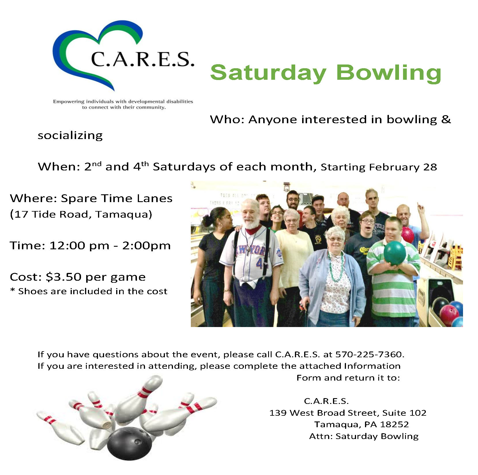 PRESS RELEASE – C.A.R.E.S. is pleased to announce the start-up of a new Saturday Bowling League at Spare Time Bowling Lanes, 17 Tide Road, in Hometown. The league will start on Saturday, February 28, 2015, and be held on the second and fourth Saturday’s of each month. Bowling times will be 12 PM until 2 PM. Cost is $3.50 per game and shoes are included in the cost.