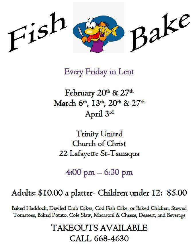 Volunteers of Trinity United Church of Christ in Tamaqua are holding their a Fish Bake Dinners in February, March and April 2015 in their social hall from 4 PM to 6:30 PM.