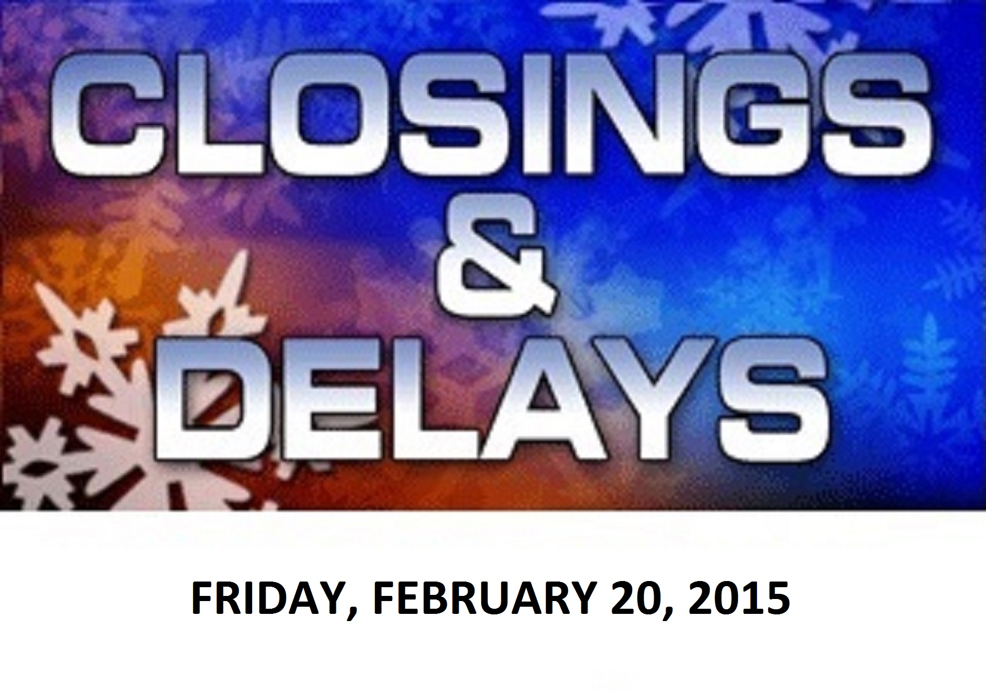 Below is a list of local area schools with delays or closings for Friday, February 20, 2015.