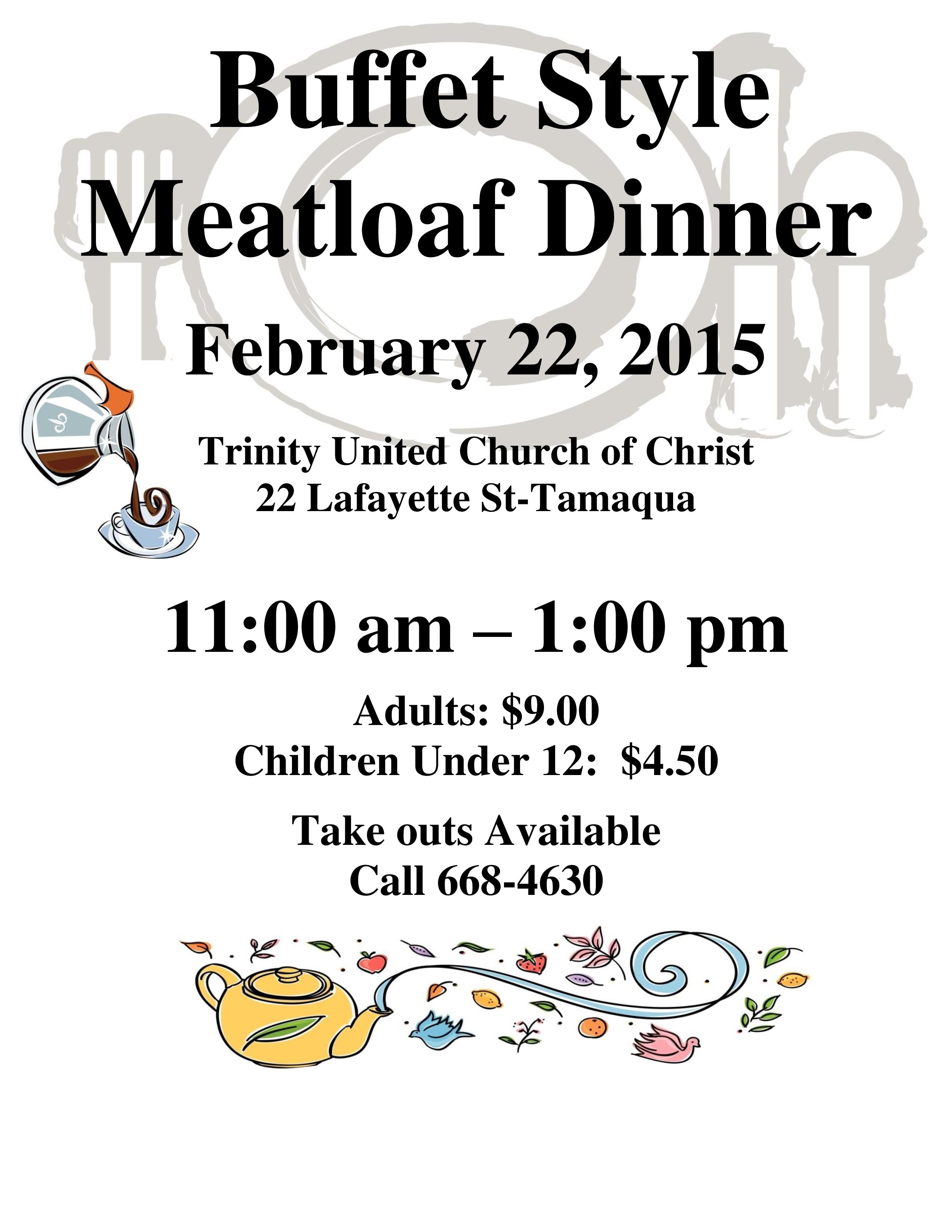 Members and volunteers with Trinity United Church of Christ in Tamaqua are holding a Buffet-Style Meatloaf Dinner on Sunday, February 22, 2015 from 11 AM to 1 PM in their social hall.