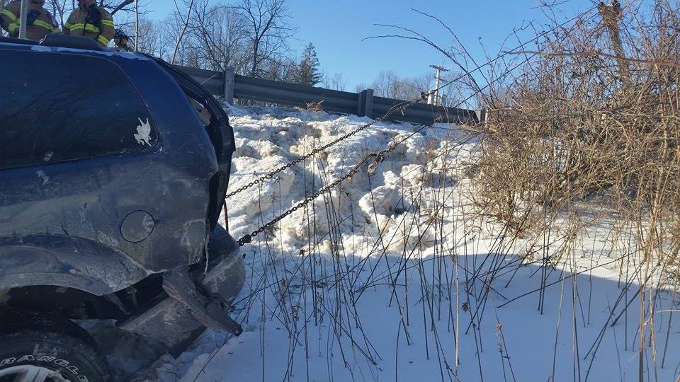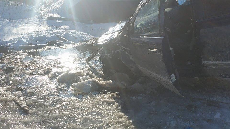 A person on scene said that the vehicle hit a snow bank, snapped a utility pole, launched over guardrail, impacted a speed limit sign and then landed in Pine Creek. The person added that the driver and passengers were lucky since the creek wasn’t very deep and that the vehicle landed on its tires rather.