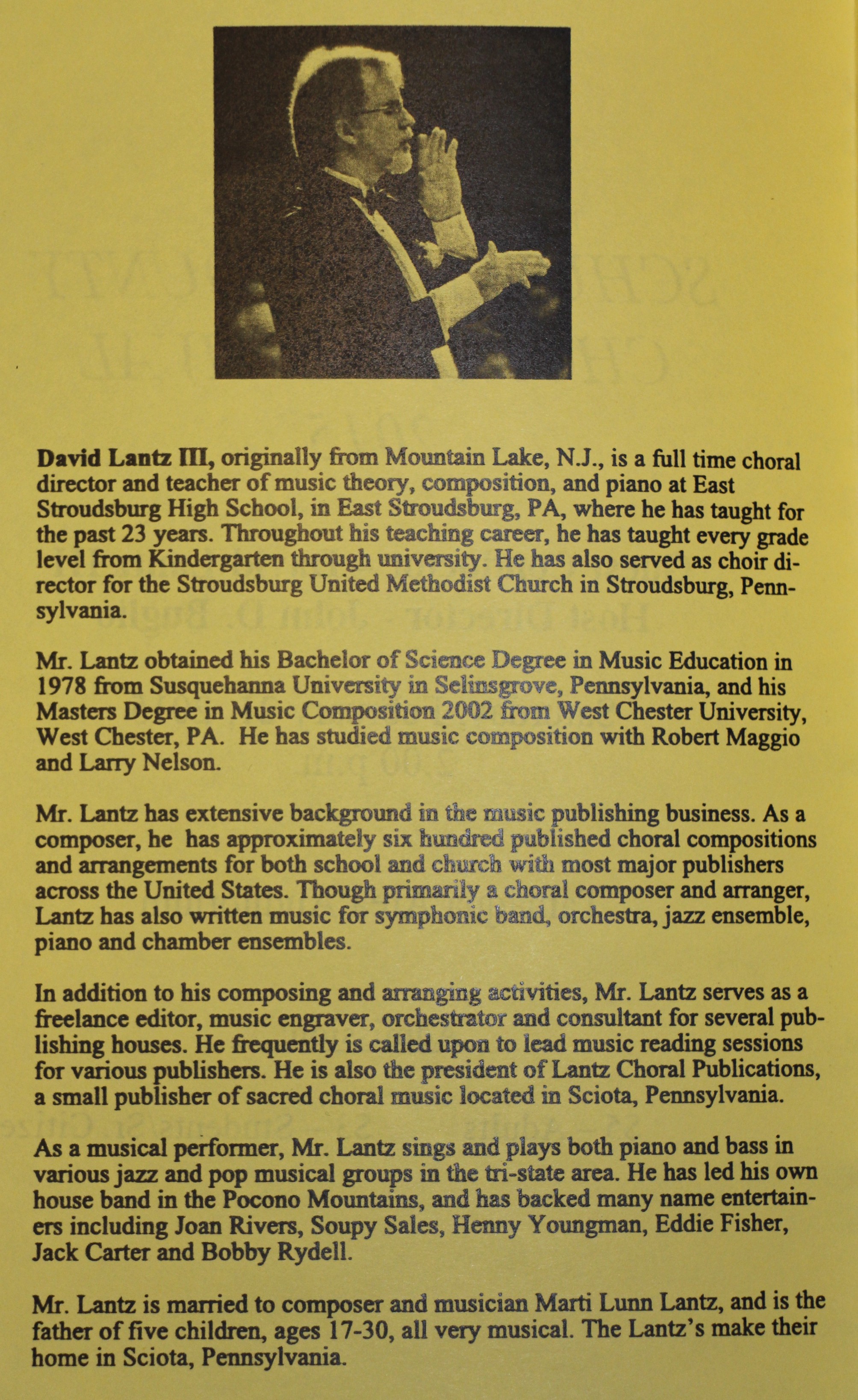 The Schuylkill County Chorus is comprised of students from grades 8 thru 12 from twelve participating high schools throughout Schuylkill County. Students were selected to participate in the four-day chorus festival in October of 2014 by competitive vocal audition at Pottsville High School. This year’s chorus was under the direction of David Lantz III, a noted composer, educator, and choral director at East Stroudsburg North High School.