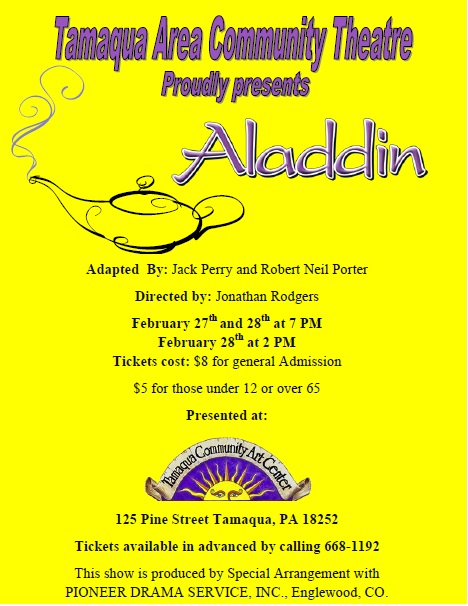 Members of the Tamaqua Area Community Theatre group are holding three showings of “Aladdin” this weekend at the Tamaqua Community Arts Center.