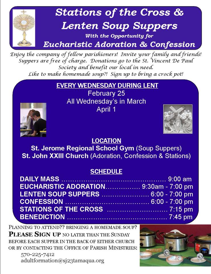 The supper is followed by Stations of the Cross in St. John XXIII Church at 7:15 PM.
