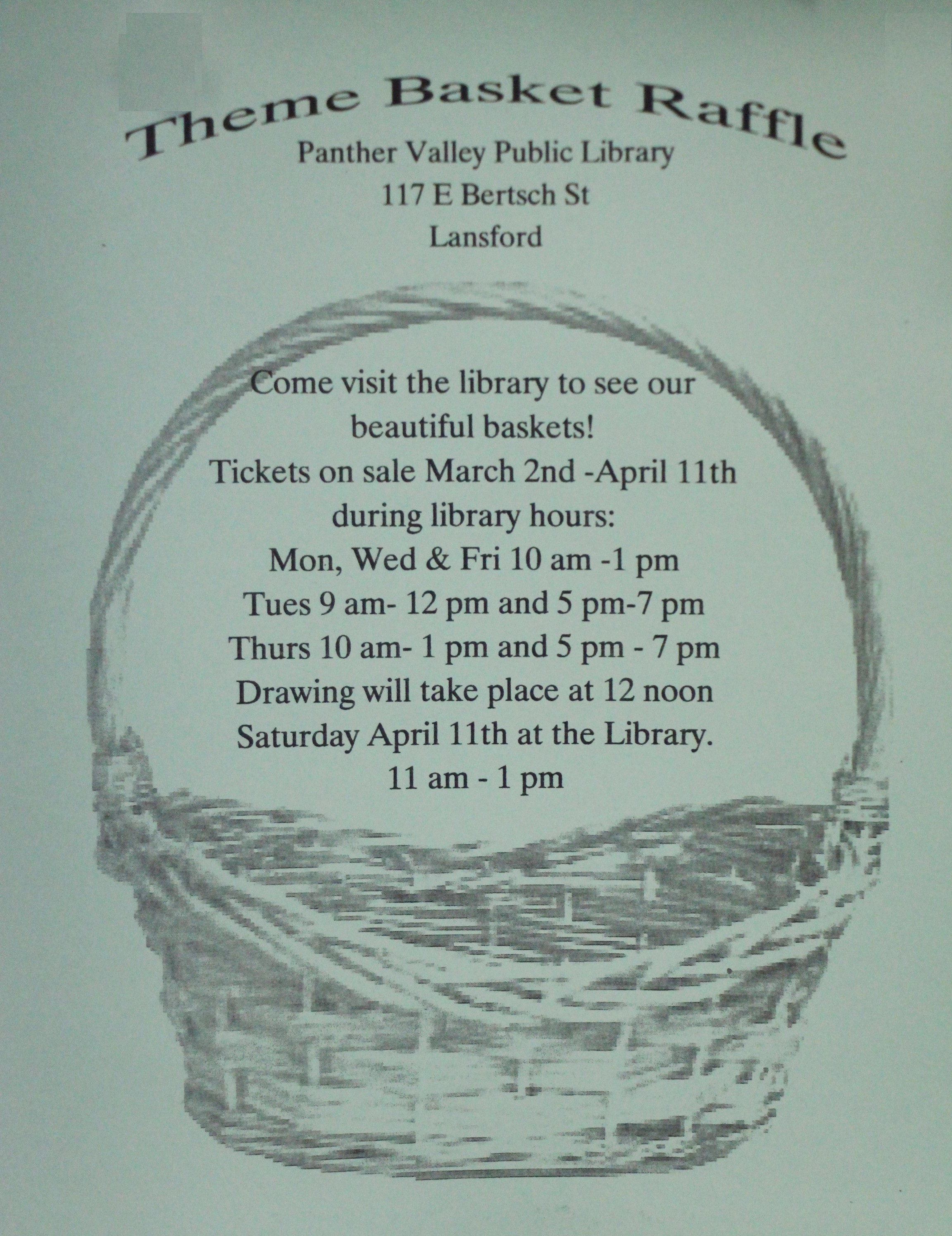 The Panther Valley Public Library is selling tickets for their Themed Basket Bingo. Tickets will be on sale until Saturday, April 11, 2015.