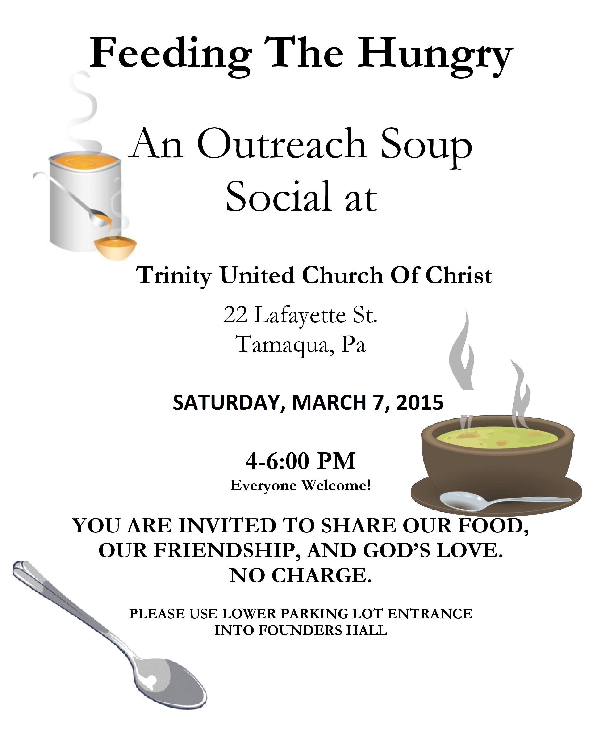 Tamaqua’s Trinity United Church of Christ is holding their monthly community outreach soup social and gathering on Saturday, March 7, 2015 in their social hall.