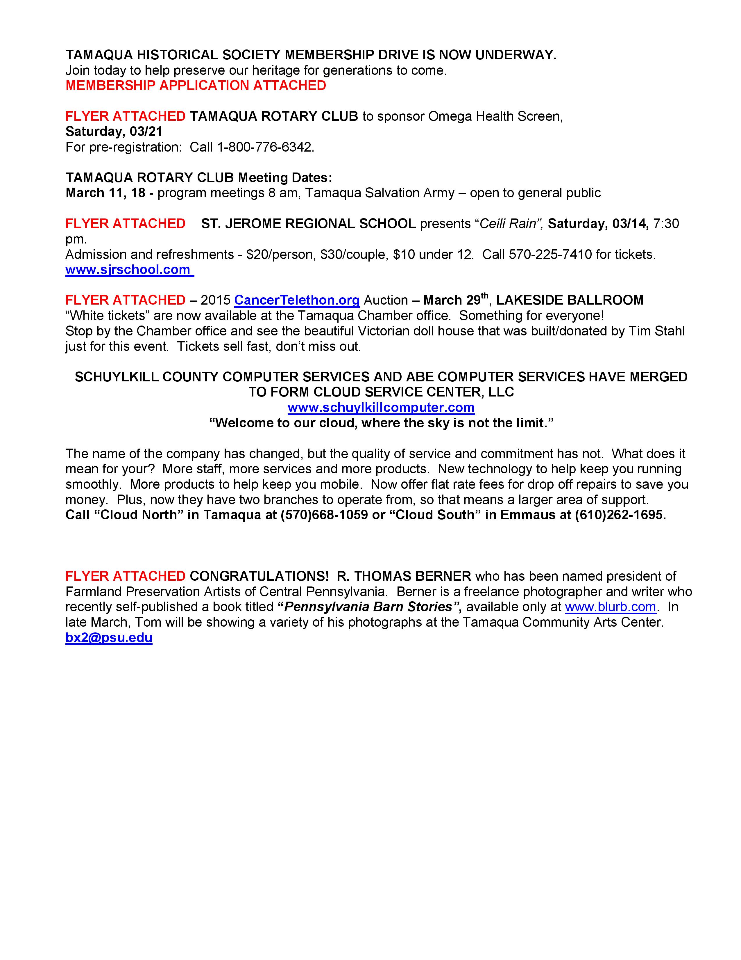 Here is the latest Tamaqua Area Chamber of Commerce’s Chamber Chatters newsletter dated Friday, March 6, 2015.