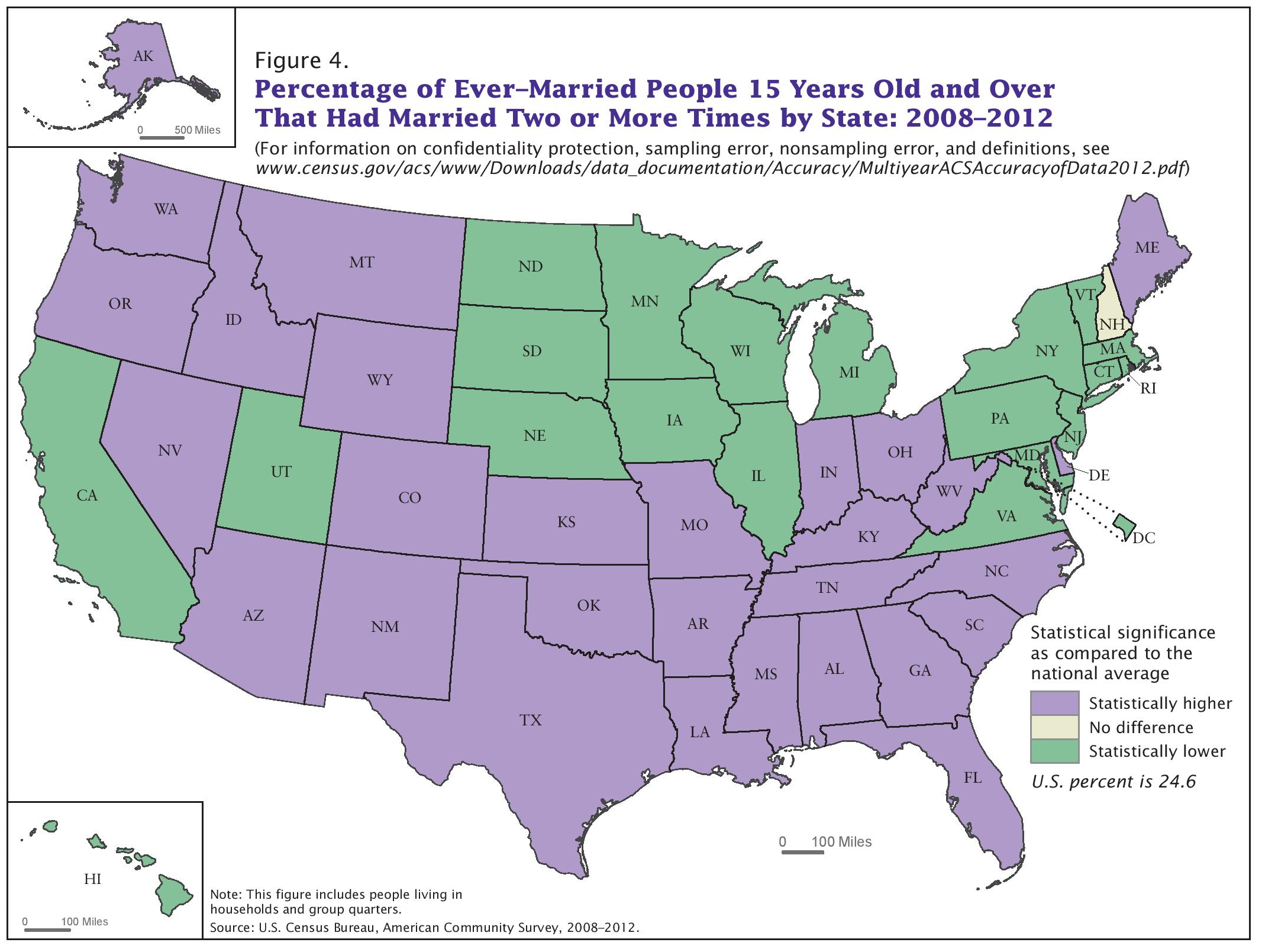 •Remarried adults are more common in Southern and Western states and less common in the Northeast and Midwest. Among all states, the percentage of ever-married adults who had married two or more times is greatest in Arkansas (35 percent). Remarried people are least common in New Jersey (16 percent).