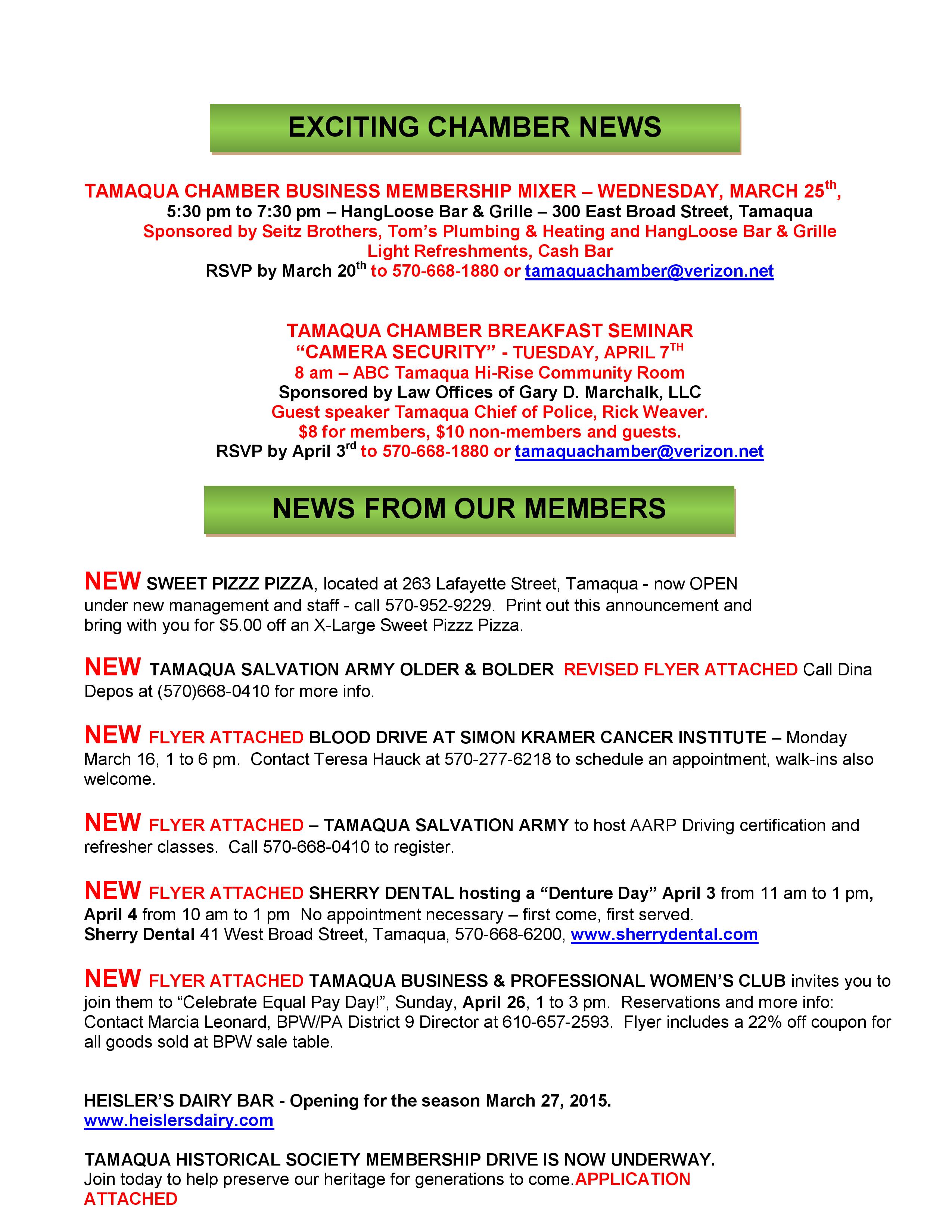 Here is the latest Tamaqua Area Chamber of Commerce’s Chamber Chatters newsletter dated Friday, March 13, 2015.