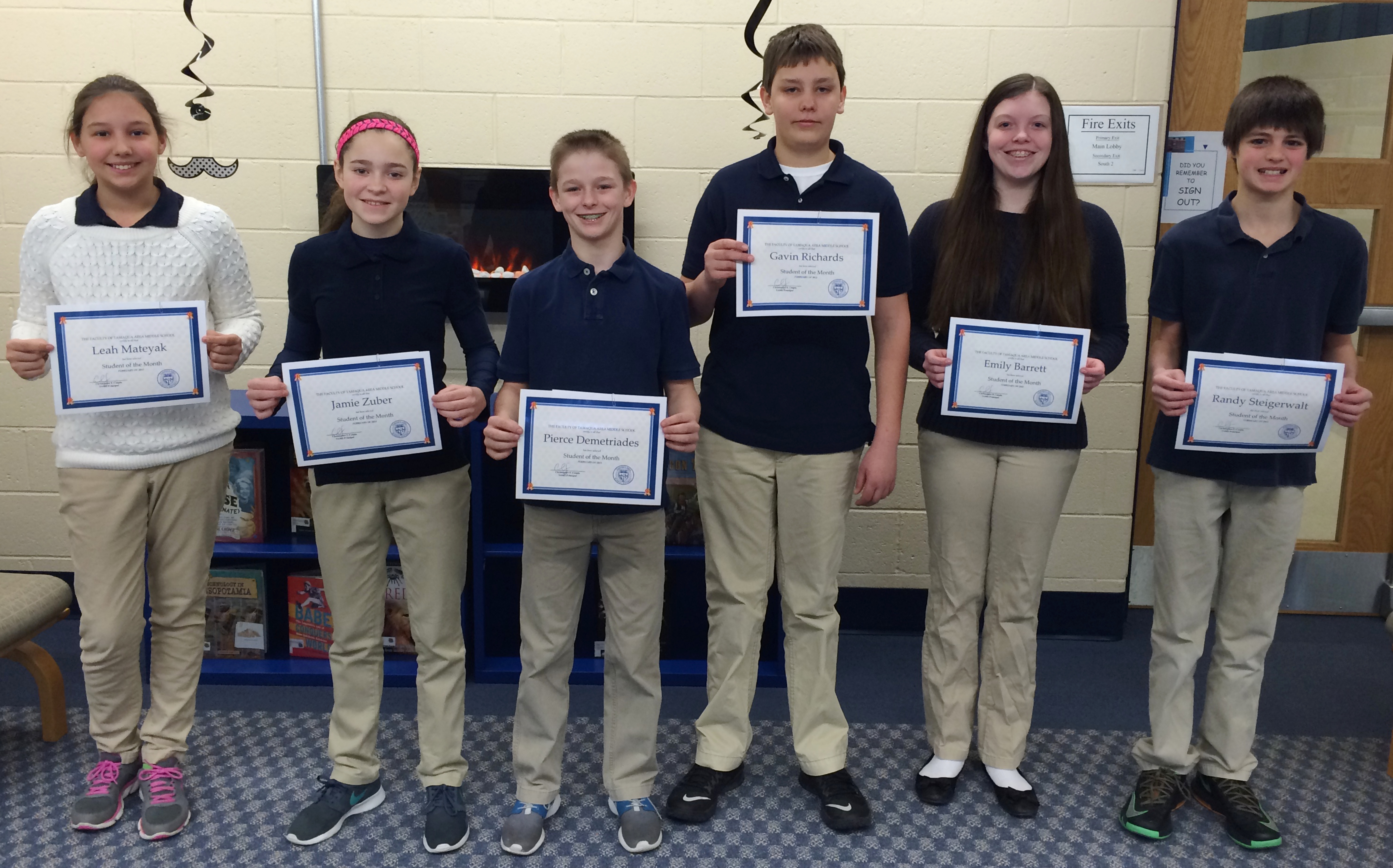 Tamaqua Area Middle School Principal Chris Czapla announced the middle school Students of the Month for February 2015. They are, from left, Leah Mateyak, 6th grade; Jamie Zuber, 7th grade; Pierce Demetriades, 7th grade; Gavin Richards, 8th grade; Emily Barrett, 8th grade; and Randy Steigerwalt, 6th grade.
