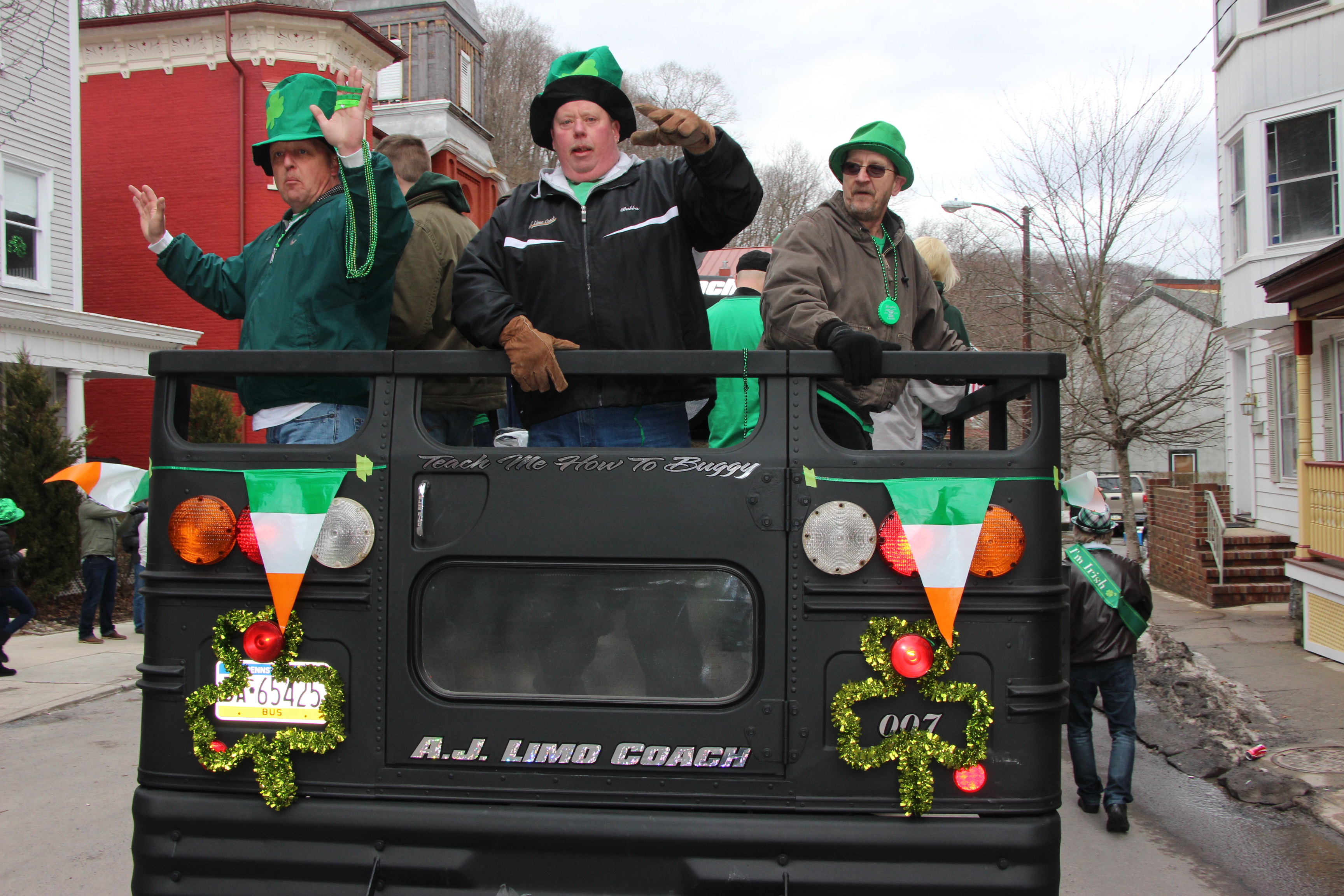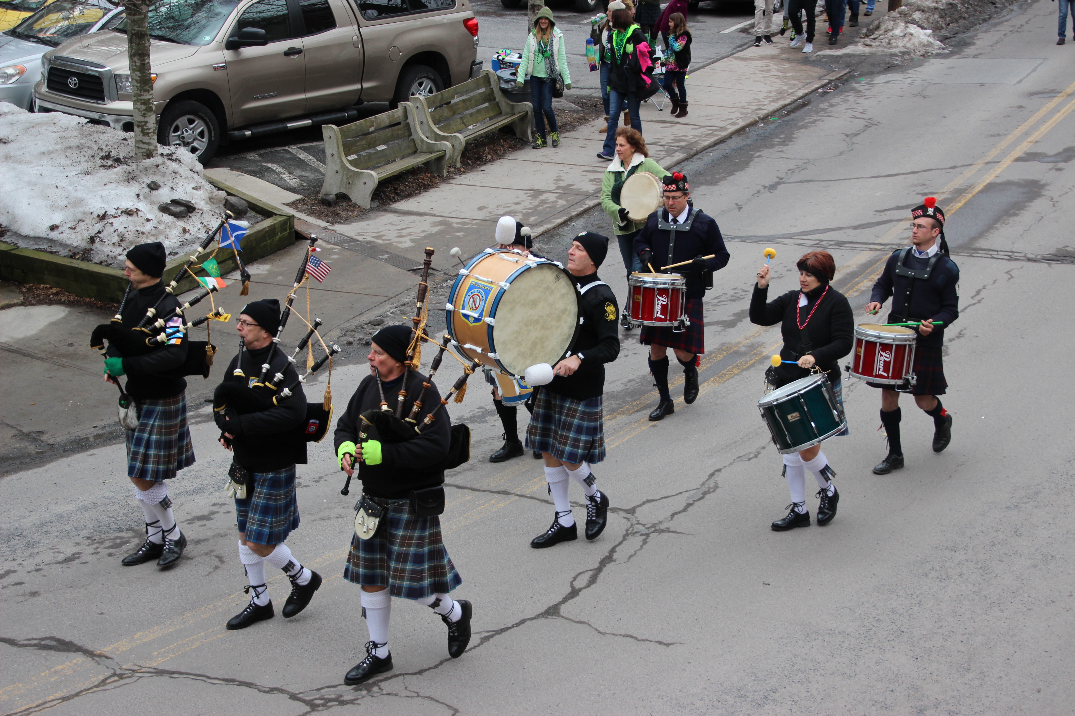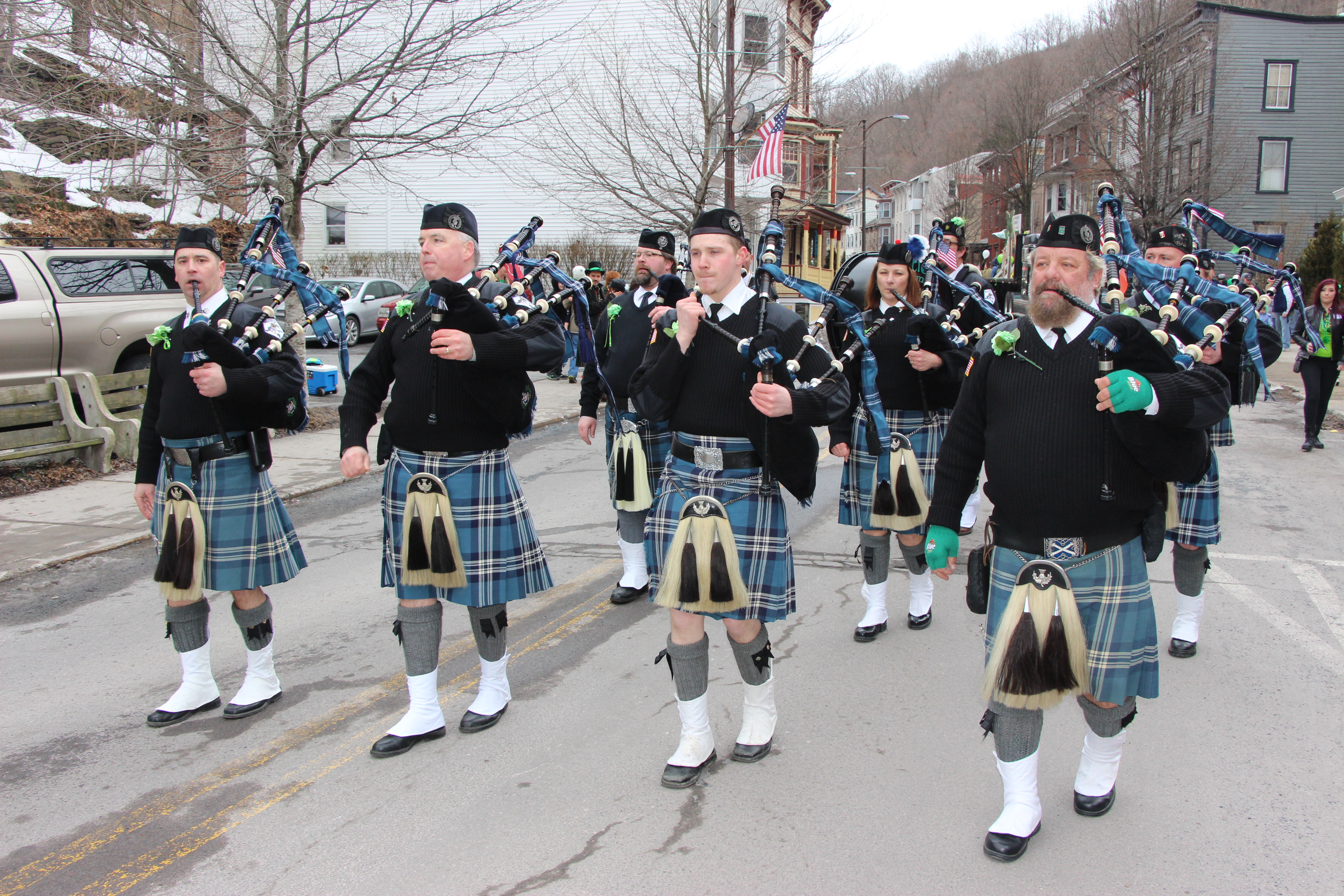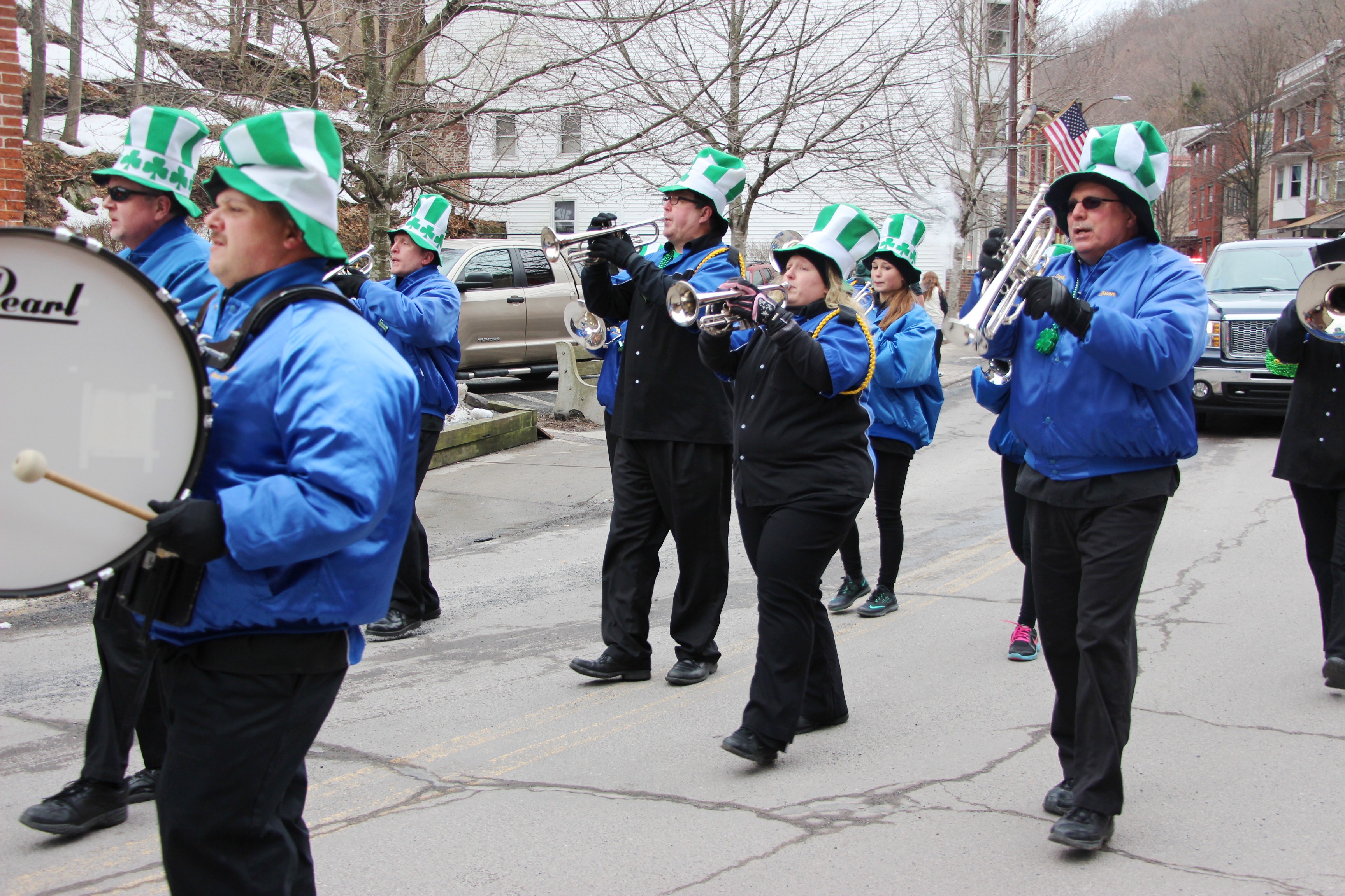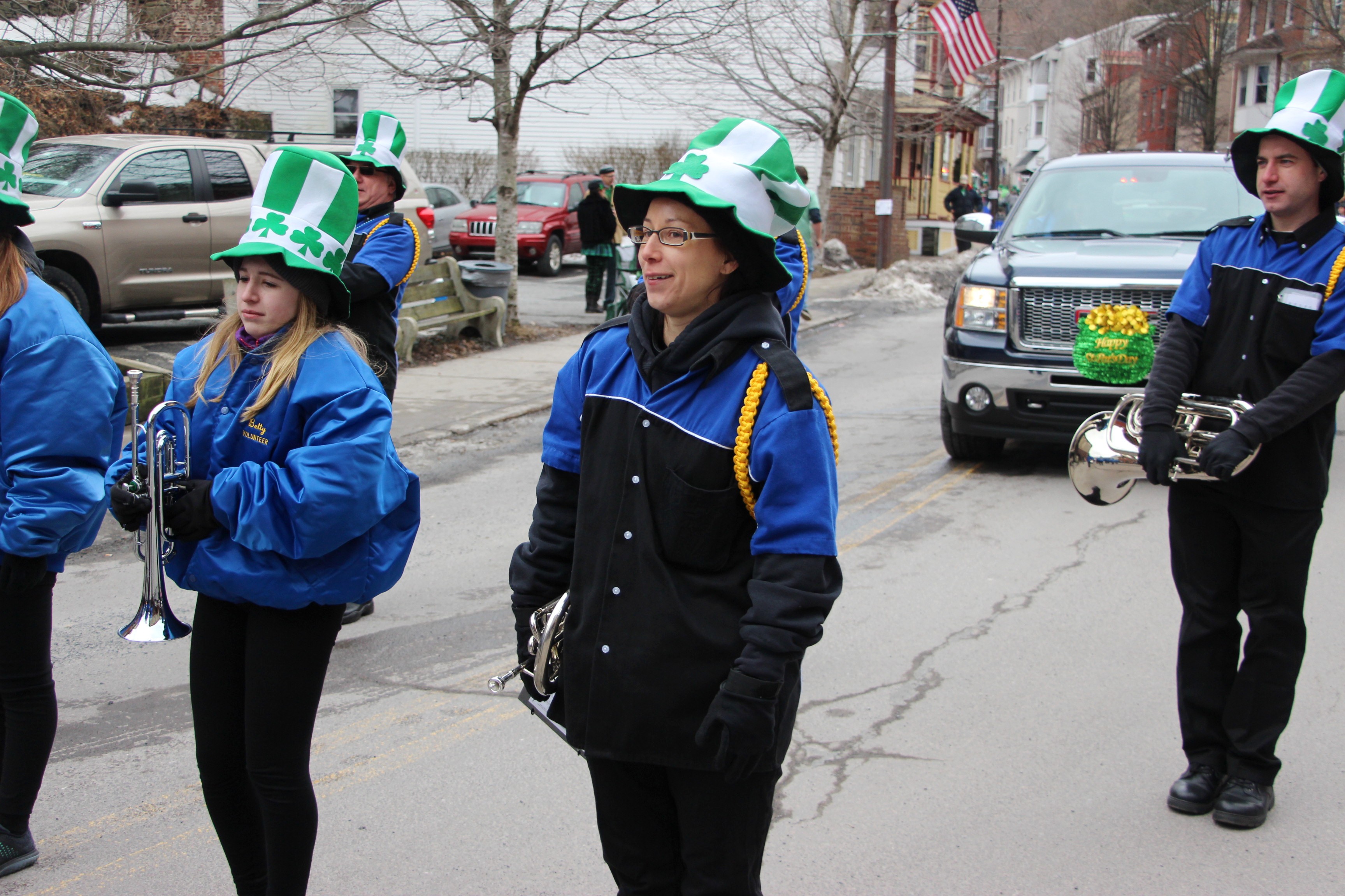 Jim Thorpe Police Department Cruiser and Mayor Michael Sofranko, Banner of St. Patrick, Grand Marshal Gary Dobias, Aides to the Grand Marshal, Lochiel Emerald Society Pipe and Drums, Ancient Order of Hibernians, Carbon County Chapter; Ladies Ancient Order of Hibernians, Carbon County Chapter; Chuck Thamarus Truck; California Raisins Volkswagon Beetle; Jim Thorpe Area High School Band; Congressman Matthew Cartwright; State Senator John Yudichak; State Representative Doyle Heffley; Carbon County Commissioners Thomas J. Gerhard, Wayne Nothstein and William O’Gurek; District Attorney Jean Engler; Carbon County Prothonotary Joann Behrens; Carbon County Director of Veterans’ Affairs Henry Desrosiers; Ceol Neamh; Lehigh County Ancient Order of Hibernians; Schuylkill-Carbon Marine Corps League Detachment 626; Quitapahilla Highlanders Pipe Band; U.S. Postal Service truck; Eclectic Circus; Bear Creek Golf Carts; and Sinister Rouge Pin Up and More.
