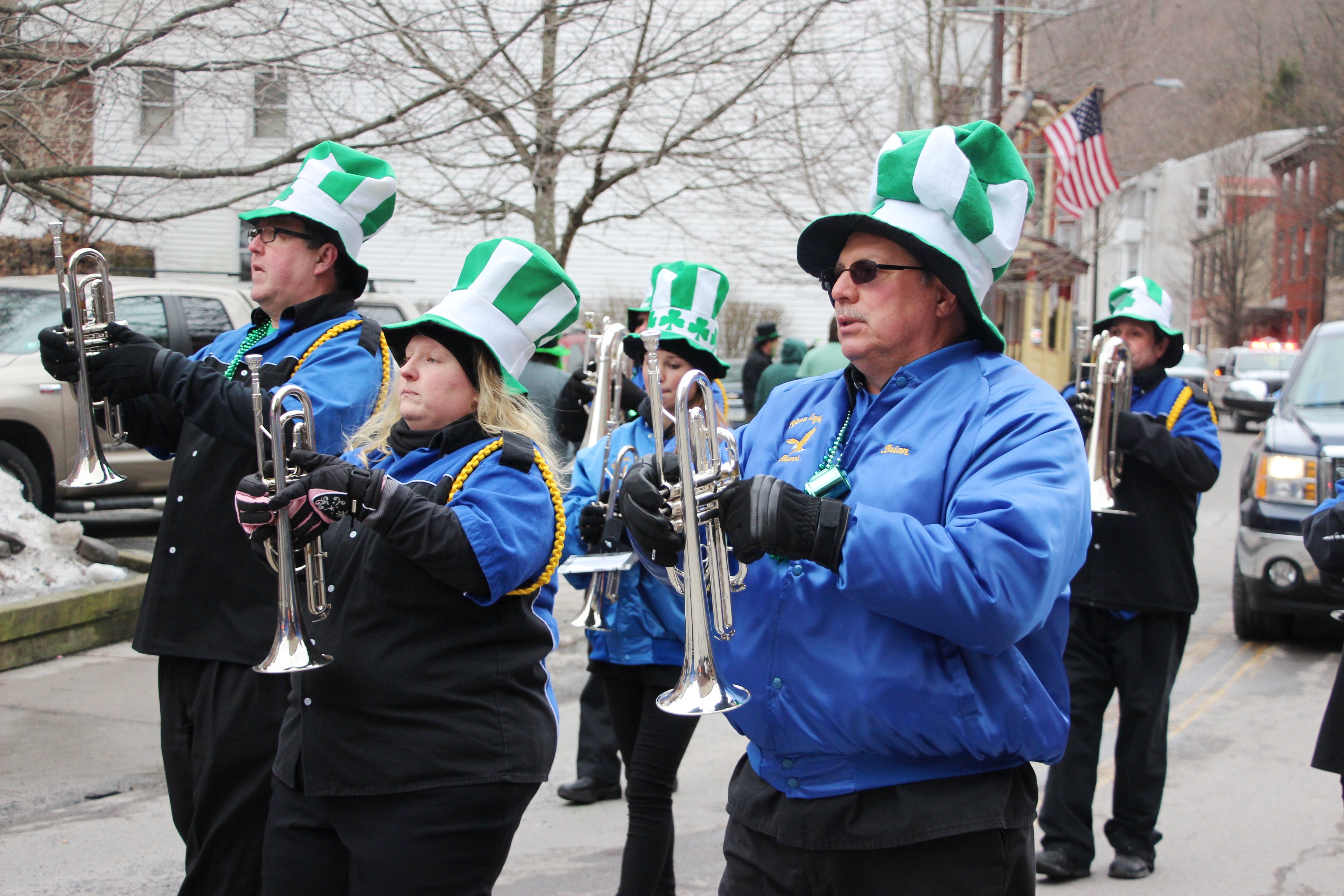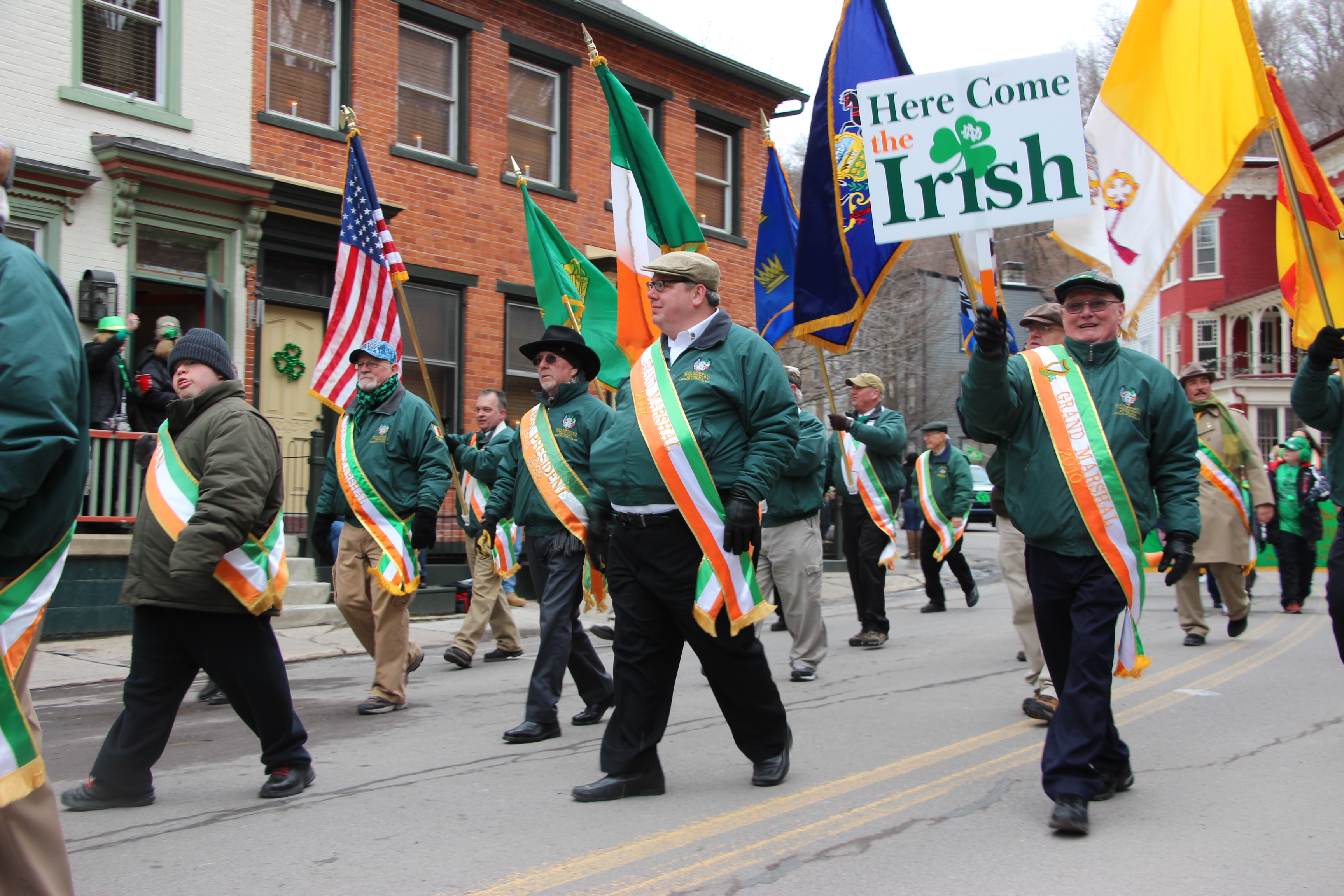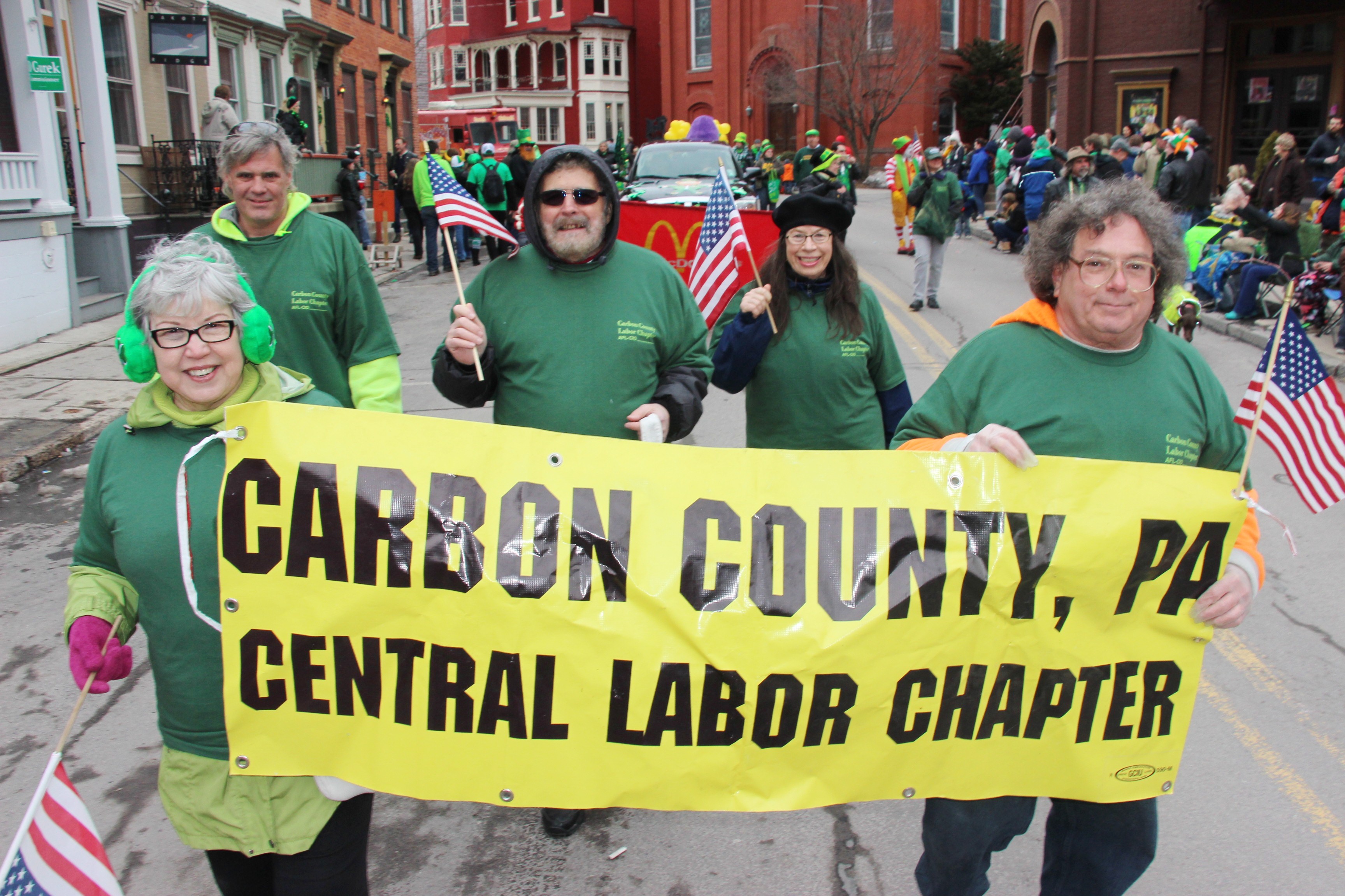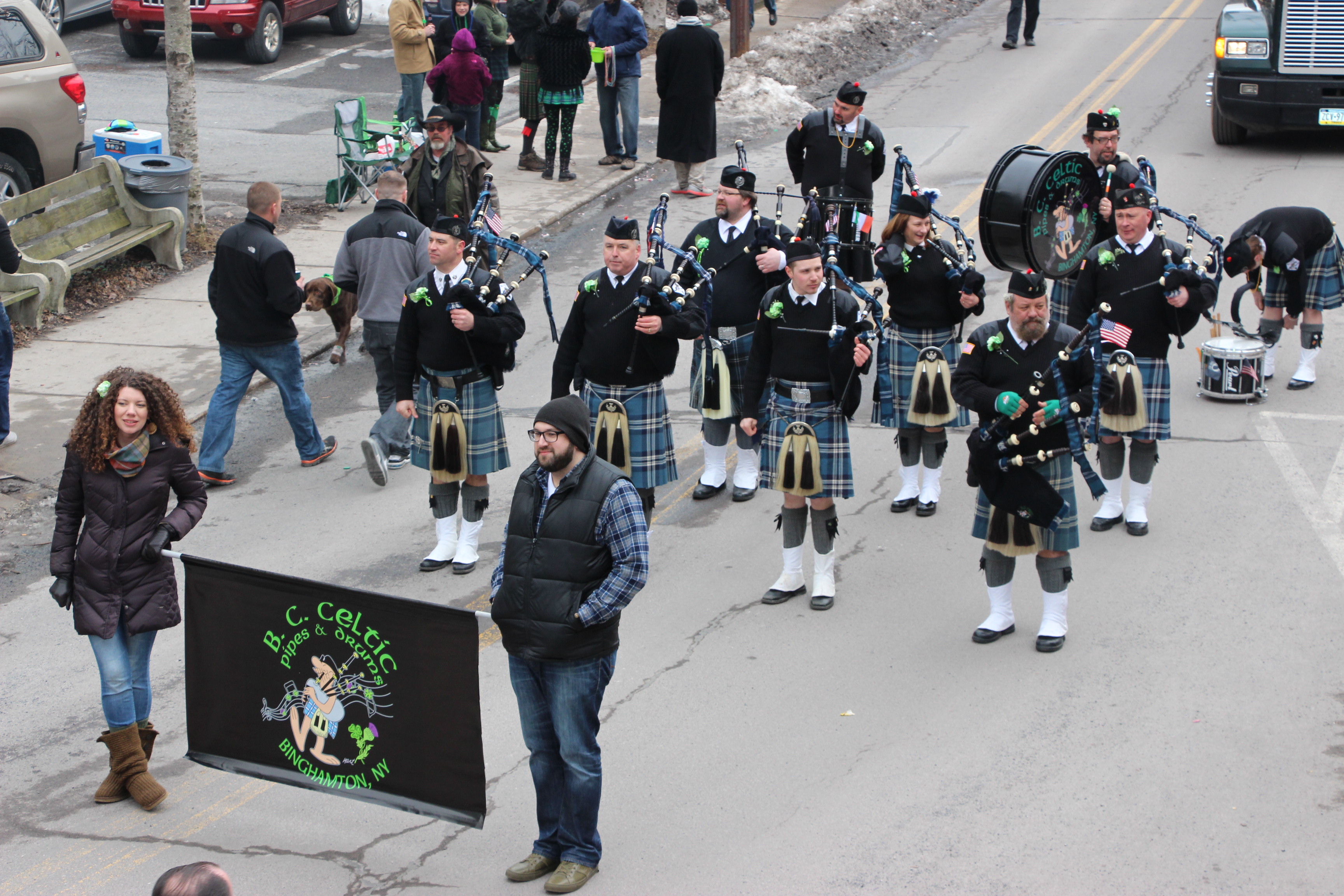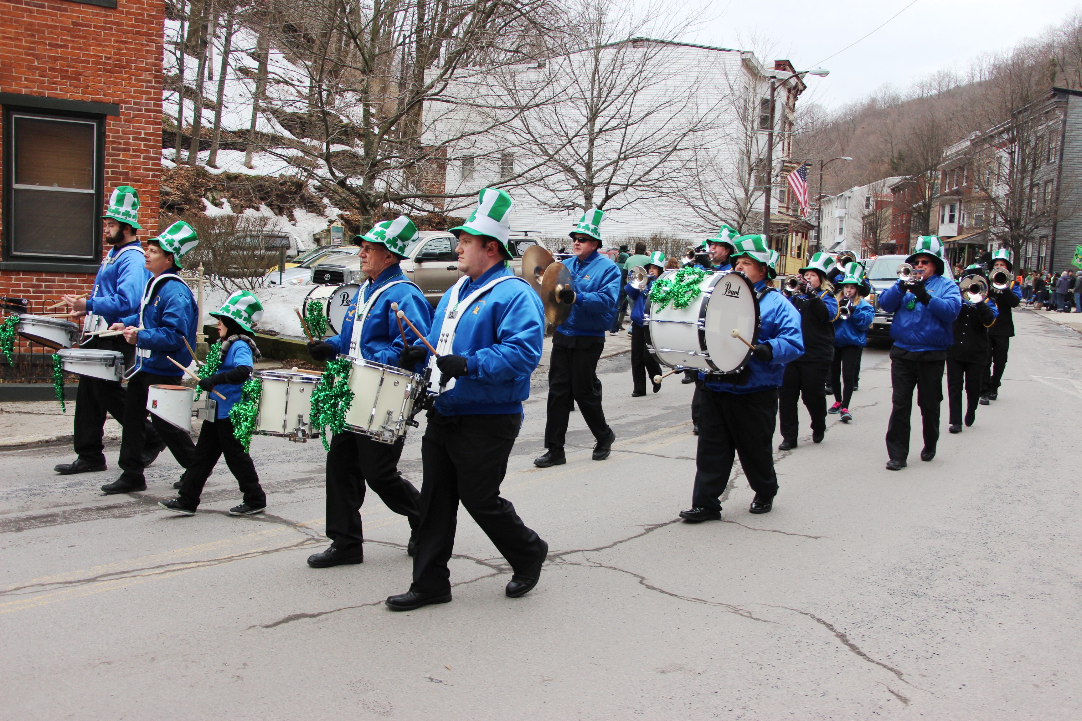 Jim Thorpe Police Department Cruiser and Mayor Michael Sofranko, Banner of St. Patrick, Grand Marshal Gary Dobias, Aides to the Grand Marshal, Lochiel Emerald Society Pipe and Drums, Ancient Order of Hibernians, Carbon County Chapter; Ladies Ancient Order of Hibernians, Carbon County Chapter; Chuck Thamarus Truck; California Raisins Volkswagon Beetle; Jim Thorpe Area High School Band; Congressman Matthew Cartwright; State Senator John Yudichak; State Representative Doyle Heffley; Carbon County Commissioners Thomas J. Gerhard, Wayne Nothstein and William O’Gurek; District Attorney Jean Engler; Carbon County Prothonotary Joann Behrens; Carbon County Director of Veterans’ Affairs Henry Desrosiers; Ceol Neamh; Lehigh County Ancient Order of Hibernians; Schuylkill-Carbon Marine Corps League Detachment 626; Quitapahilla Highlanders Pipe Band; U.S. Postal Service truck; Eclectic Circus; Bear Creek Golf Carts; and Sinister Rouge Pin Up and More.
