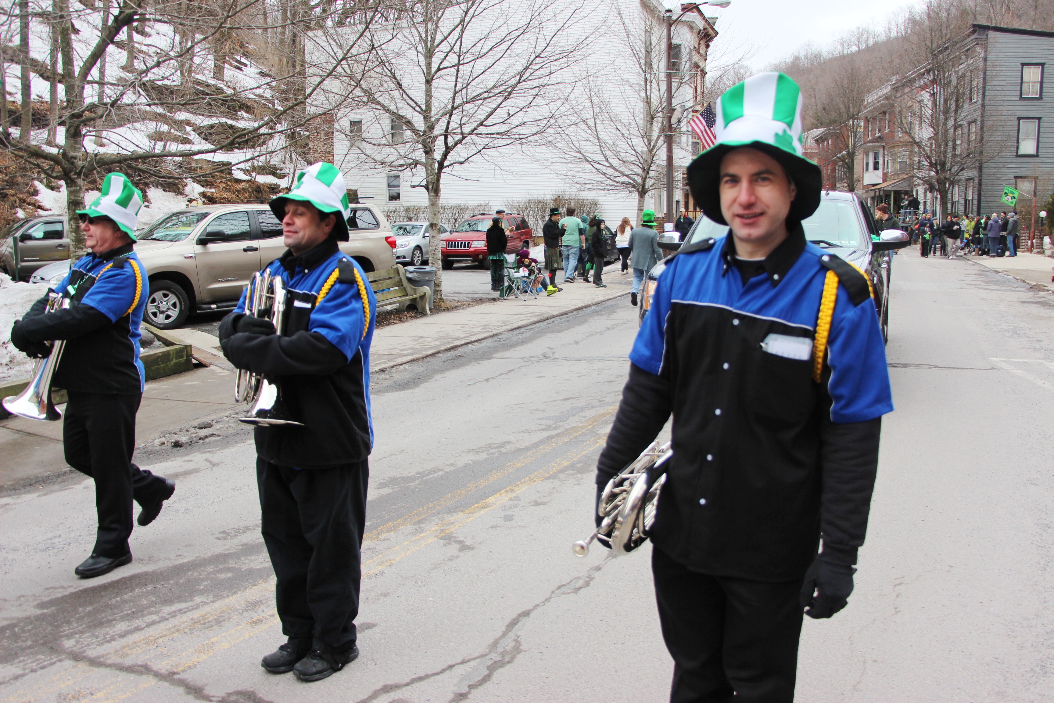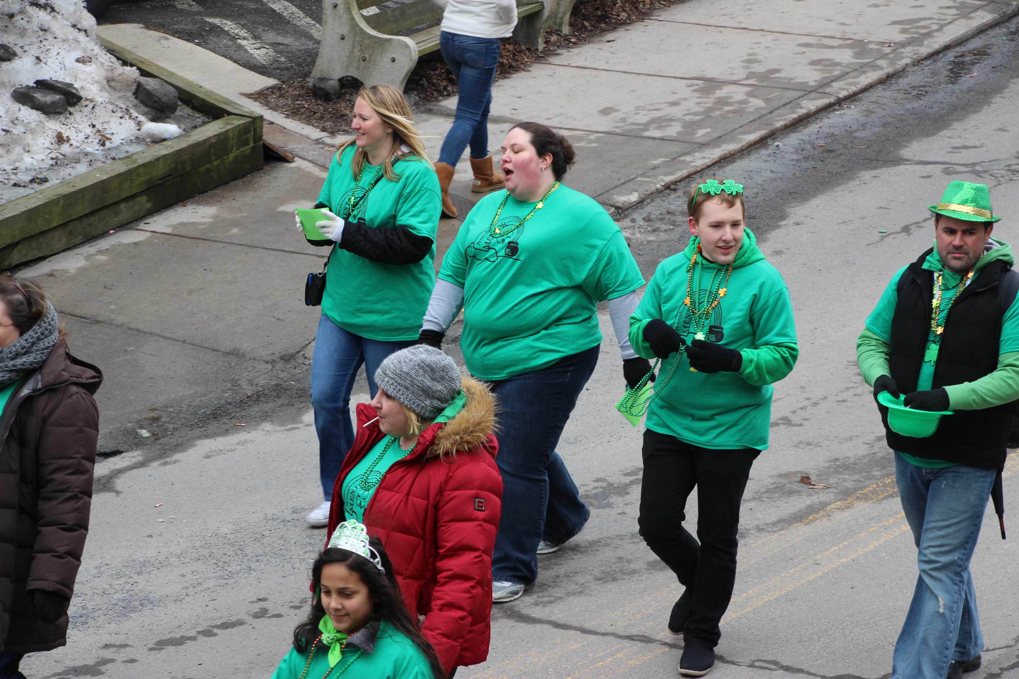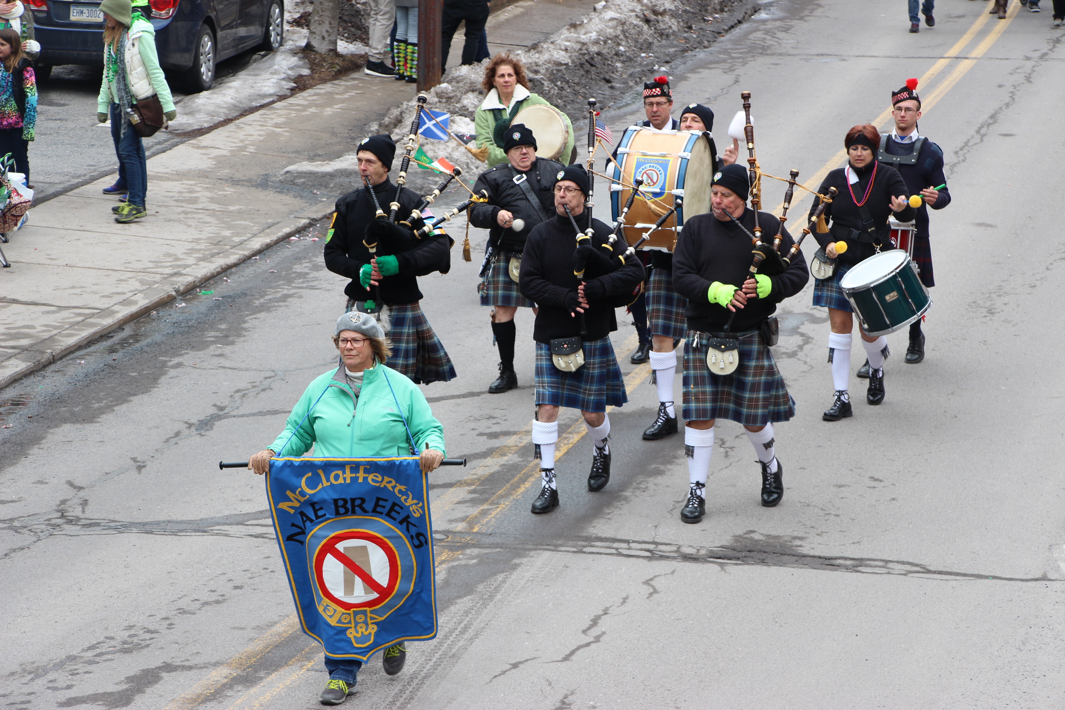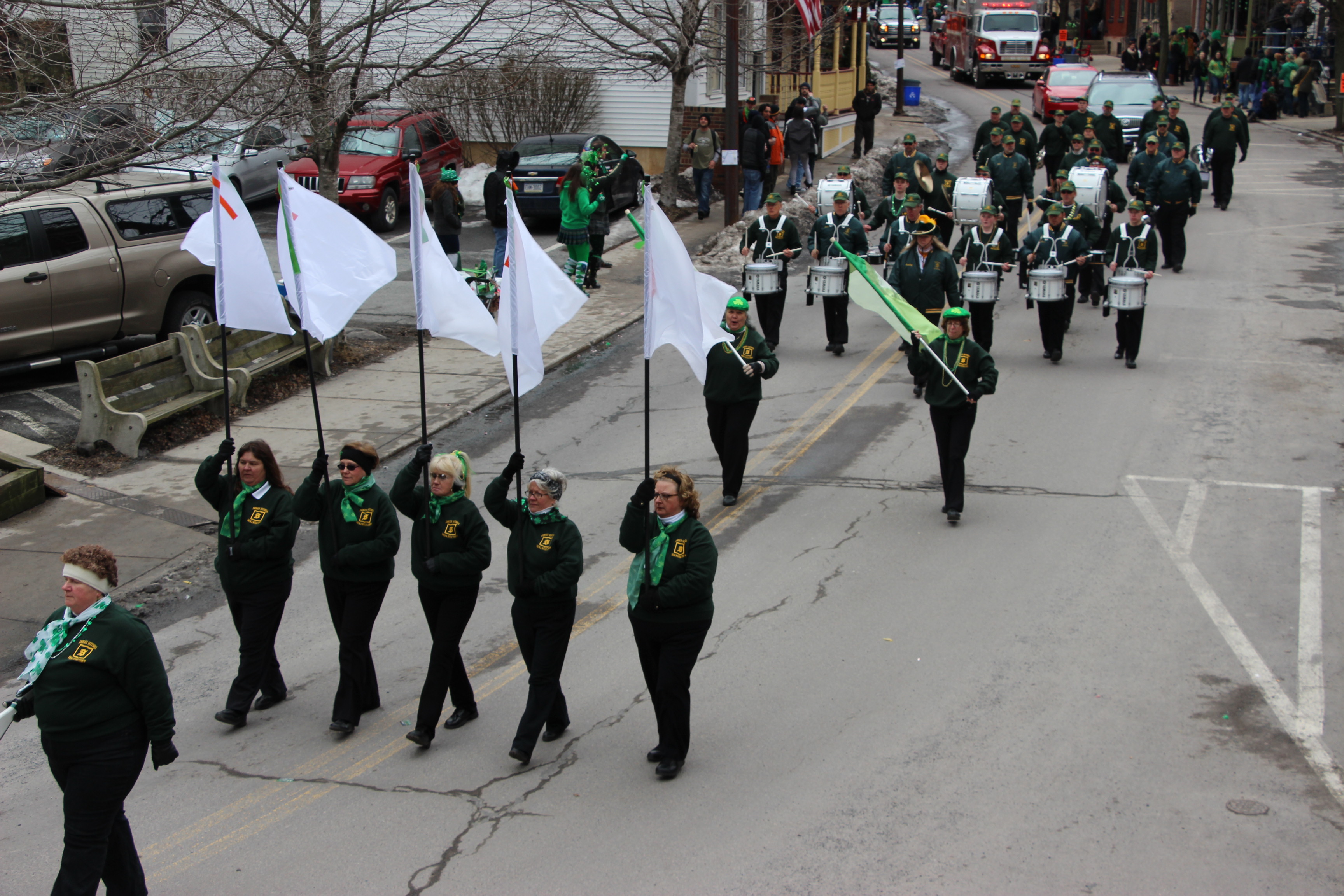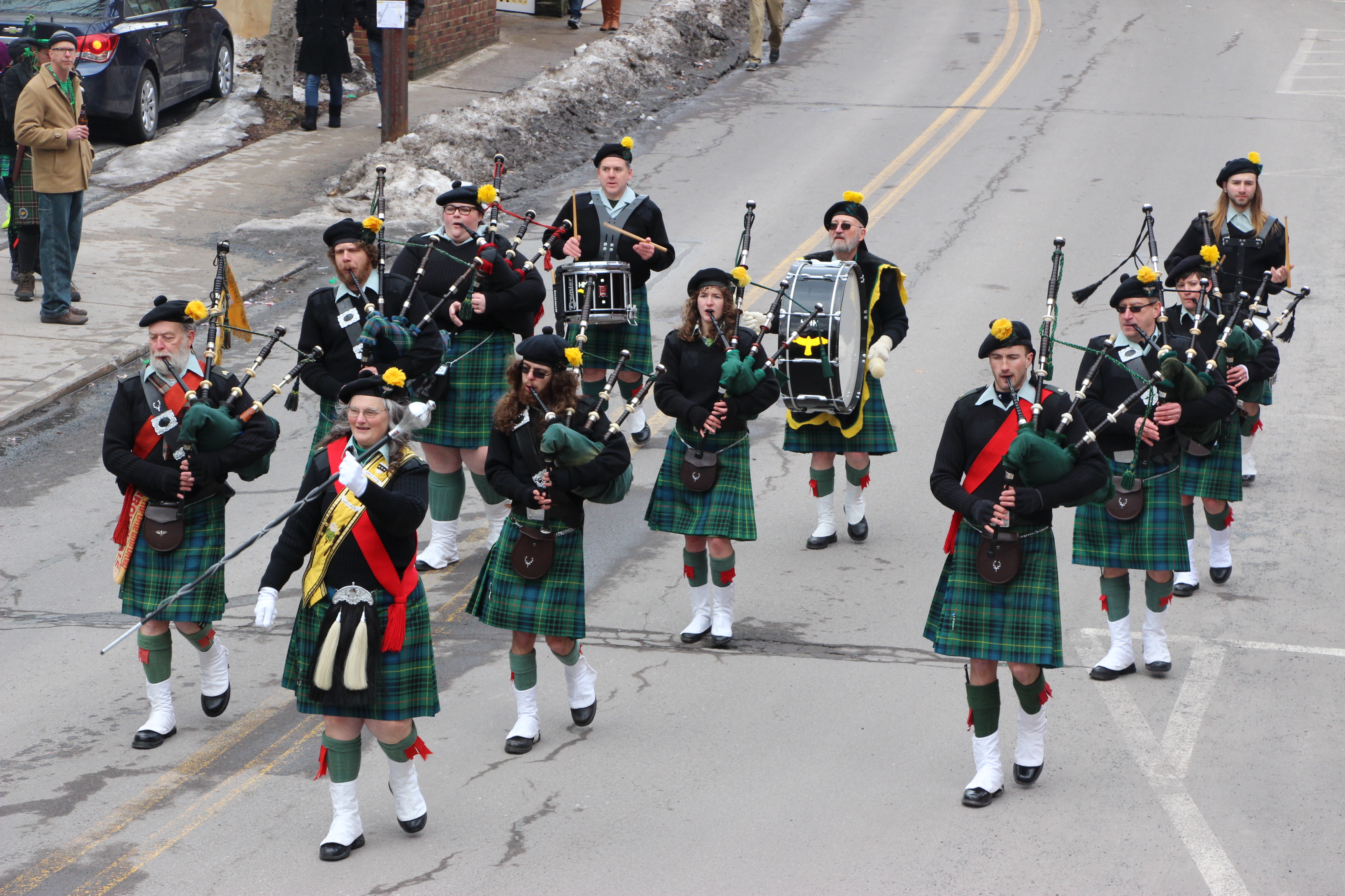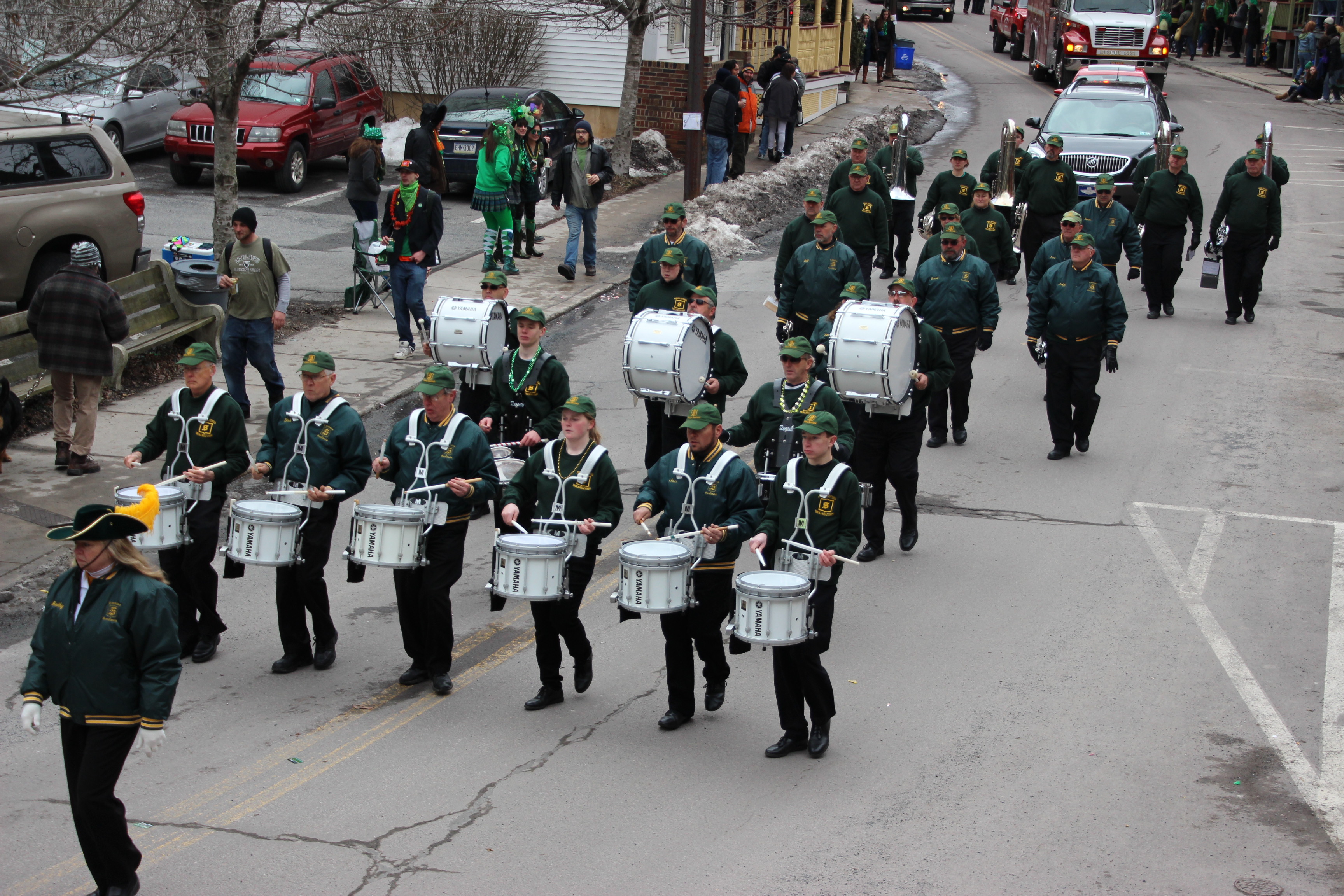 Jim Thorpe Police Department Cruiser and Mayor Michael Sofranko, Banner of St. Patrick, Grand Marshal Gary Dobias, Aides to the Grand Marshal, Lochiel Emerald Society Pipe and Drums, Ancient Order of Hibernians, Carbon County Chapter; Ladies Ancient Order of Hibernians, Carbon County Chapter; Chuck Thamarus Truck; California Raisins Volkswagon Beetle; Jim Thorpe Area High School Band; Congressman Matthew Cartwright; State Senator John Yudichak; State Representative Doyle Heffley; Carbon County Commissioners Thomas J. Gerhard, Wayne Nothstein and William O’Gurek; District Attorney Jean Engler; Carbon County Prothonotary Joann Behrens; Carbon County Director of Veterans’ Affairs Henry Desrosiers; Ceol Neamh; Lehigh County Ancient Order of Hibernians; Schuylkill-Carbon Marine Corps League Detachment 626; Quitapahilla Highlanders Pipe Band; U.S. Postal Service truck; Eclectic Circus; Bear Creek Golf Carts; and Sinister Rouge Pin Up and More.