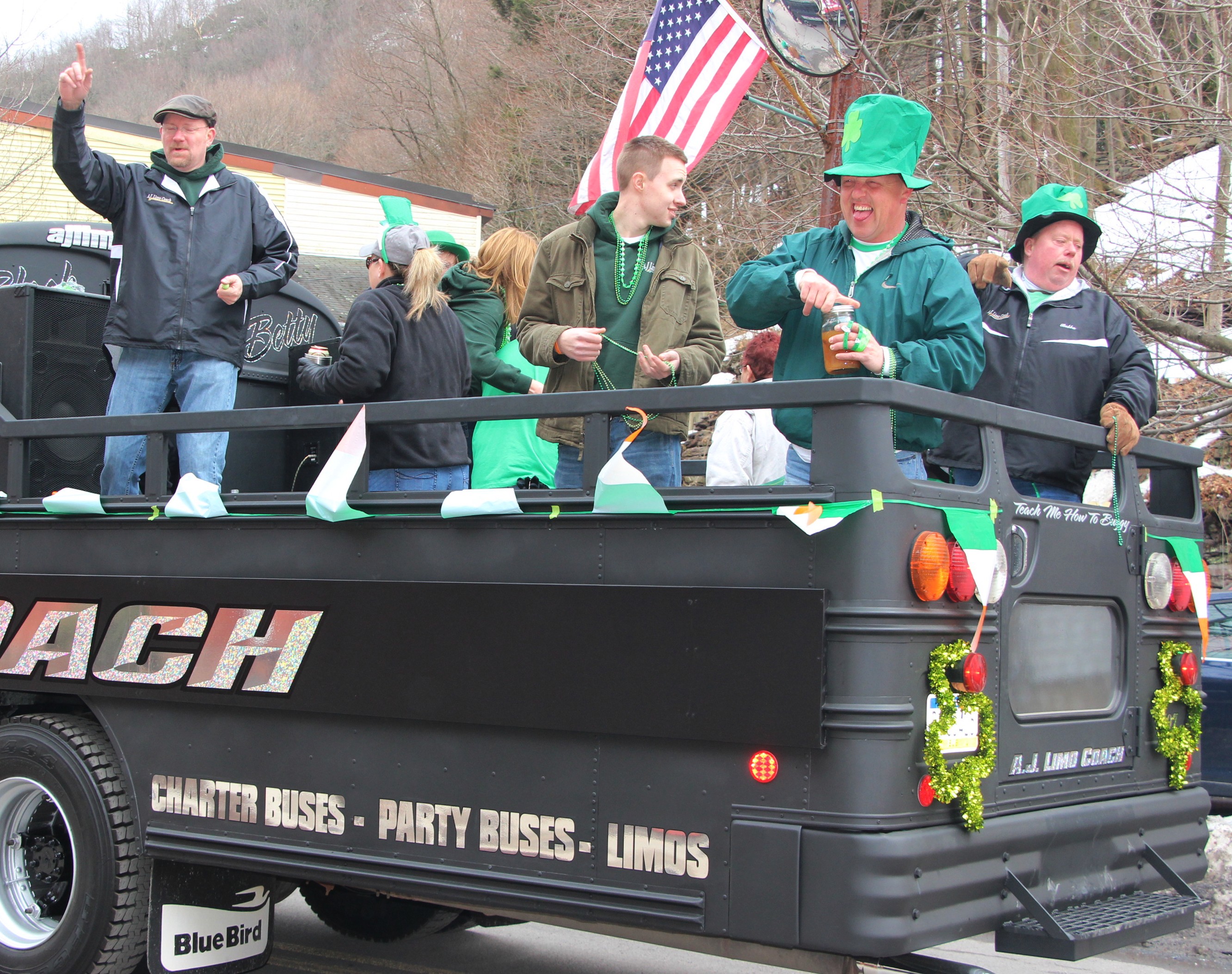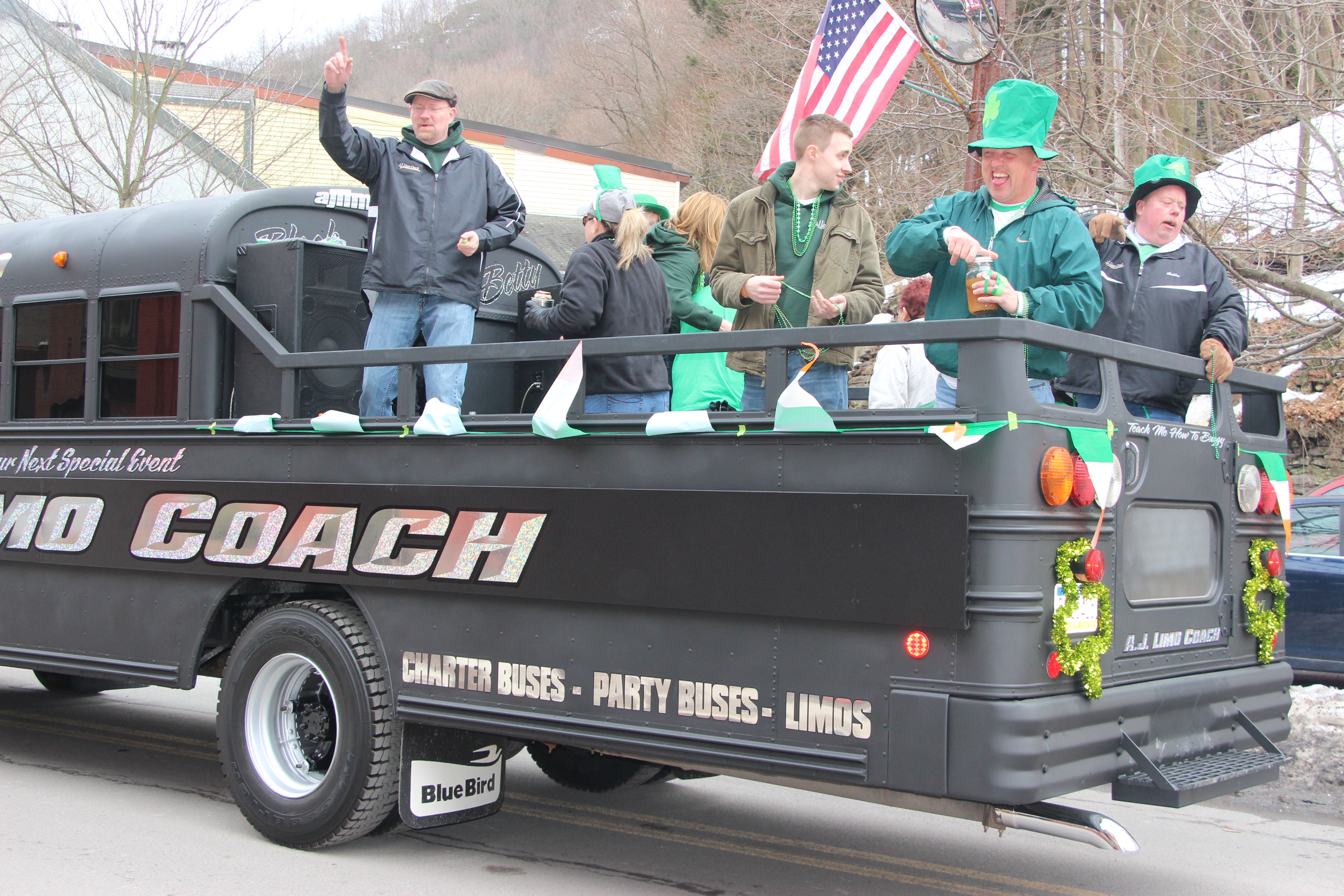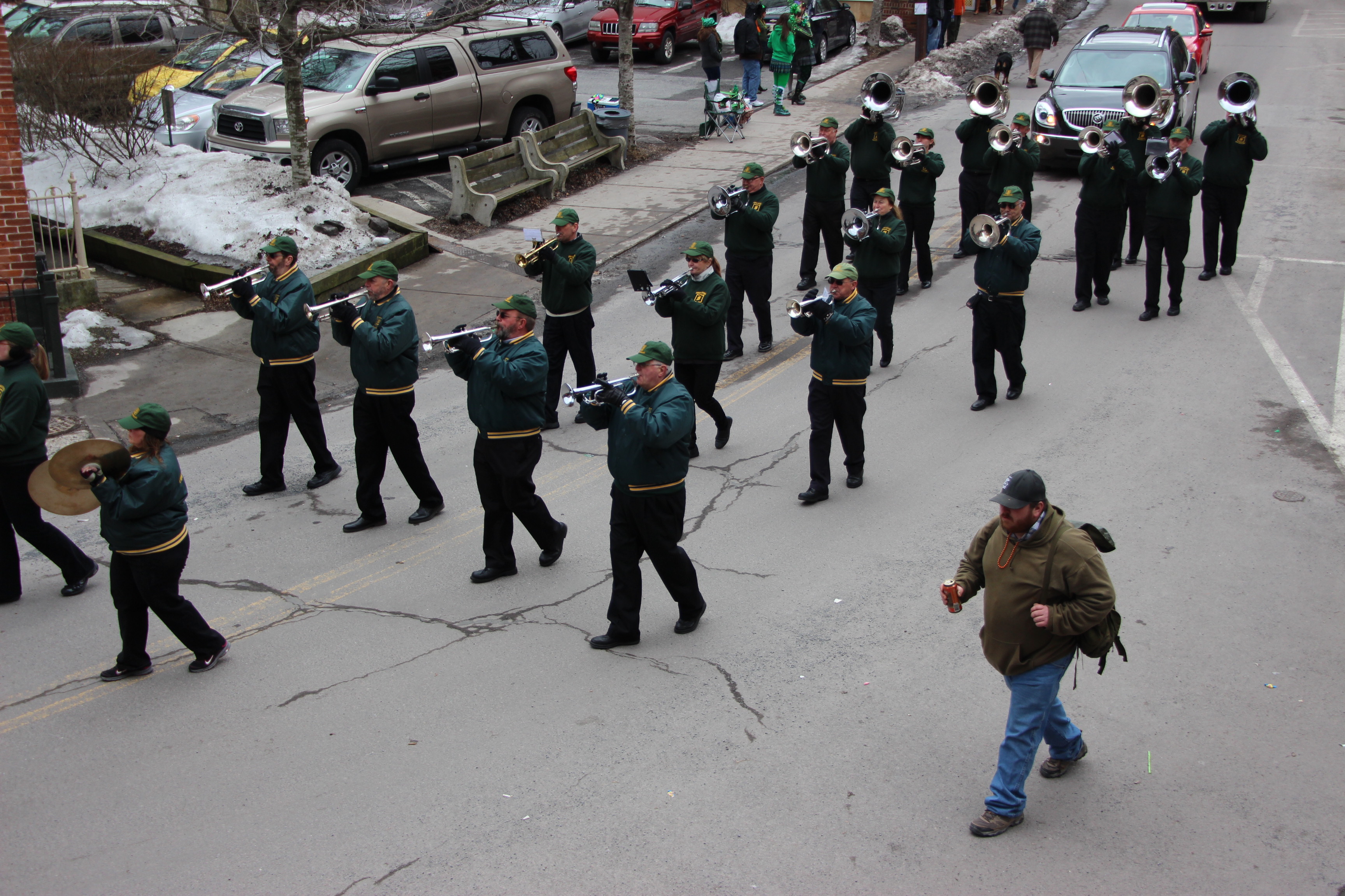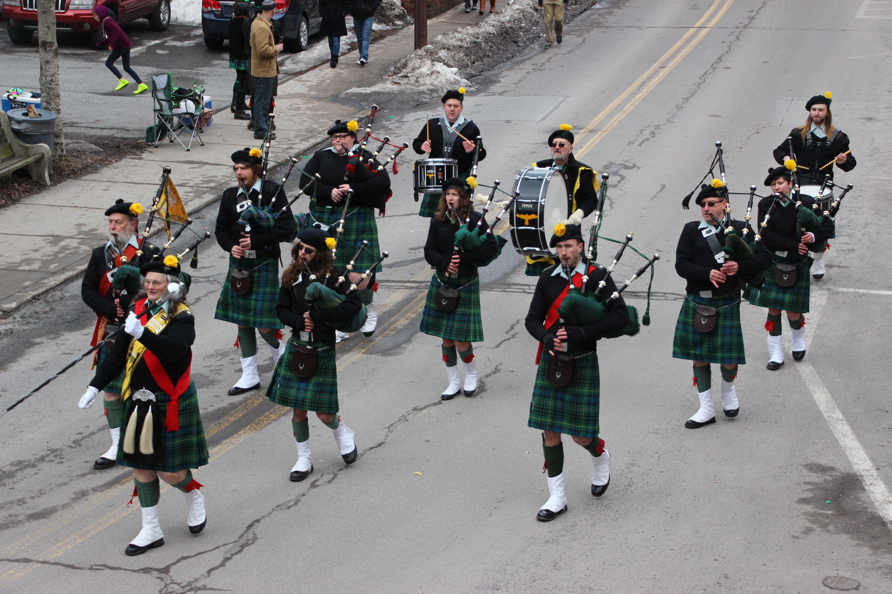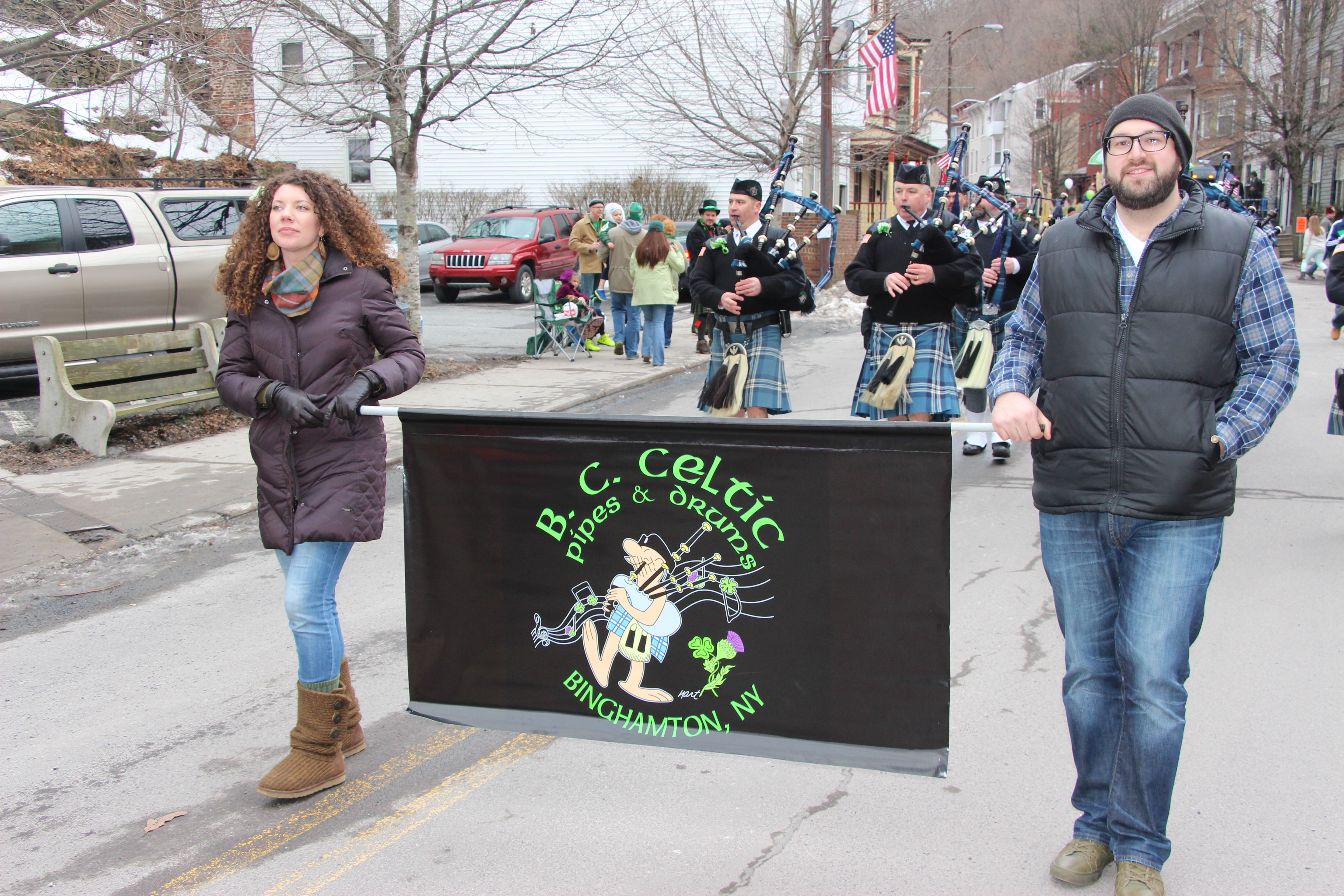Jim Thorpe Police Department Cruiser and Mayor Michael Sofranko, Banner of St. Patrick, Grand Marshal Gary Dobias, Aides to the Grand Marshal, Lochiel Emerald Society Pipe and Drums, Ancient Order of Hibernians, Carbon County Chapter; Ladies Ancient Order of Hibernians, Carbon County Chapter; Chuck Thamarus Truck; California Raisins Volkswagon Beetle; Jim Thorpe Area High School Band; Congressman Matthew Cartwright; State Senator John Yudichak; State Representative Doyle Heffley; Carbon County Commissioners Thomas J. Gerhard, Wayne Nothstein and William O’Gurek; District Attorney Jean Engler; Carbon County Prothonotary Joann Behrens; Carbon County Director of Veterans’ Affairs Henry Desrosiers; Ceol Neamh; Lehigh County Ancient Order of Hibernians; Schuylkill-Carbon Marine Corps League Detachment 626; Quitapahilla Highlanders Pipe Band; U.S. Postal Service truck; Eclectic Circus; Bear Creek Golf Carts; and Sinister Rouge Pin Up and More.