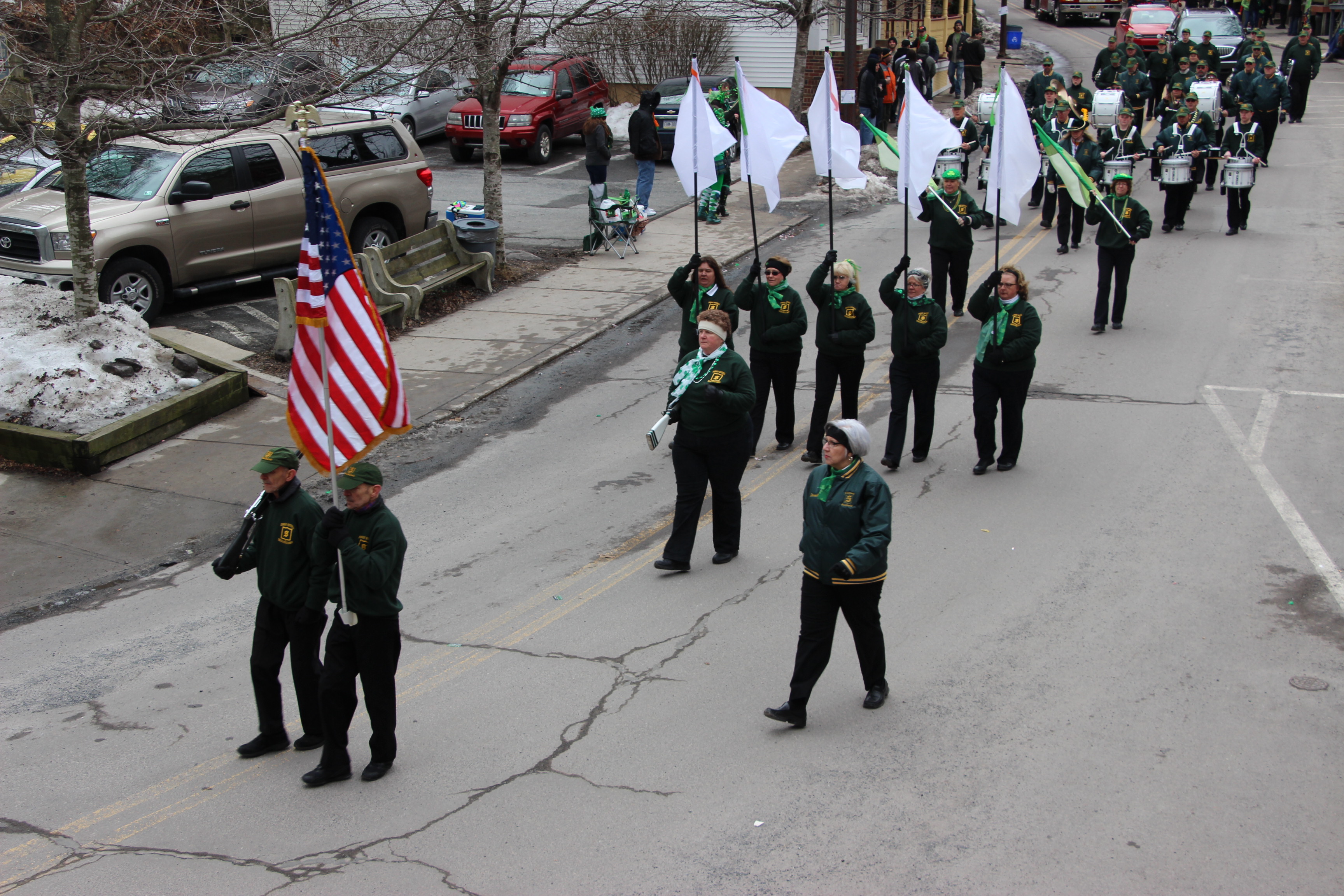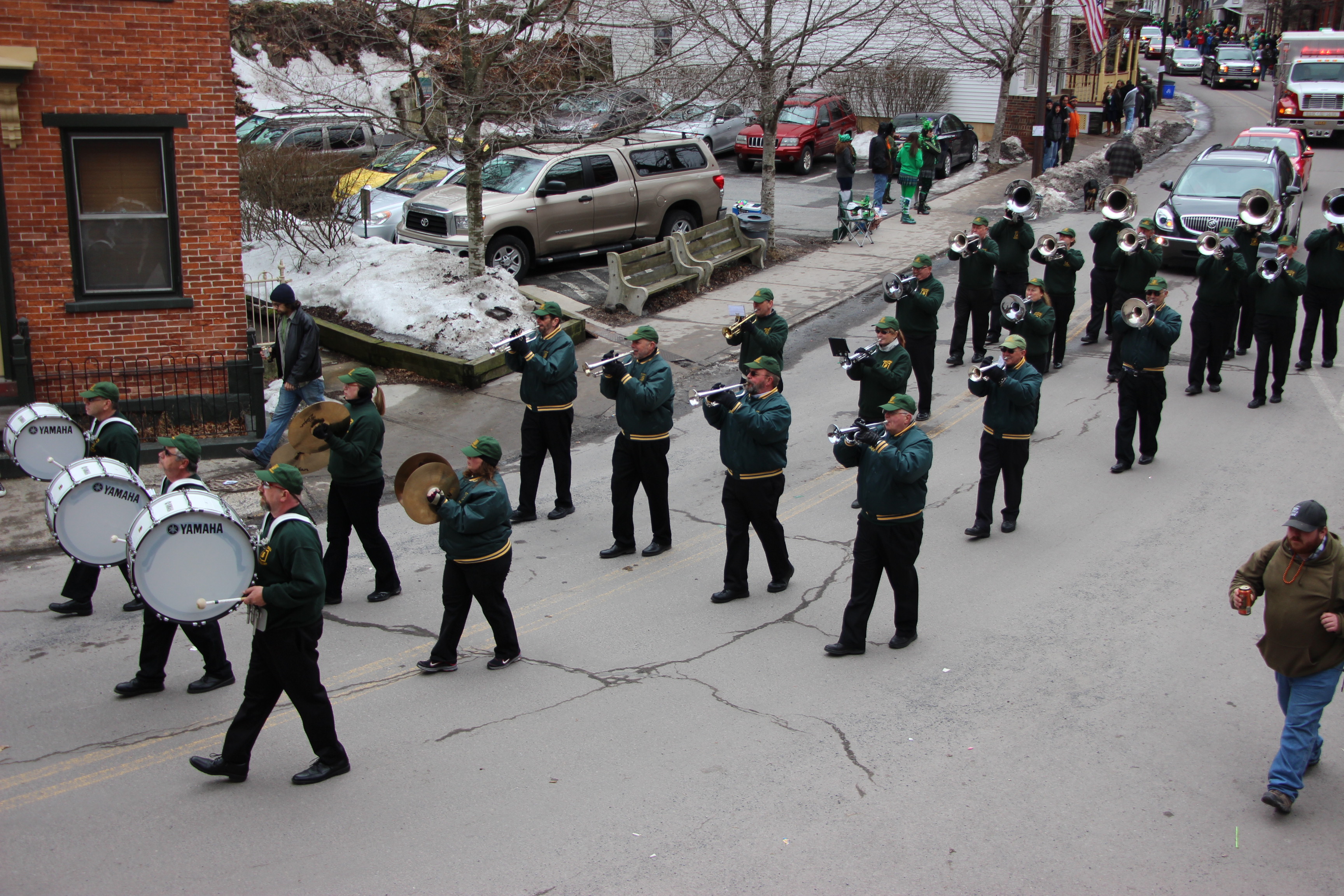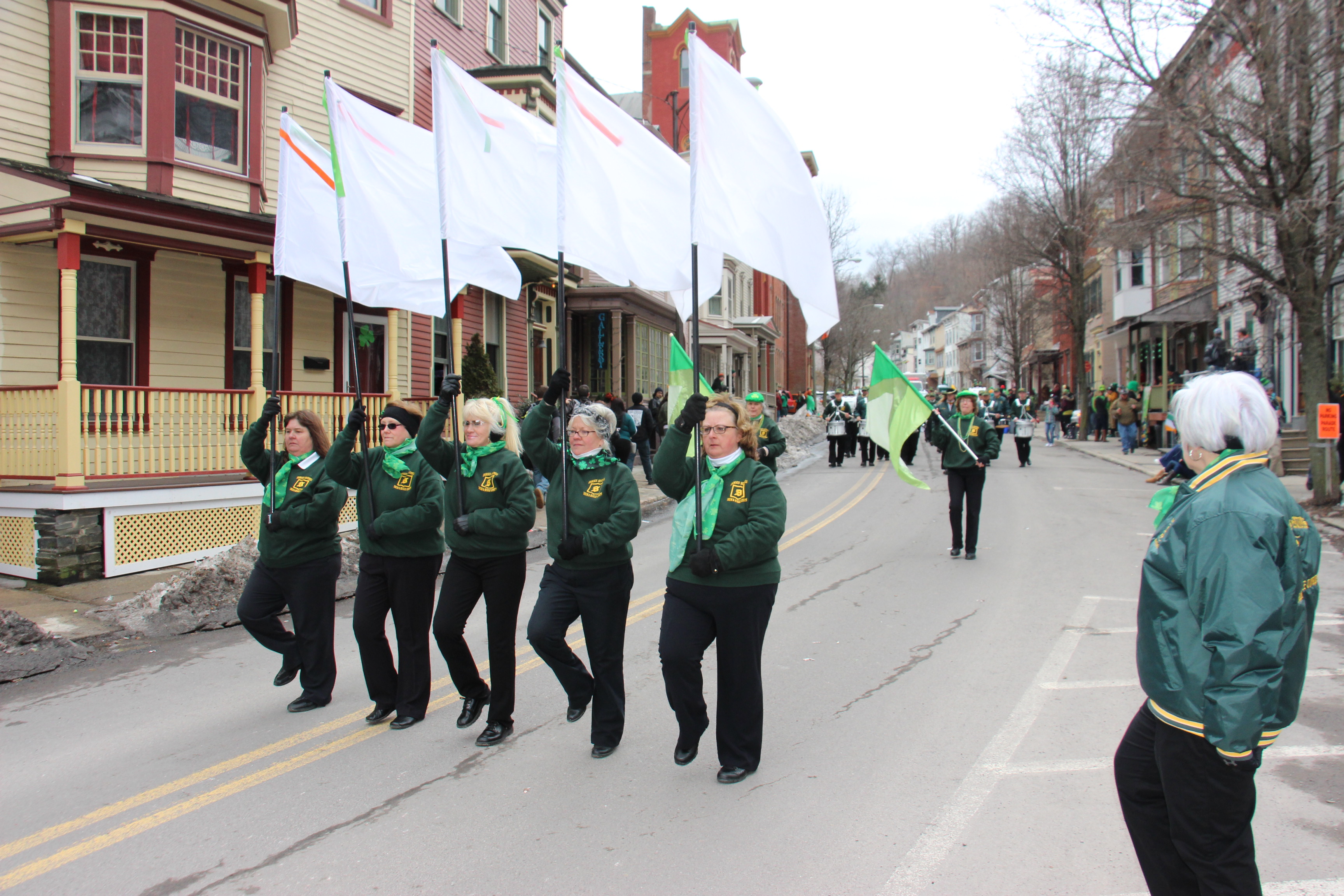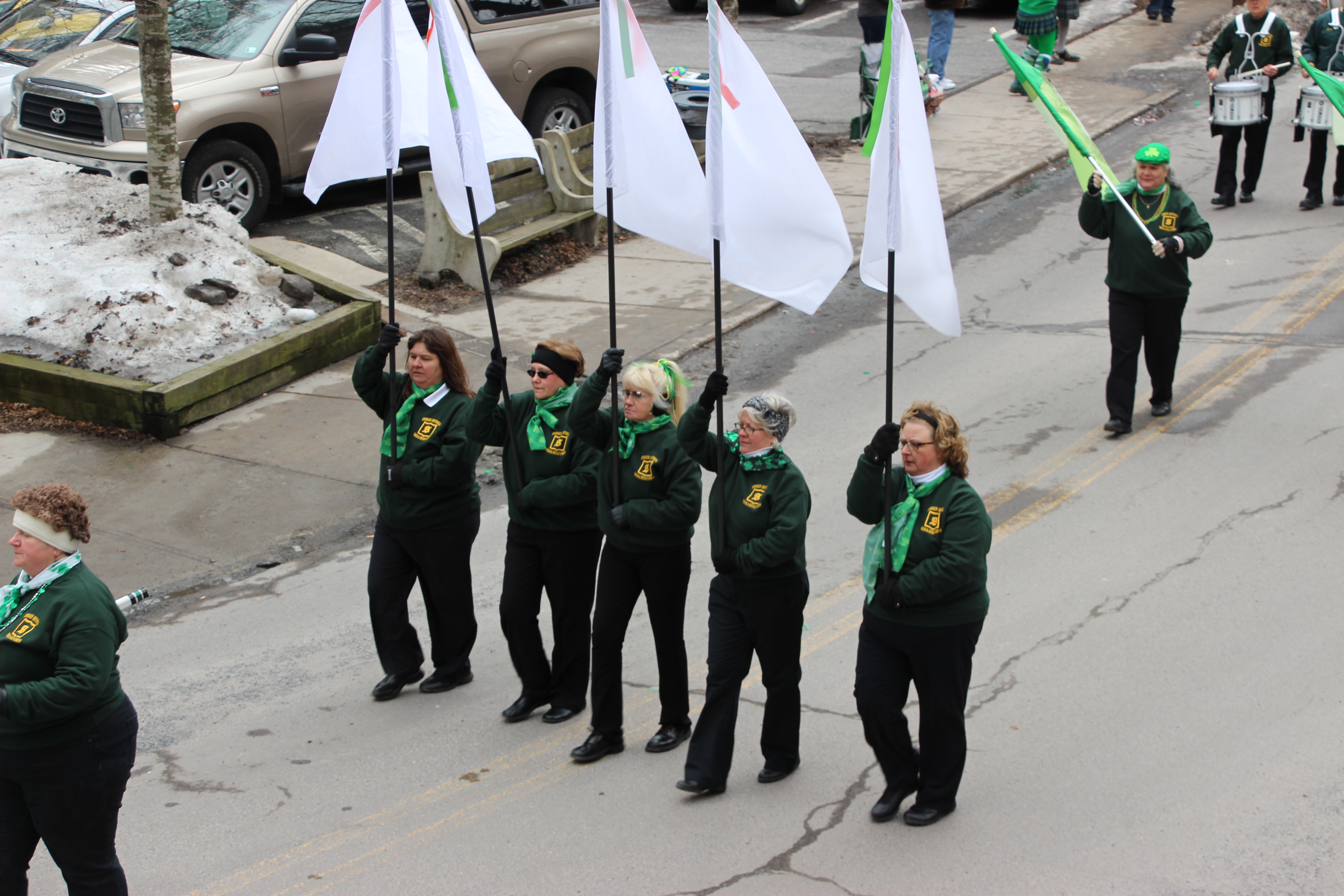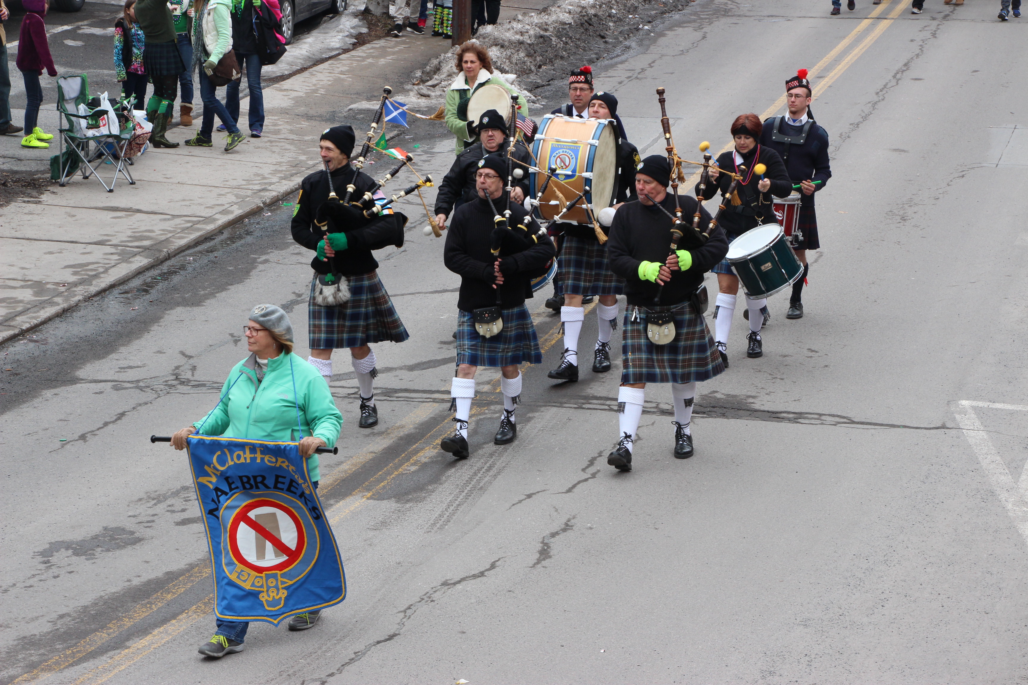 Jim Thorpe Police Department Cruiser and Mayor Michael Sofranko, Banner of St. Patrick, Grand Marshal Gary Dobias, Aides to the Grand Marshal, Lochiel Emerald Society Pipe and Drums, Ancient Order of Hibernians, Carbon County Chapter; Ladies Ancient Order of Hibernians, Carbon County Chapter; Chuck Thamarus Truck; California Raisins Volkswagon Beetle; Jim Thorpe Area High School Band; Congressman Matthew Cartwright; State Senator John Yudichak; State Representative Doyle Heffley; Carbon County Commissioners Thomas J. Gerhard, Wayne Nothstein and William O’Gurek; District Attorney Jean Engler; Carbon County Prothonotary Joann Behrens; Carbon County Director of Veterans’ Affairs Henry Desrosiers; Ceol Neamh; Lehigh County Ancient Order of Hibernians; Schuylkill-Carbon Marine Corps League Detachment 626; Quitapahilla Highlanders Pipe Band; U.S. Postal Service truck; Eclectic Circus; Bear Creek Golf Carts; and Sinister Rouge Pin Up and More.