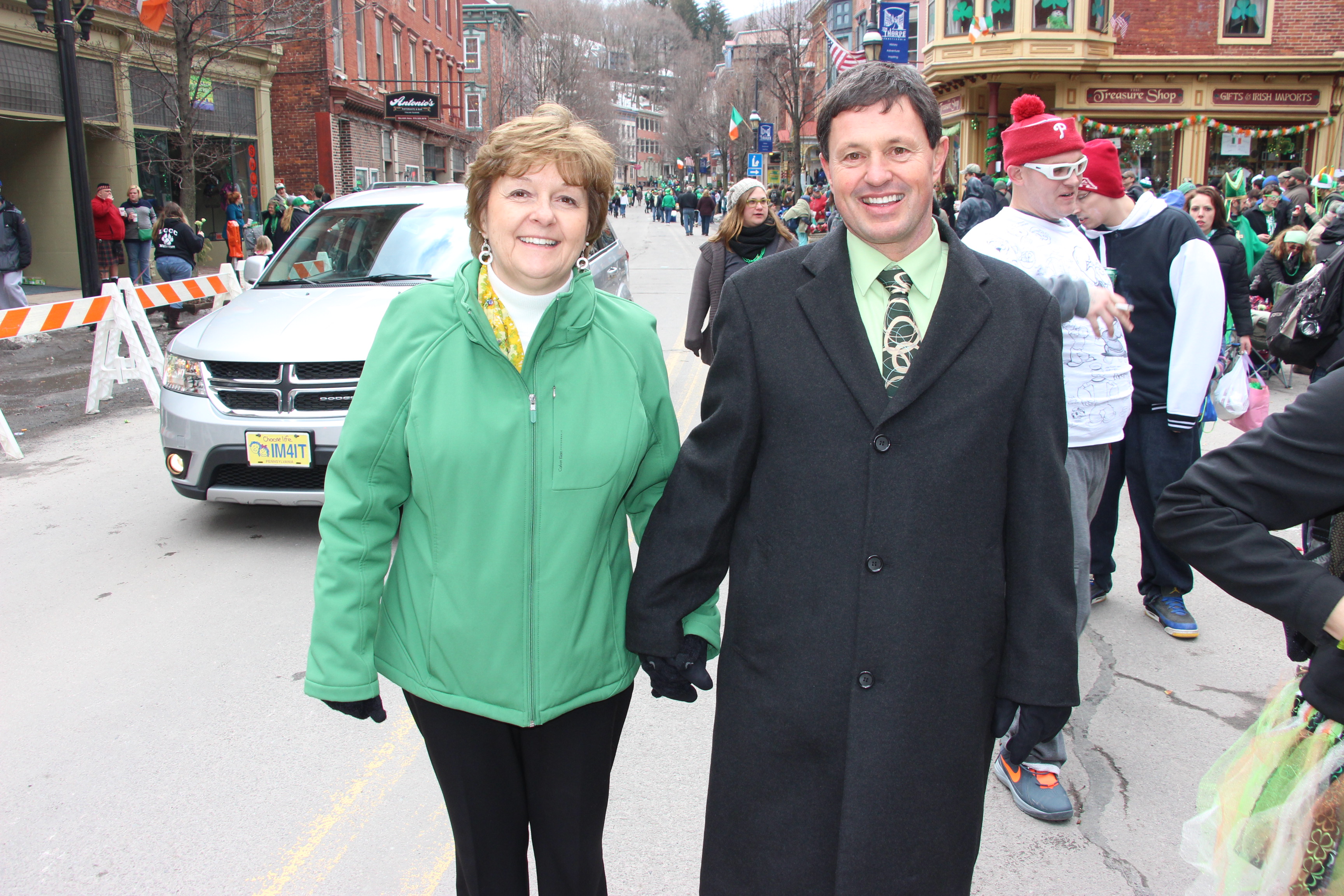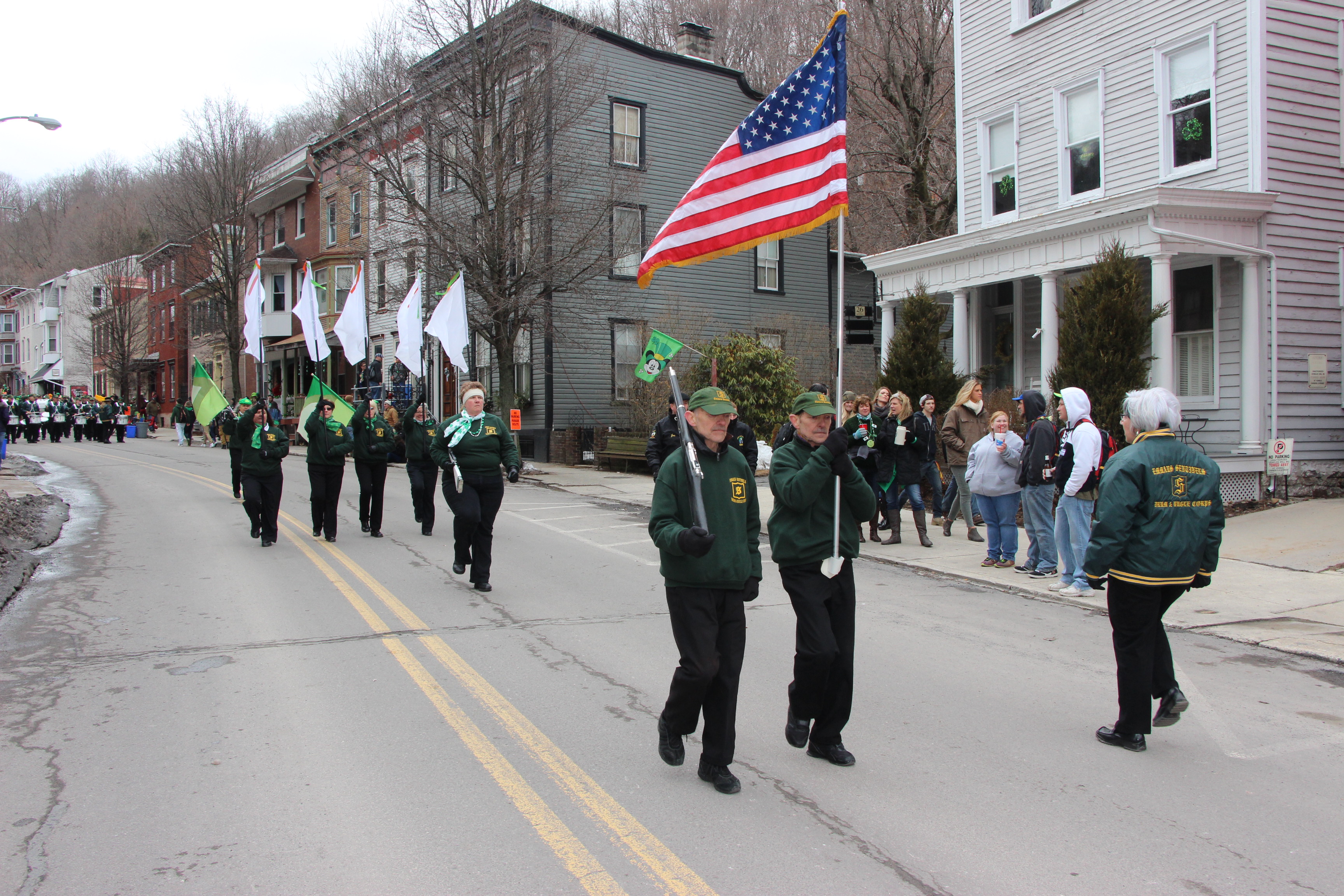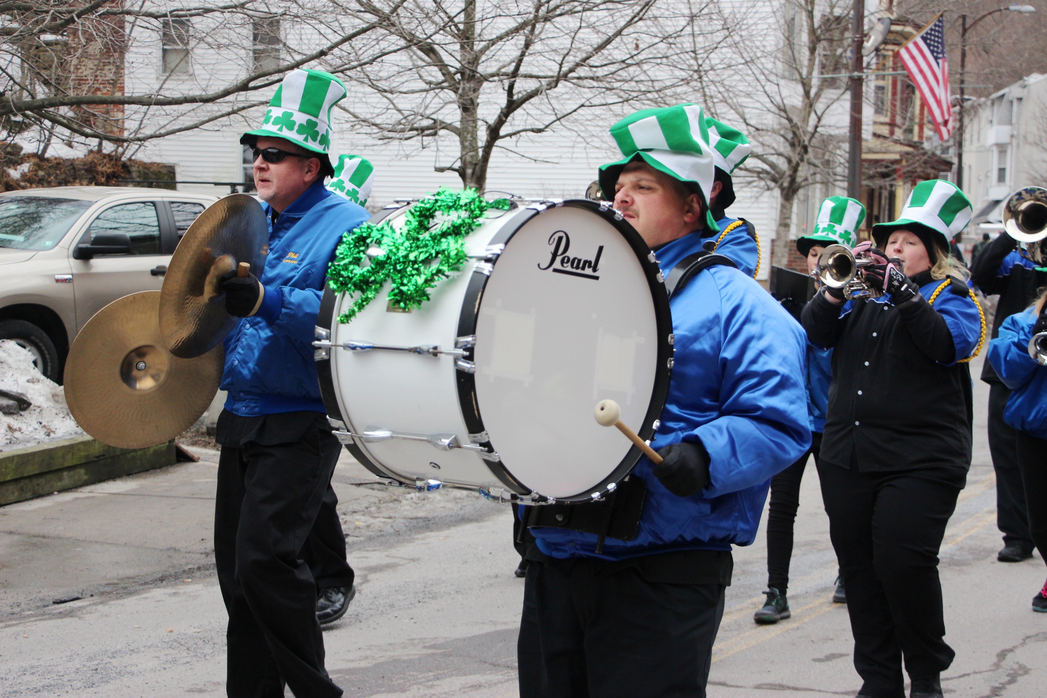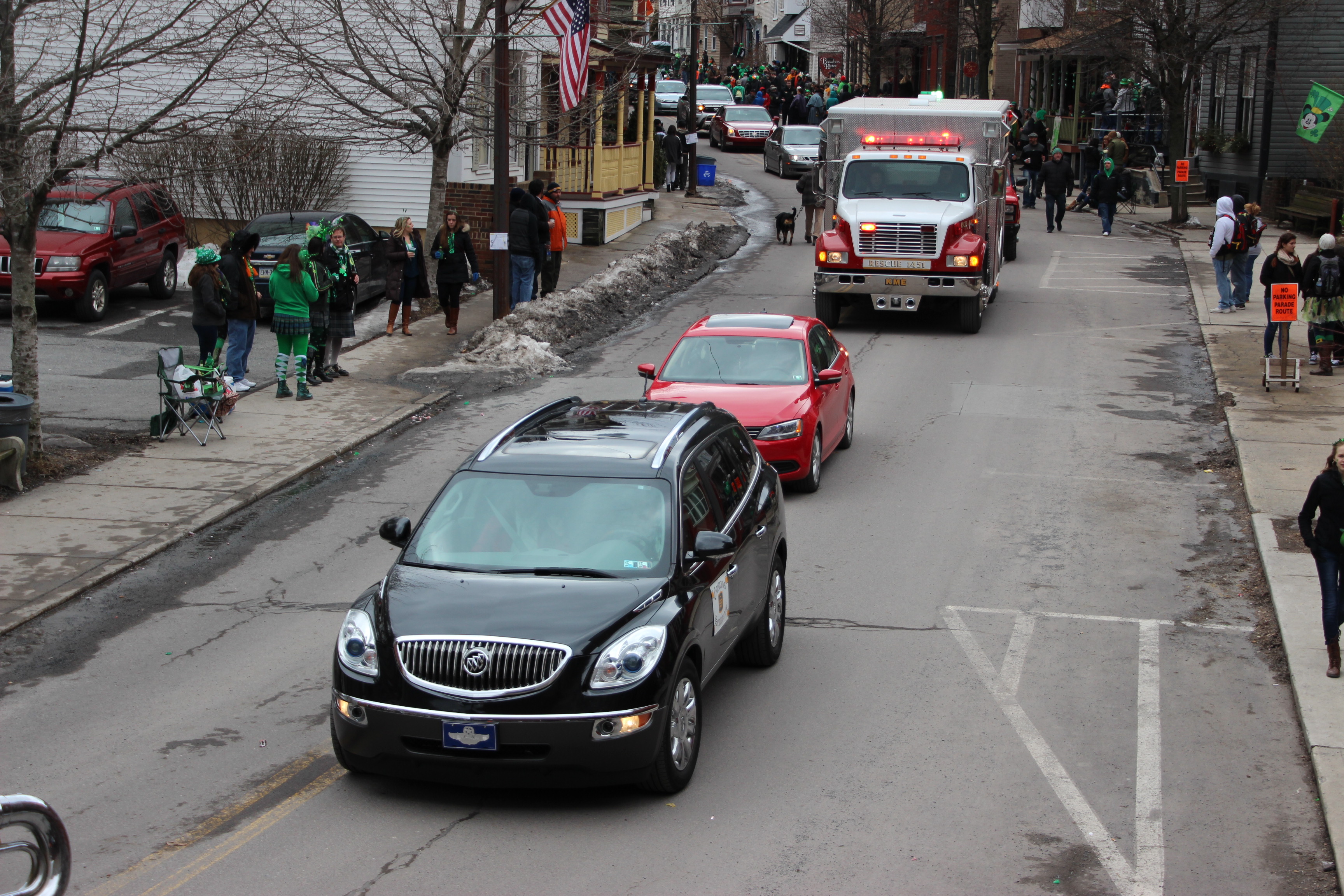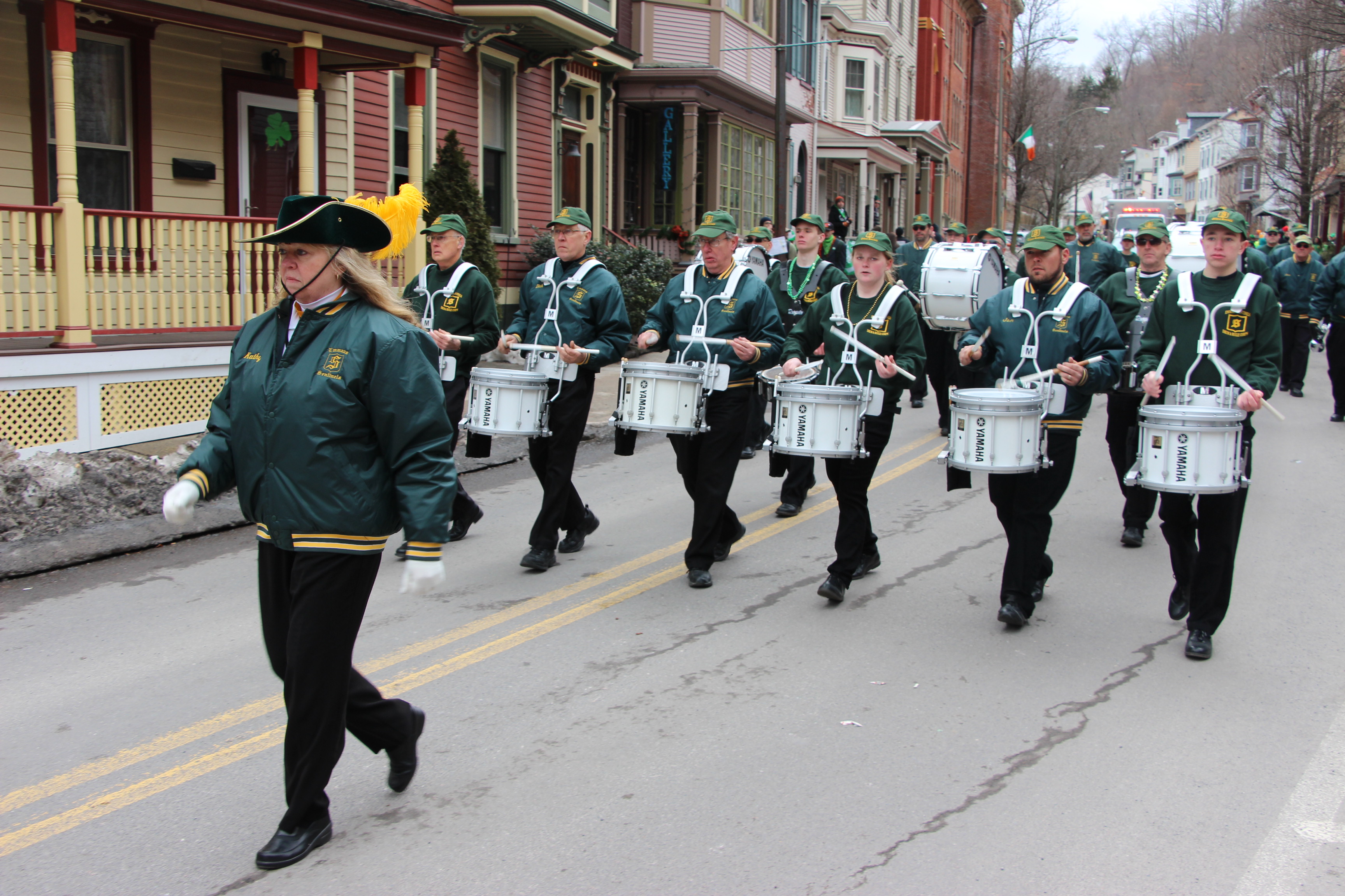 Jim Thorpe Police Department Cruiser and Mayor Michael Sofranko, Banner of St. Patrick, Grand Marshal Gary Dobias, Aides to the Grand Marshal, Lochiel Emerald Society Pipe and Drums, Ancient Order of Hibernians, Carbon County Chapter; Ladies Ancient Order of Hibernians, Carbon County Chapter; Chuck Thamarus Truck; California Raisins Volkswagon Beetle; Jim Thorpe Area High School Band; Congressman Matthew Cartwright; State Senator John Yudichak; State Representative Doyle Heffley; Carbon County Commissioners Thomas J. Gerhard, Wayne Nothstein and William O’Gurek; District Attorney Jean Engler; Carbon County Prothonotary Joann Behrens; Carbon County Director of Veterans’ Affairs Henry Desrosiers; Ceol Neamh; Lehigh County Ancient Order of Hibernians; Schuylkill-Carbon Marine Corps League Detachment 626; Quitapahilla Highlanders Pipe Band; U.S. Postal Service truck; Eclectic Circus; Bear Creek Golf Carts; and Sinister Rouge Pin Up and More.