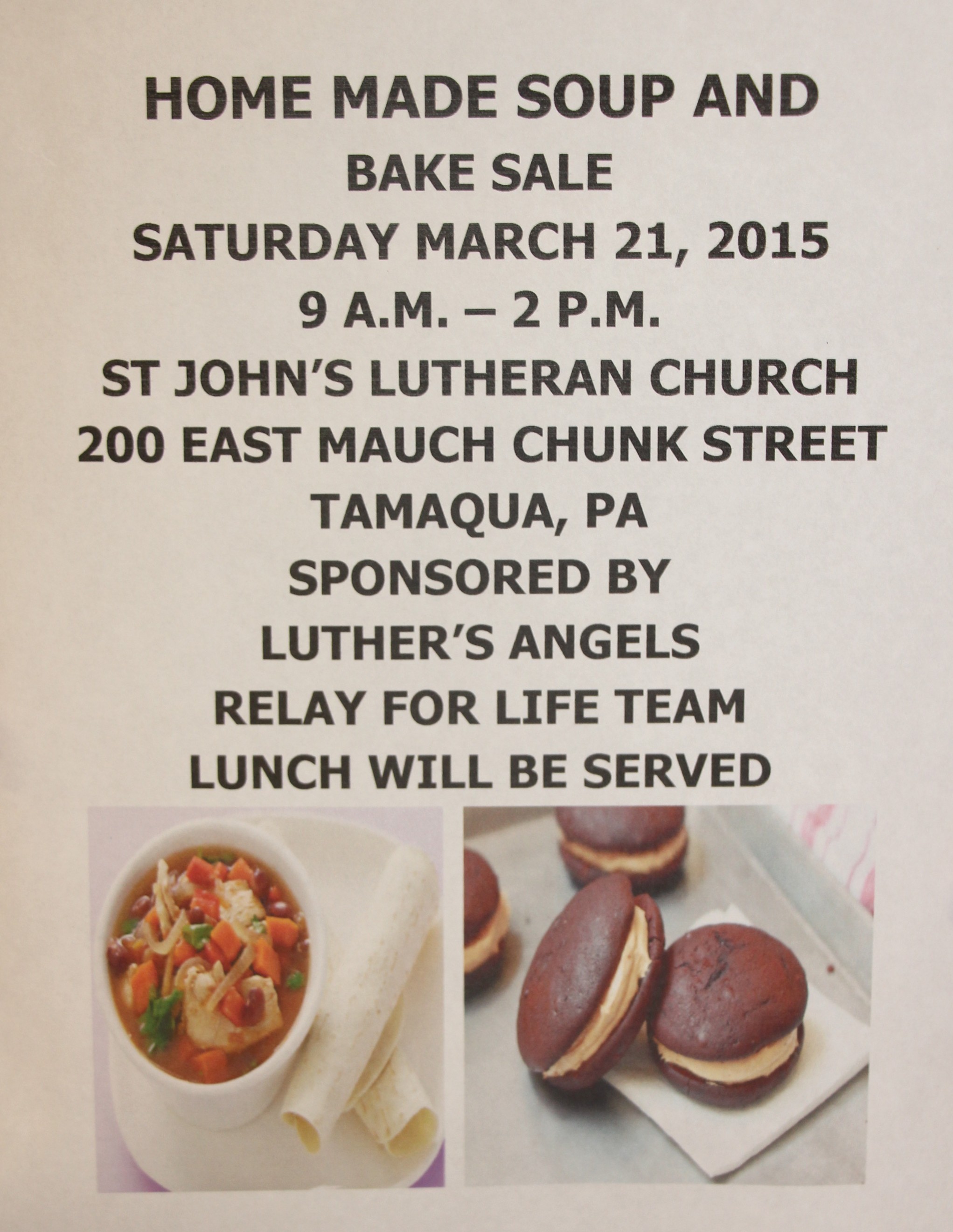 Luther’s Angels, Tamaqua/PV Area Relay For Life Team, is holding a Homemade Soup and Bake Sale on Saturday, March 21, 2015 at the St. John’s Lutheran Church in Tamaqua.