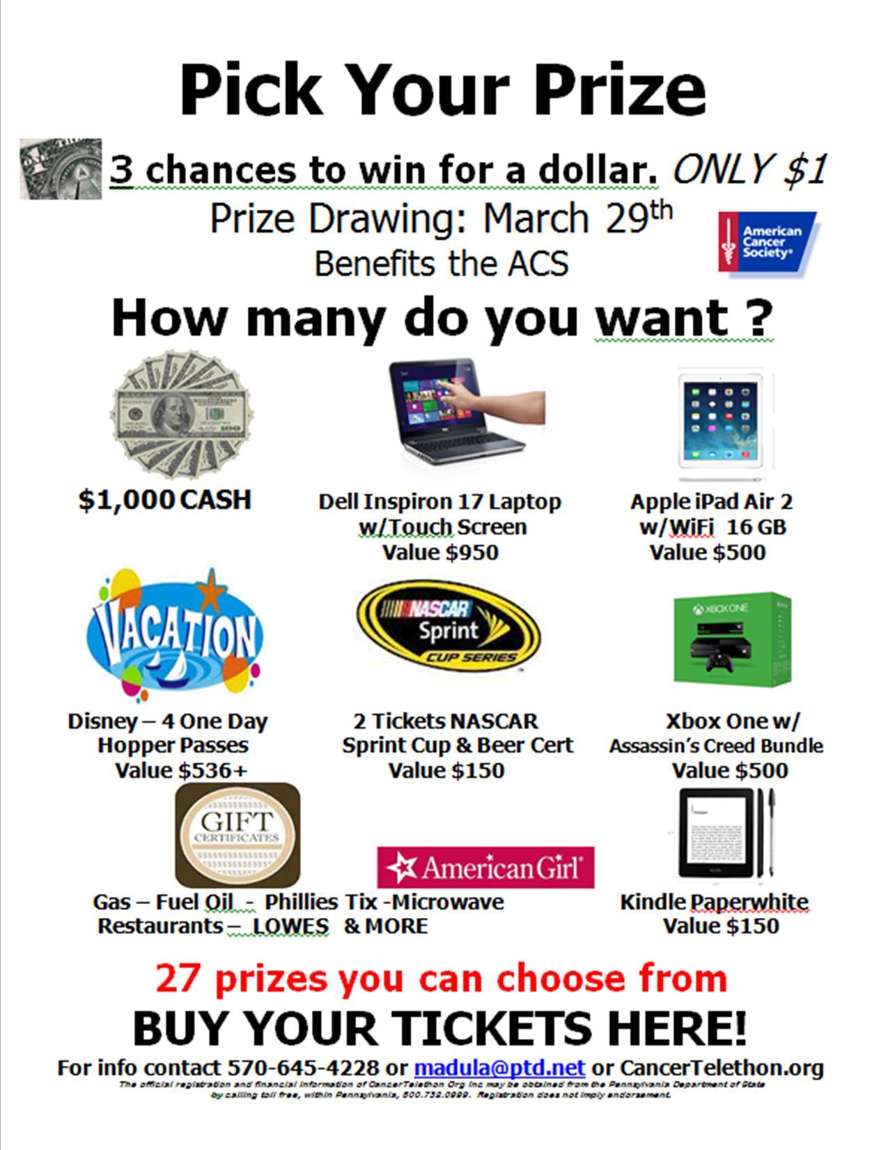 Some of the top prizes on the specially purchased “white ticket” include a Dell laptop computer, $1,000 CASH prize, Apple ipad Air w/wi-fi, 4 Disney Hopper passes, American Girl of the Year, Xbox One w/Assassin’s Creed Bundle, gift certificate for fuel oil, Nascar Sprint Cup Tickets, Gas gift Card, Overnight Stays, Wine Tasting Tour, Fire Pit, Kindle Paperwhite, 50” HD TV, Phillies Tickets, Lowes Gift Cards, Doll House, and area restaurant gift certificate packs.