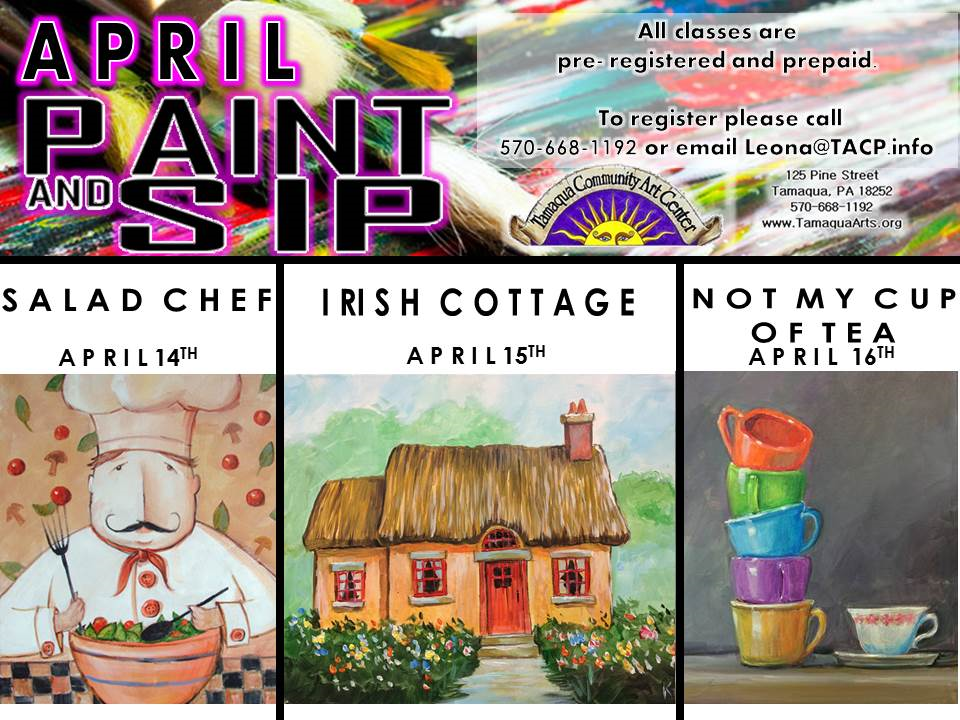 Below is a list of Paint and Sip sessions scheduled for April 2015 at the Tamaqua Community Arts Center.