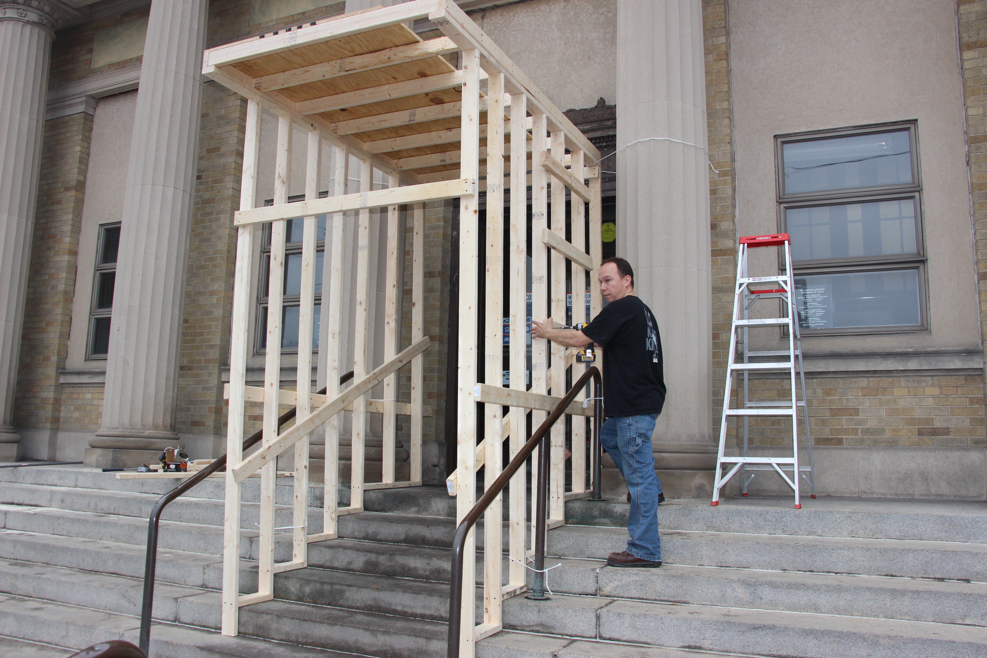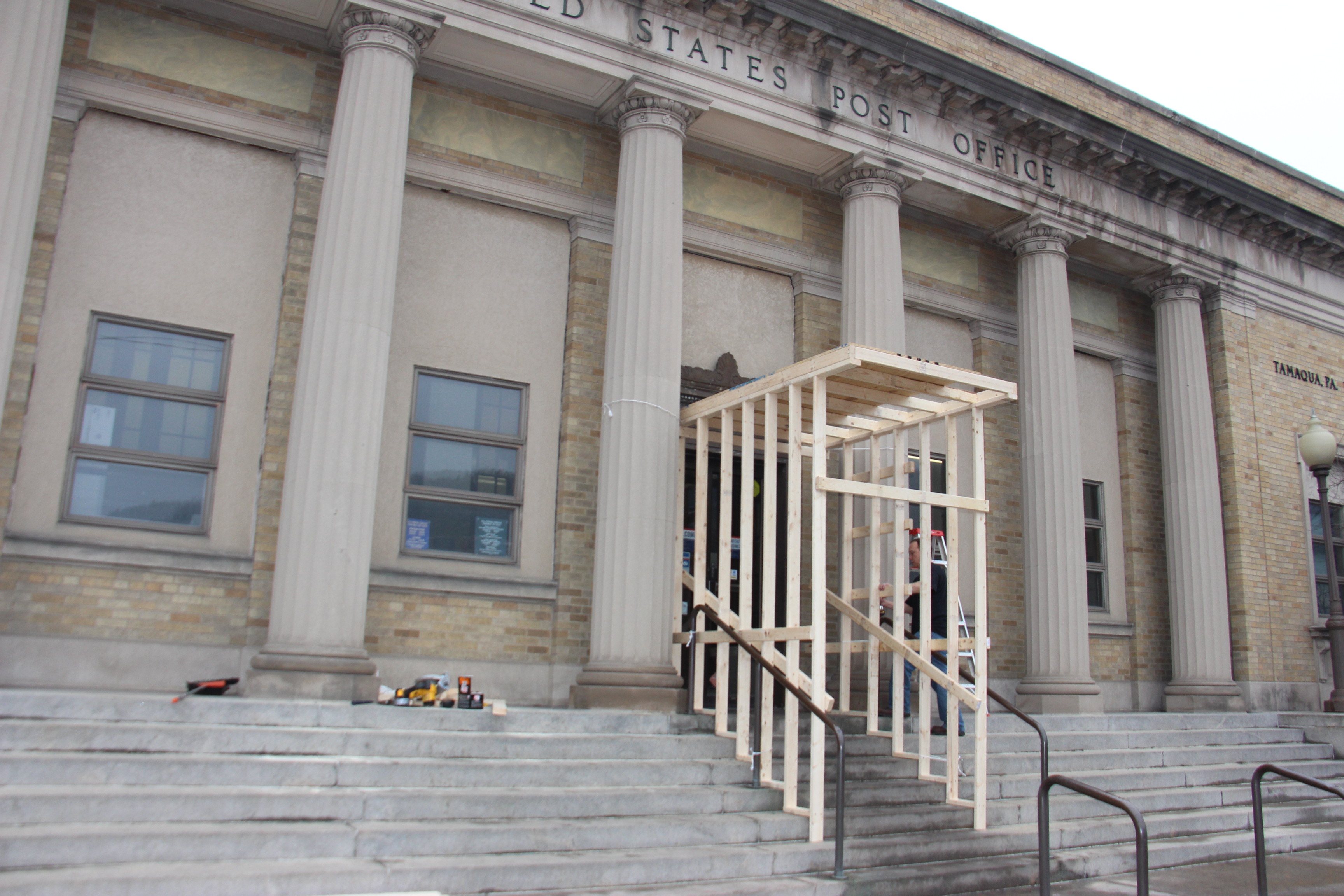 If you’ve driven past the Post Office in Tamaqua recently, you’ve probably noticed a wooden structure over the entry steps to the building. Sorensen Gross Construction Services was contracted to build the temporary structure on March 29, 2015 after someone noticed a small piece of the building’s upper façade on the steps.