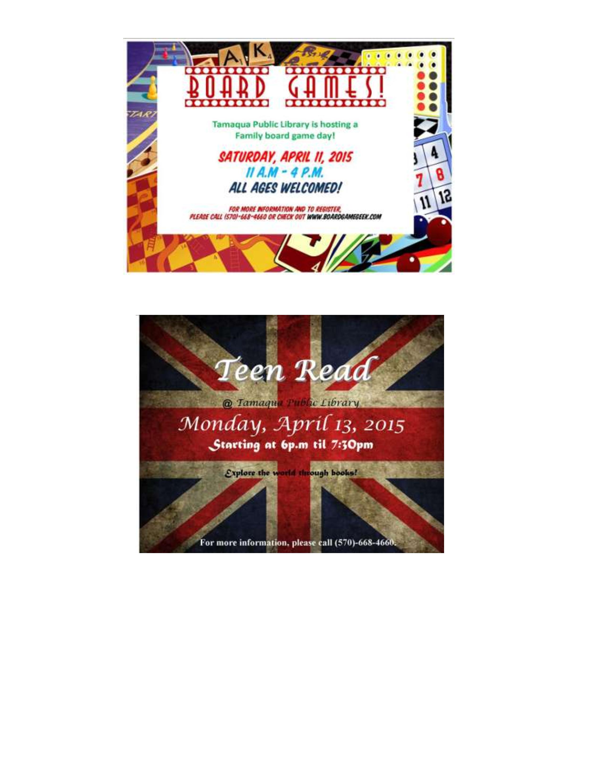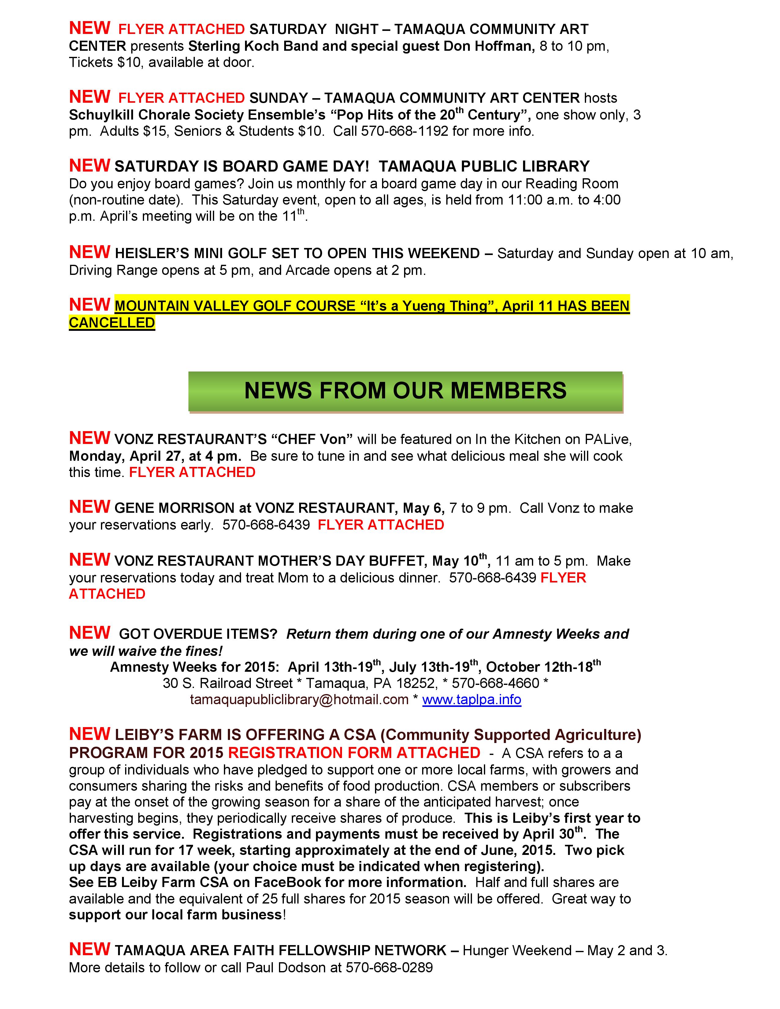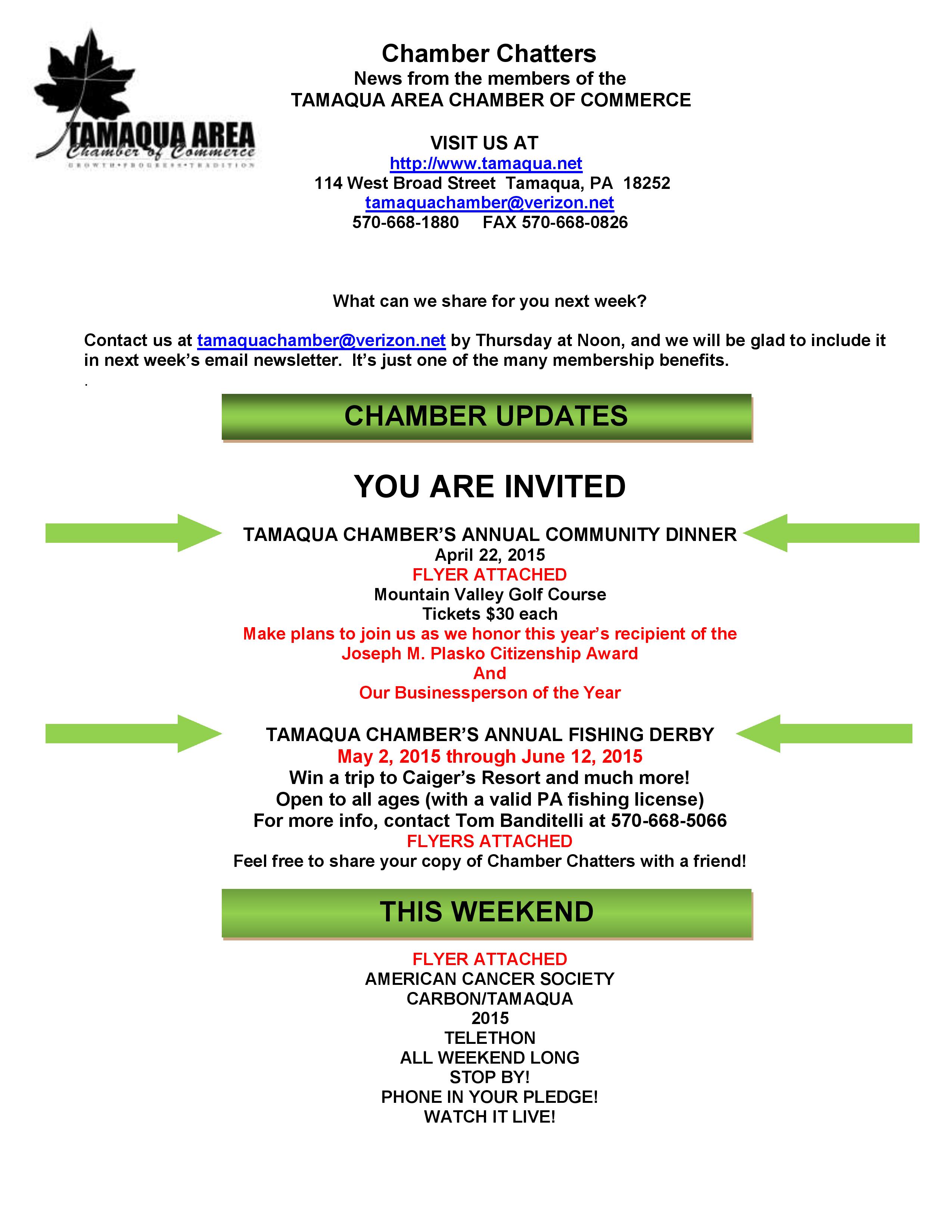 Here is the latest Tamaqua Area Chamber of Commerce’s Chamber Chatters newsletter dated Friday, April 10, 2015.