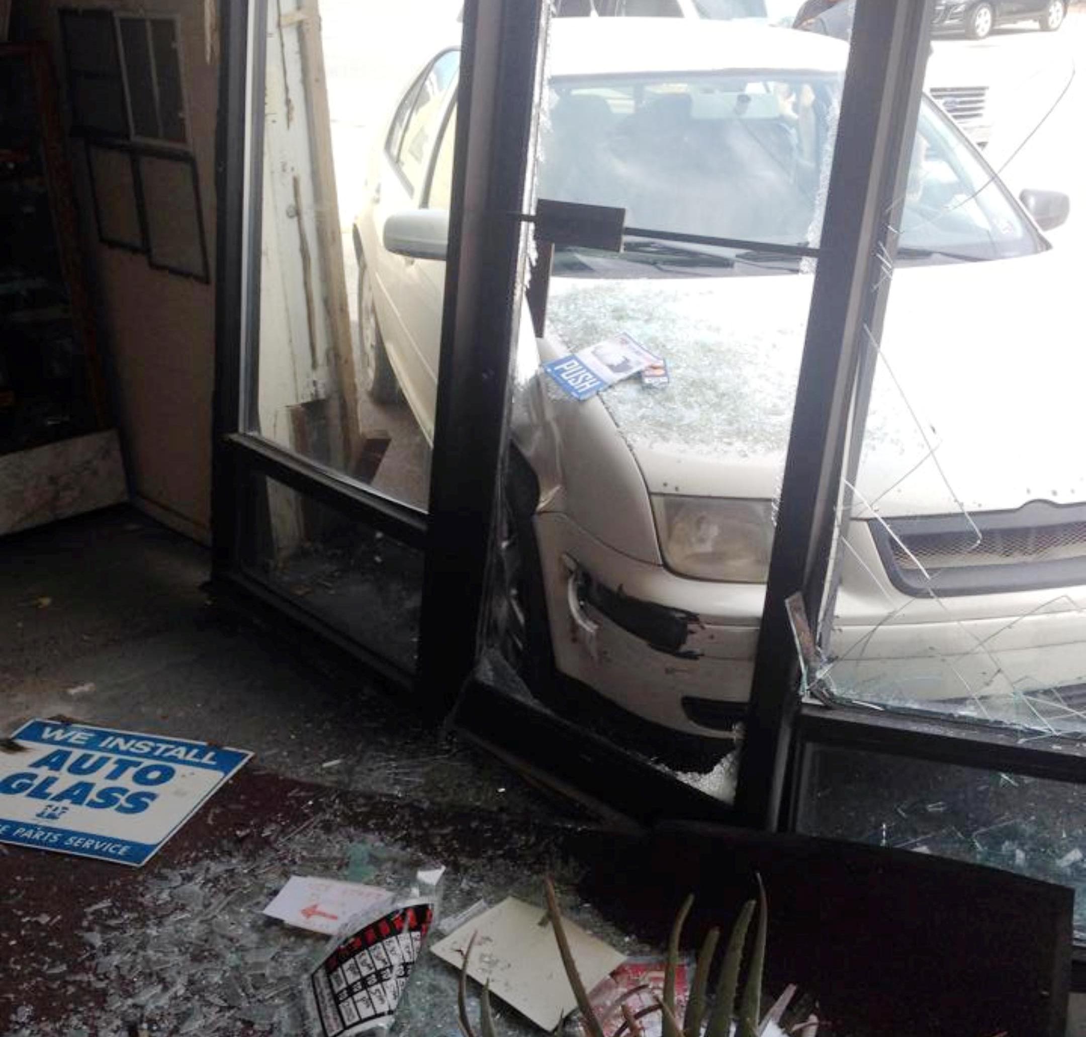 Despite his brave attempt to stop the vehicle, the Volkswagen, traveling about 5-7 miles per hour, smashed into the front of the store and partially into the waiting room.