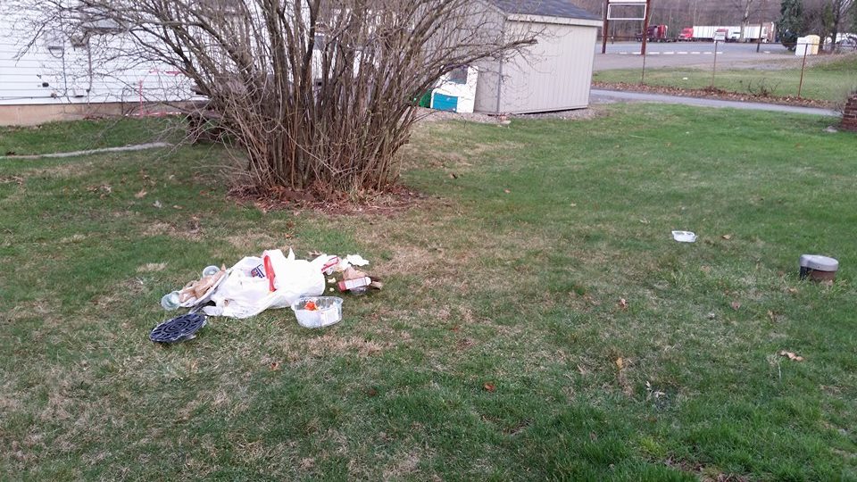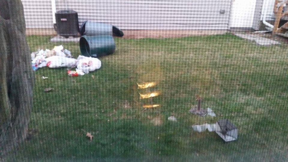 With the start of spring, bears and other hibernating animals have started to roam again. Pictured this morning (Thursday, April 16, 2015) in the backyard of a Hometown property along Claremont Avenue are overturned garbage cans and a broken bird feeder.