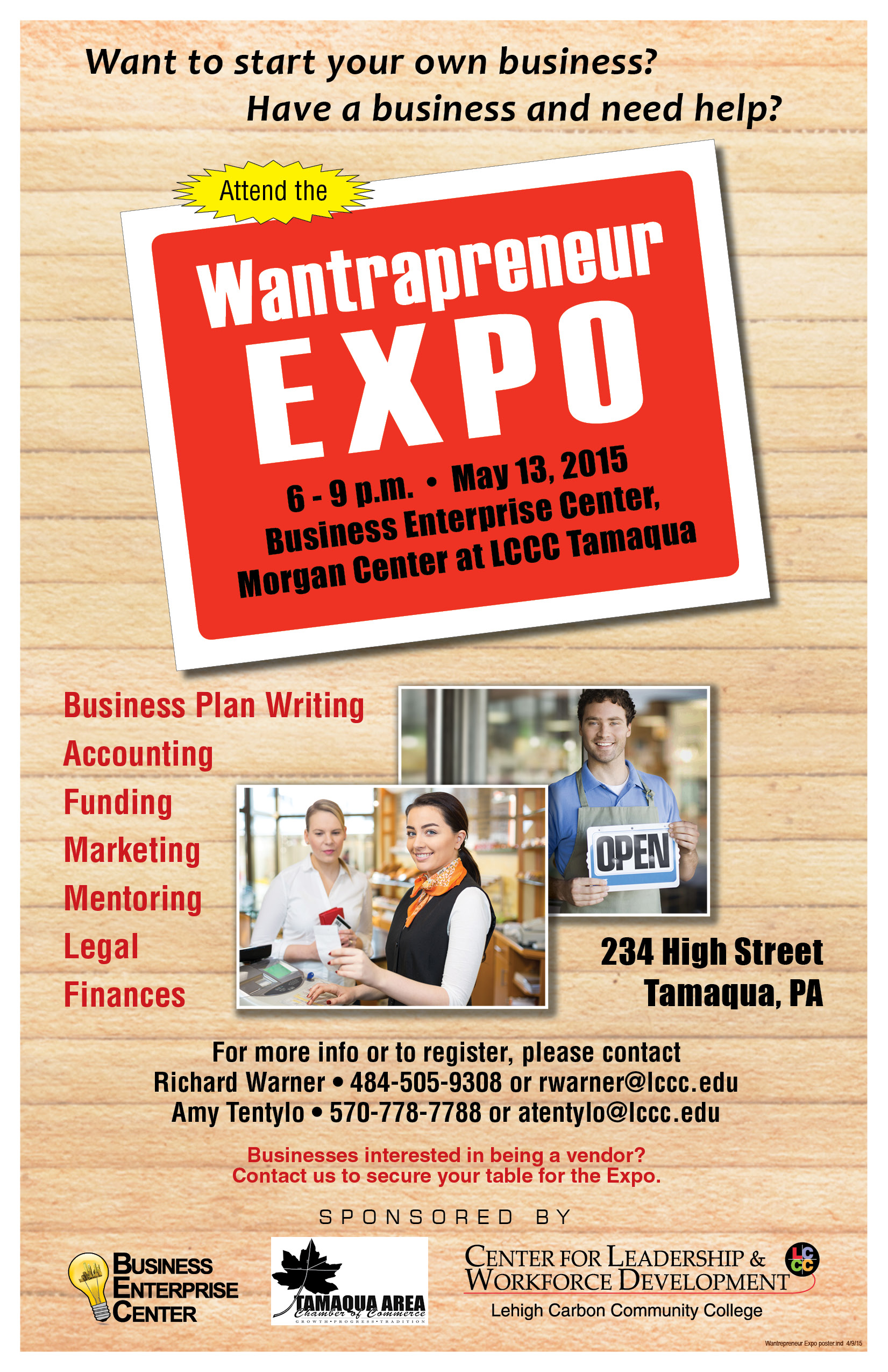 The Tamaqua Area Chamber of Commerce, Lehigh Carbon Community College Center for Leadership & Workforce Development, and the Business Enterprise Center are sponsoring a “Wantrapeneur Expo” to be held on May 13, 2015 at the Business Enterprise Center located at 234 High Street, Tamaqua, from 6 PM to 9 PM.
